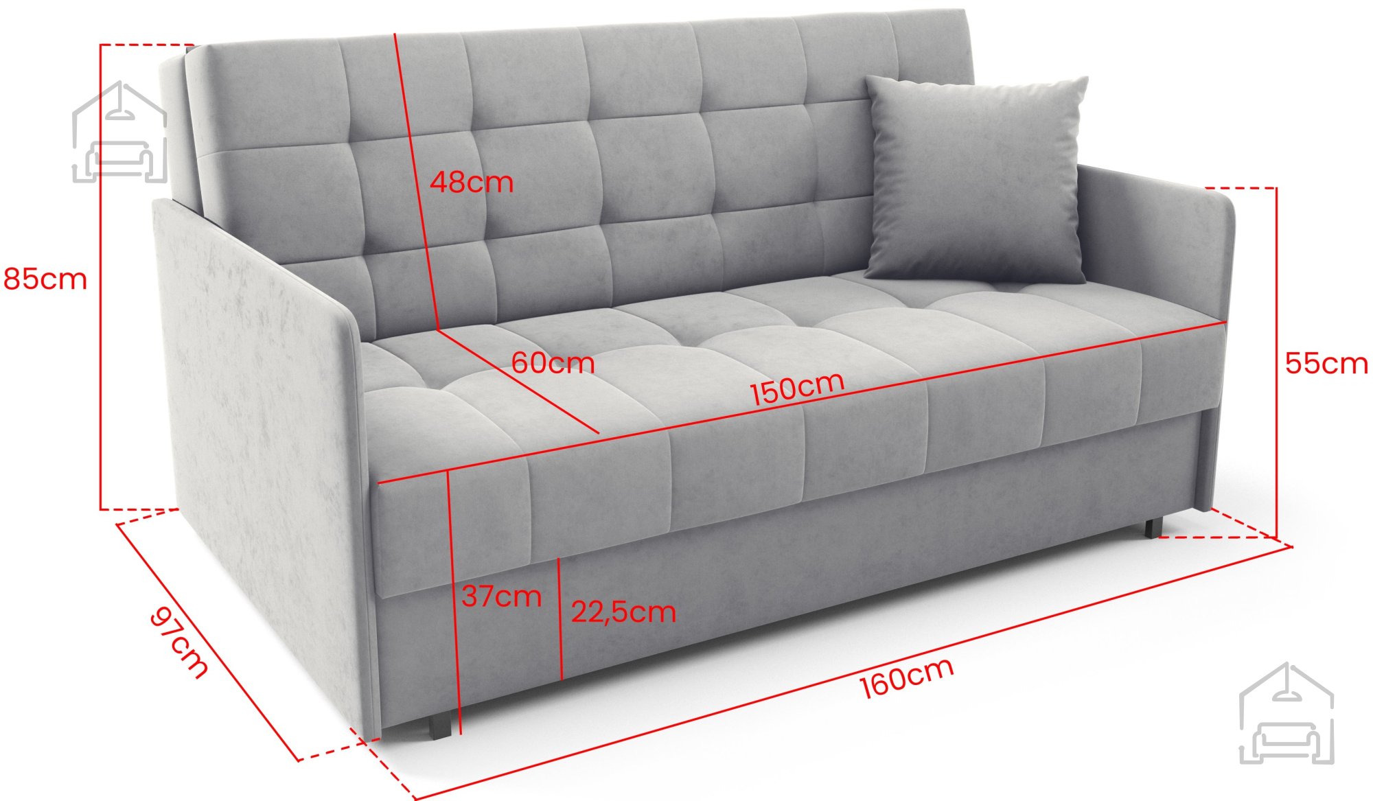Ein besonderer Vorteil dieses Modells ist seine kompakte Breite von 160 cm, die eine Platzierung auch in kleineren Räumen ermöglicht, ohne dass der Raum beengt wirkt. Mit einer Höhe von 85 cm und einer Tiefe von 97 cm behält das Sofa ausgewogene Proportionen und wirkt modern und elegant.