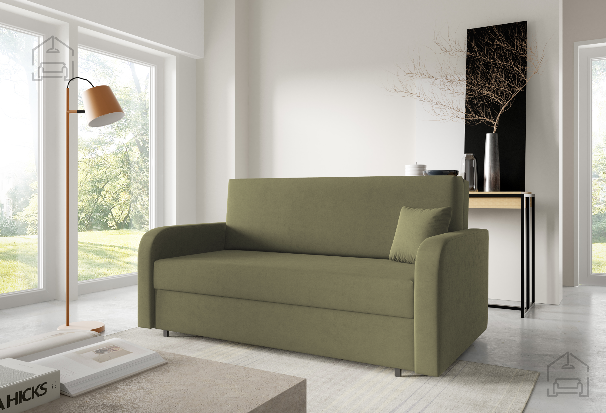 Das Gestell des Sofas besteht aus Holz, was Stabilität und Langlebigkeit garantiert. Die Sitzfläche ist mit einer Schicht hochwertiger Schaumstoffpolsterung und einem Wave Spring-Federkern ausgestattet, die gemeinsam für optimale Körperunterstützung sorgen. Diese Materialkombination schafft ein ausgewogenes Verhältnis zwischen Weichheit und Strapazierfähigkeit – so sitzt man bequem und schläft erholsam. Das Sofa hat eine maximale Belastbarkeit von 125 kg und eignet sich damit bestens für den Alltag in Haushalten jeder Größe.