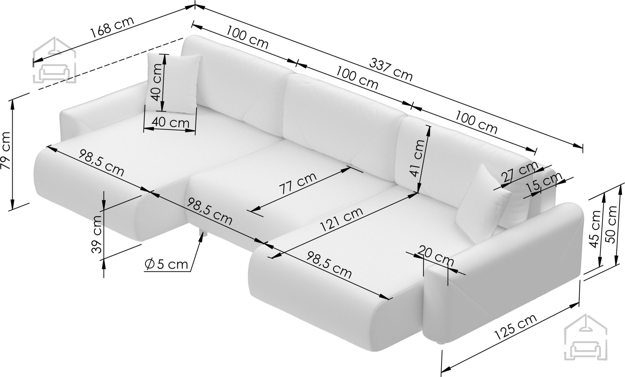 Die Sitzhöhe von 39 cm sorgt für bequemes Sitzen und eine natürliche Beinhaltung, während die Armlehnenhöhe von 50 cm angenehme Unterstützung und Entspannung bietet. Durch das durchdachte U-Design gibt es reichlich Platz für mehrere Personen – perfekt als Mittelpunkt für gemeinsame Abende oder gemütliche Familienrunden.