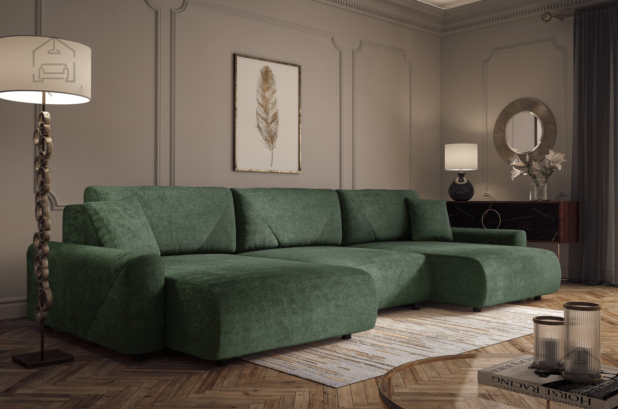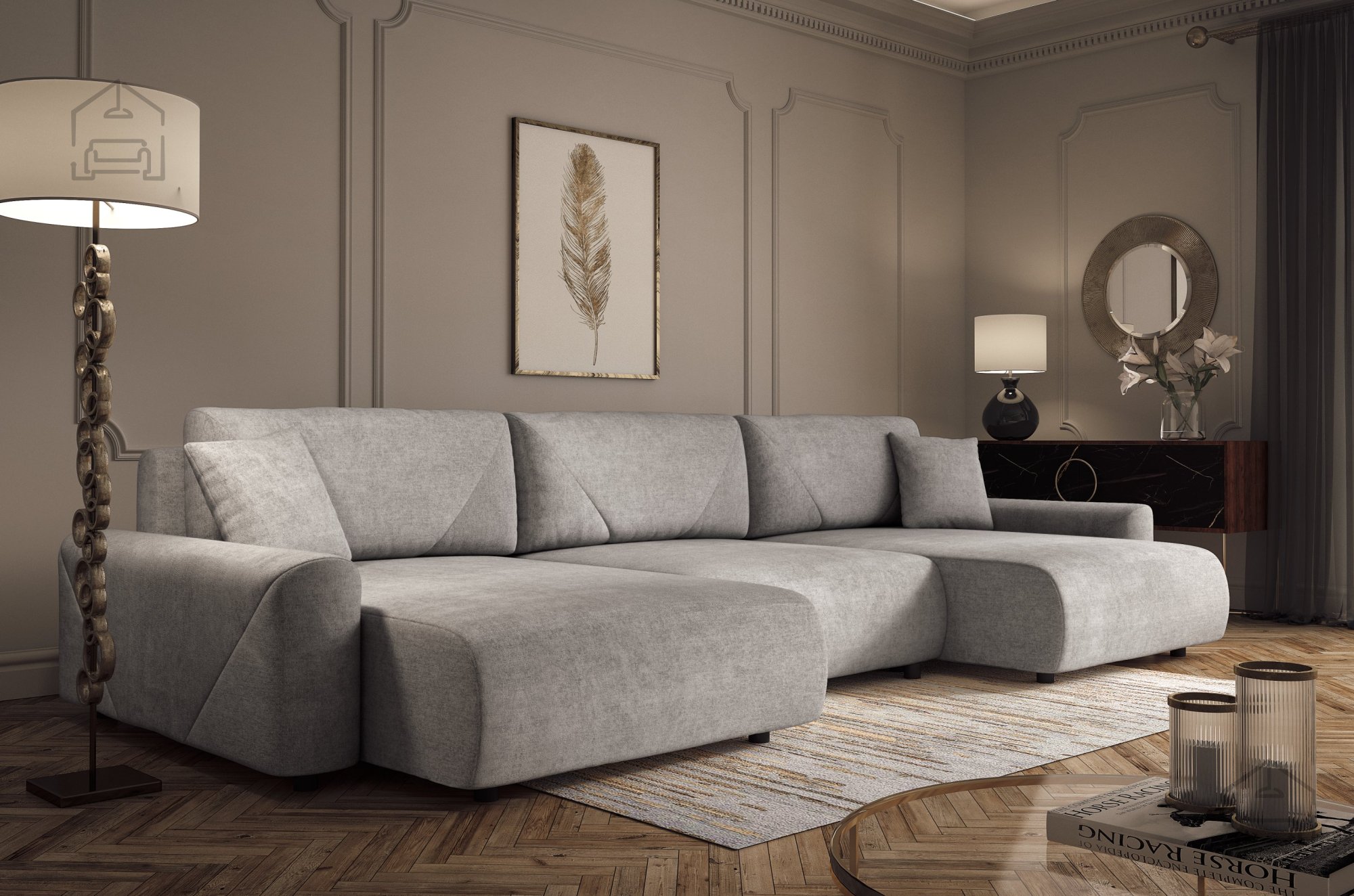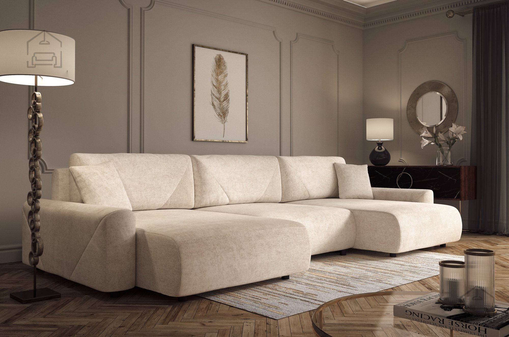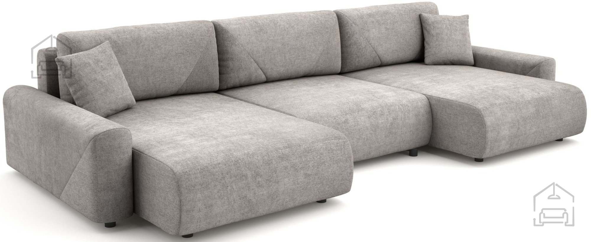 Die Wohnlandschaft Rima in U-Form – Dolmar ist eine großzügige und praktische Lösung für moderne Wohnzimmer, in denen Komfort und Design im Mittelpunkt stehen. Mit ihren Außenmaßen von 337x168x79 cm passt sie ideal in größere Räume und bietet ausreichend Platz zum Entspannen oder gemütlichen Beisammensein. Dank des Euro-Mechanismus lässt sich das Sofa im Handumdrehen in ein bequemes Bett verwandeln – eine funktionale Wahl für jedes Zuhause.