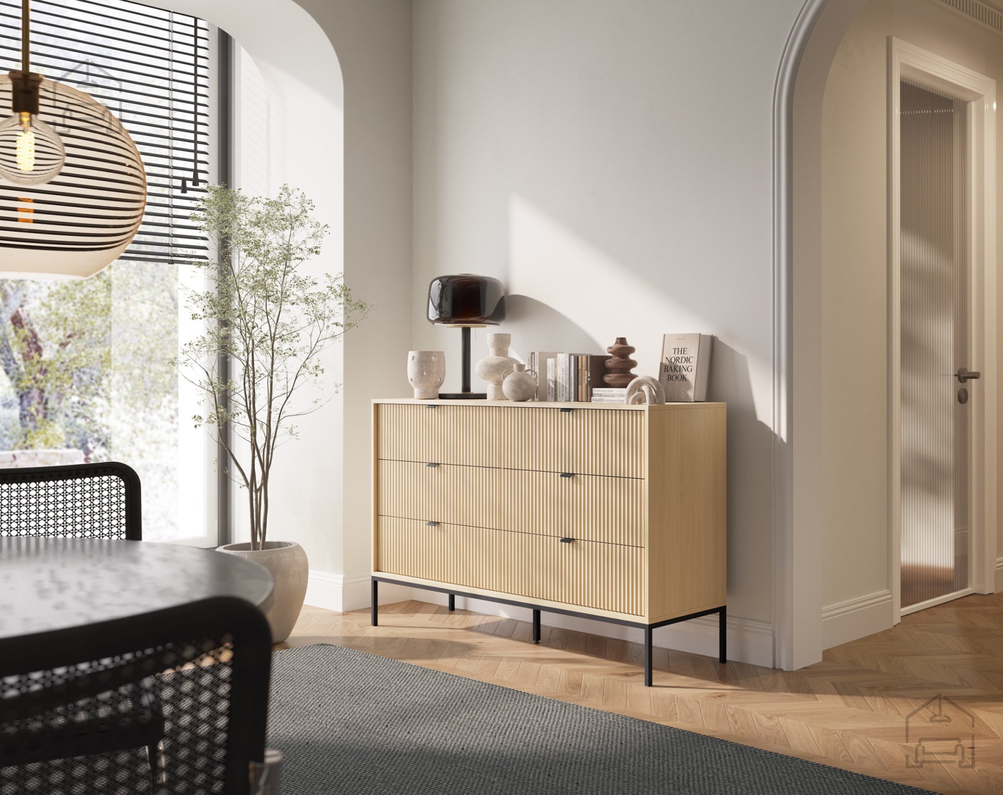 Der polnische Hersteller Piaski ist bekannt für präzise Verarbeitung und hochwertige Materialien. Die 16 mm starke laminierte Platte bietet Robustheit und Stabilität, bleibt dabei aber angenehm leicht, was das Umstellen der Möbel erleichtert. ABS-Kanten schützen zusätzlich vor Stößen und Feuchtigkeit – besonders praktisch in Haushalten mit Kindern oder Haustieren. Die Metallfüße garantieren Stabilität auch auf weicheren Bodenbelägen wie Teppichen oder Vinyl und ermöglichen eine unkomplizierte Reinigung unter den Möbeln.