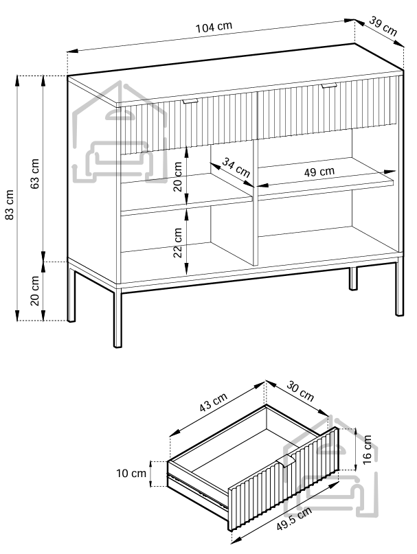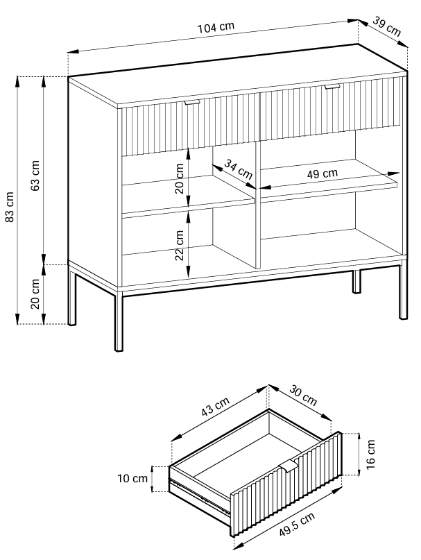 Die Kommode hat die Maße 104 × 39 × 83 cm – ein ideales Verhältnis von Stauraum und kompakter Größe. Durch ihre durchdachte Höhe und Breite lässt sie sich wunderbar mit vorhandenen Möbeln im Wohn-, Schlaf- oder Vorzimmer kombinieren. Die obere Ablagefläche bietet Platz für Dekorationen wie Bilderrahmen, Vasen oder Lampen, während der Innenraum praktischen Stauraum für Kleidung, Unterlagen oder Haushaltsutensilien bereithält.