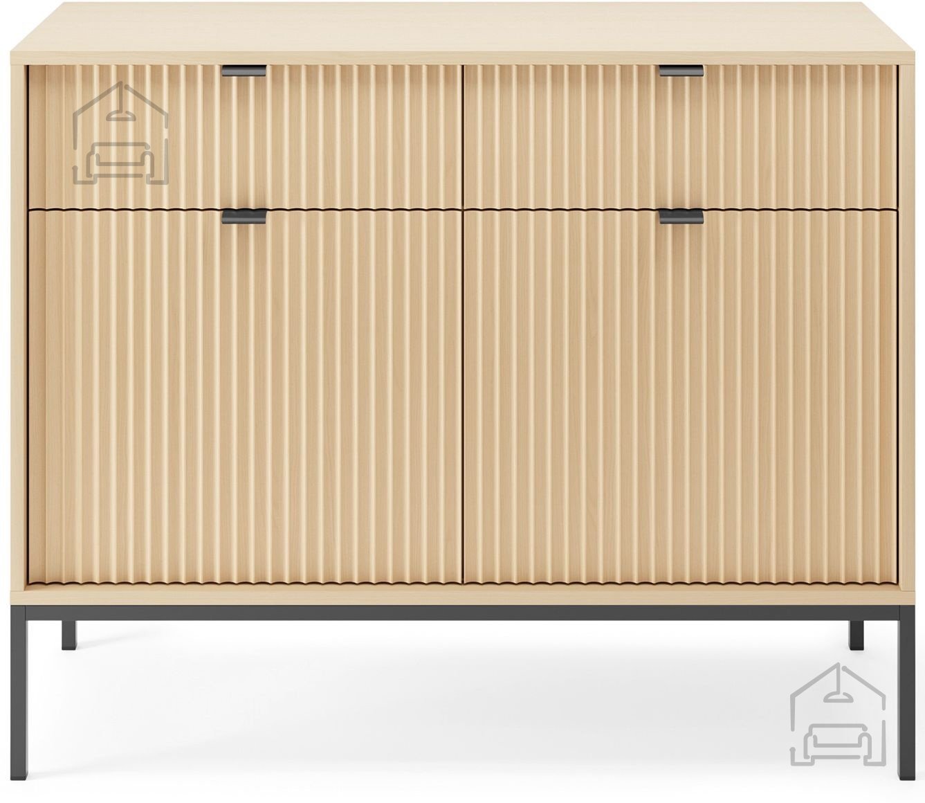 Ein besonderes Merkmal dieser Kommode sind die Metallgriffe und -beine, die einen dezenten industriellen Akzent setzen. Die schwarzen Griffe bilden einen eleganten Kontrast zum helleren Eichenton und liegen angenehm in der Hand beim Öffnen von Türen oder Laden. Die Metallbeine sind – je nach gewählter Variante – in Schwarz oder Gold erhältlich, sodass sich die Kommode perfekt an den Stil Ihres Raumes anpassen lässt. Das stabile Metallgestell sorgt zudem für eine robuste Konstruktion und erleichtert das Reinigen des Bodens darunter.