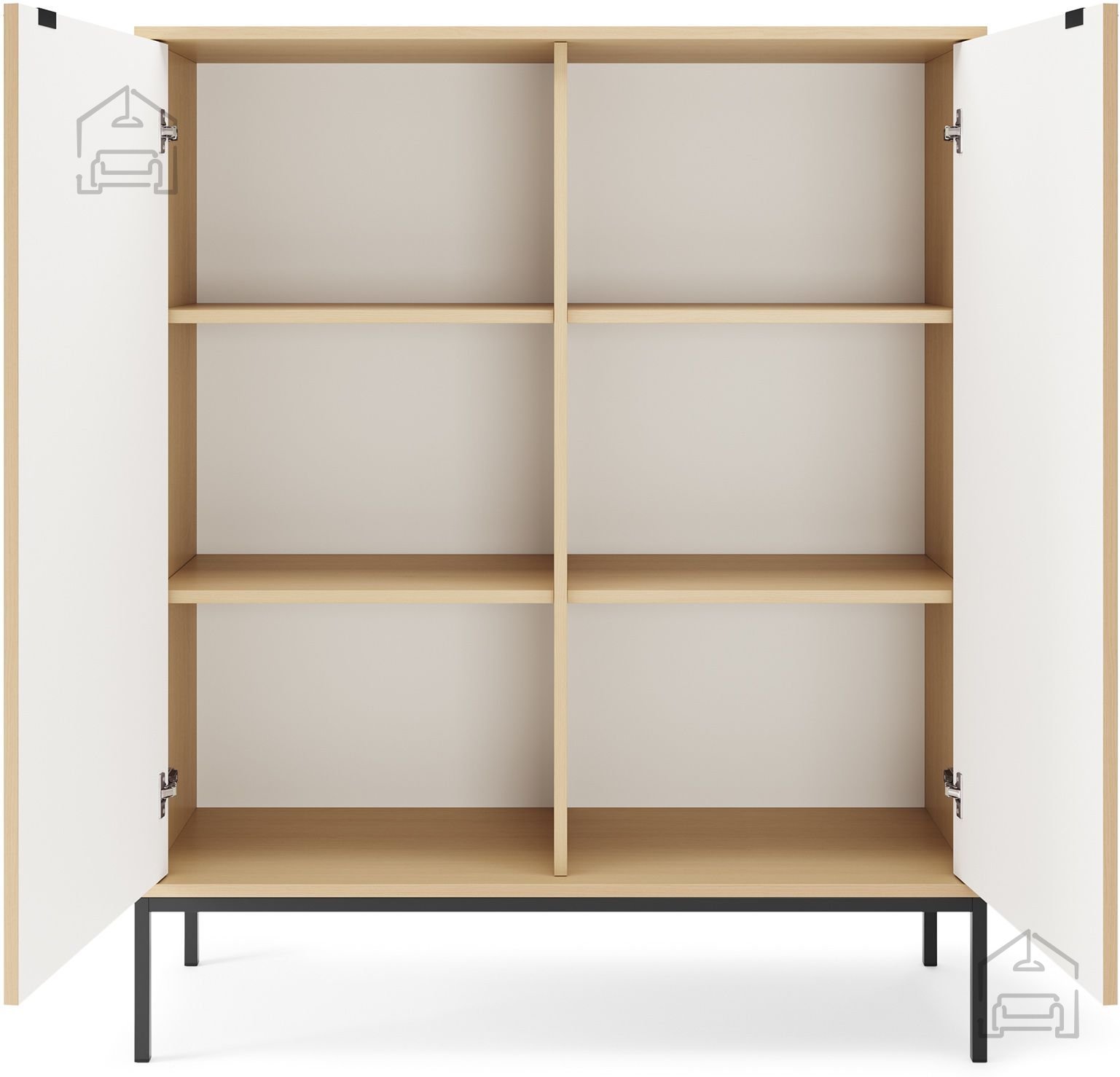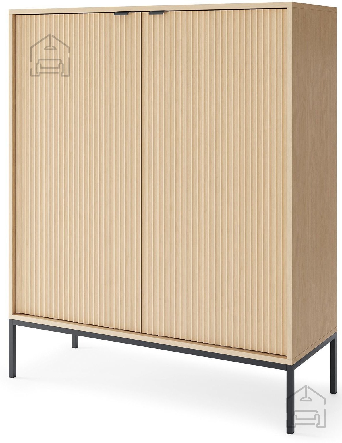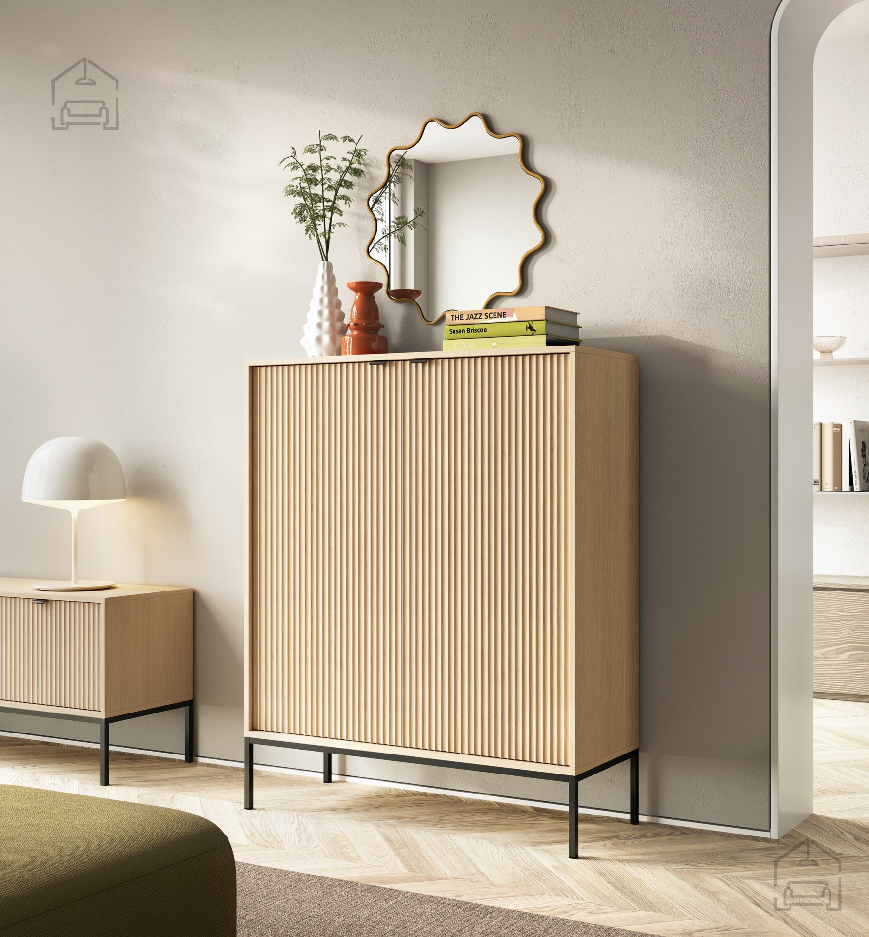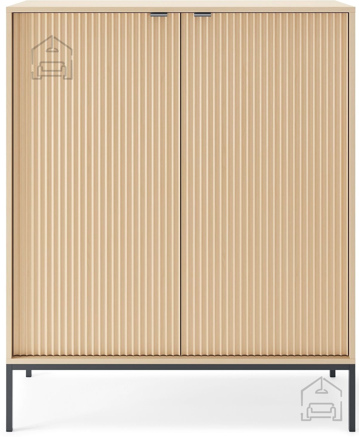 Ein charakteristisches Merkmal der Kommode Nova K104 sind ihre Metallgriffe in elegantem Schwarz. Sie sind nicht nur praktisch, sondern setzen auch dekorative Akzente, die perfekt zu den Füßen passen. Die Füße bestehen ebenfalls aus Metall und sind in zwei Varianten erhältlich – schwarz oder goldfarben. So können Sie den Stil wählen, der am besten zu Ihrem Raum und persönlichen Geschmack passt.