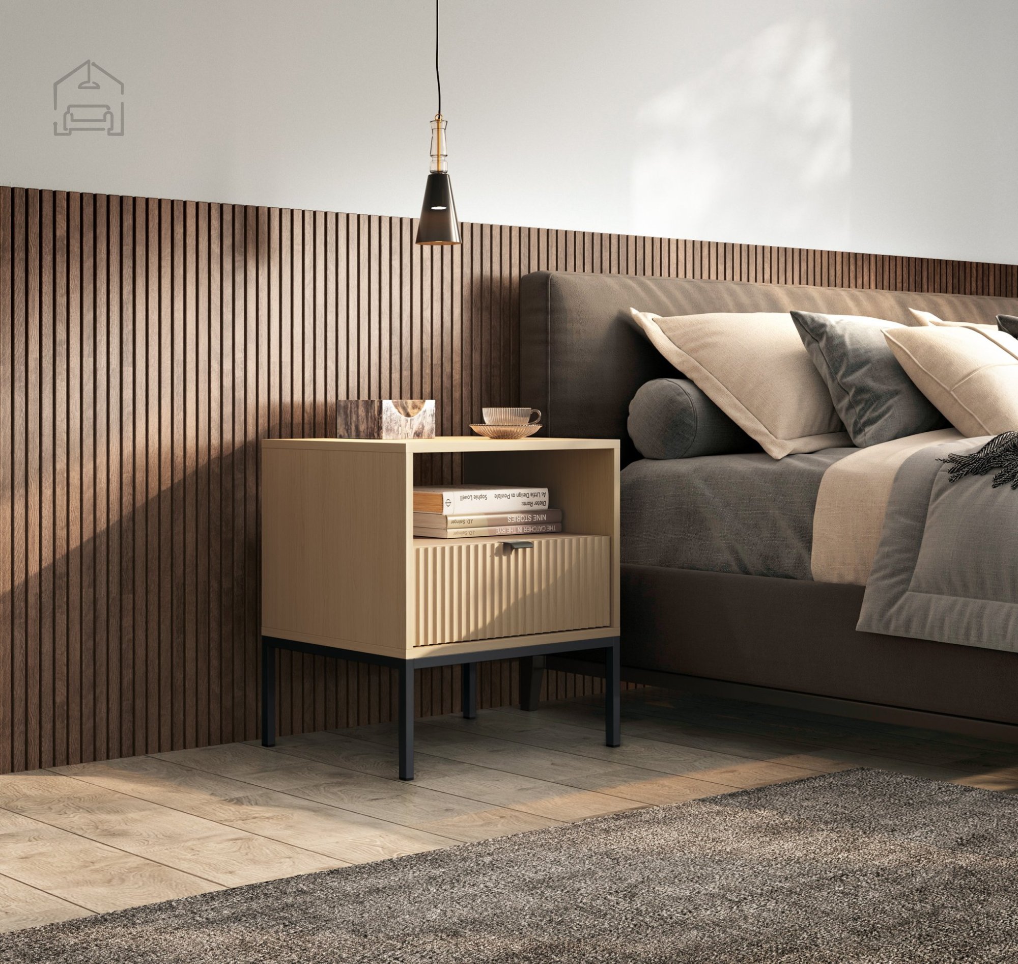 Der Nachttisch besteht aus einer 16 mm starken laminierten Spanplatte, die Stabilität und Widerstandsfähigkeit im täglichen Gebrauch gewährleistet. Ober- und Seitenteile sind so verarbeitet, dass sie die natürliche Holzstruktur nachbilden und dadurch eine warme, authentische Wirkung erzielen. Die Front besteht aus hochwertigem MDF, das eine präzise Kantenbearbeitung und eine glatte Oberfläche ermöglicht. Diese Materialkombination sorgt für Langlebigkeit und eine unkomplizierte Pflege.