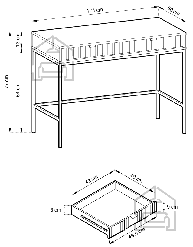Der Schminktisch hat die Maße 104 × 50 × 77 cm. Diese Größe bietet ausreichend Platz für Kosmetik, Spiegel und Accessoires, ohne dabei zu viel Raum einzunehmen. Dank seiner kompakten Form passt er auch hervorragend in kleinere Zimmer, wo jeder Zentimeter zählt. Mit einer Höhe von 77 cm ist er ergonomisch auf bequemes Sitzen abgestimmt – egal, ob mit Stuhl oder Hocker – und sorgt so für zusätzlichen Komfort im Alltag.
