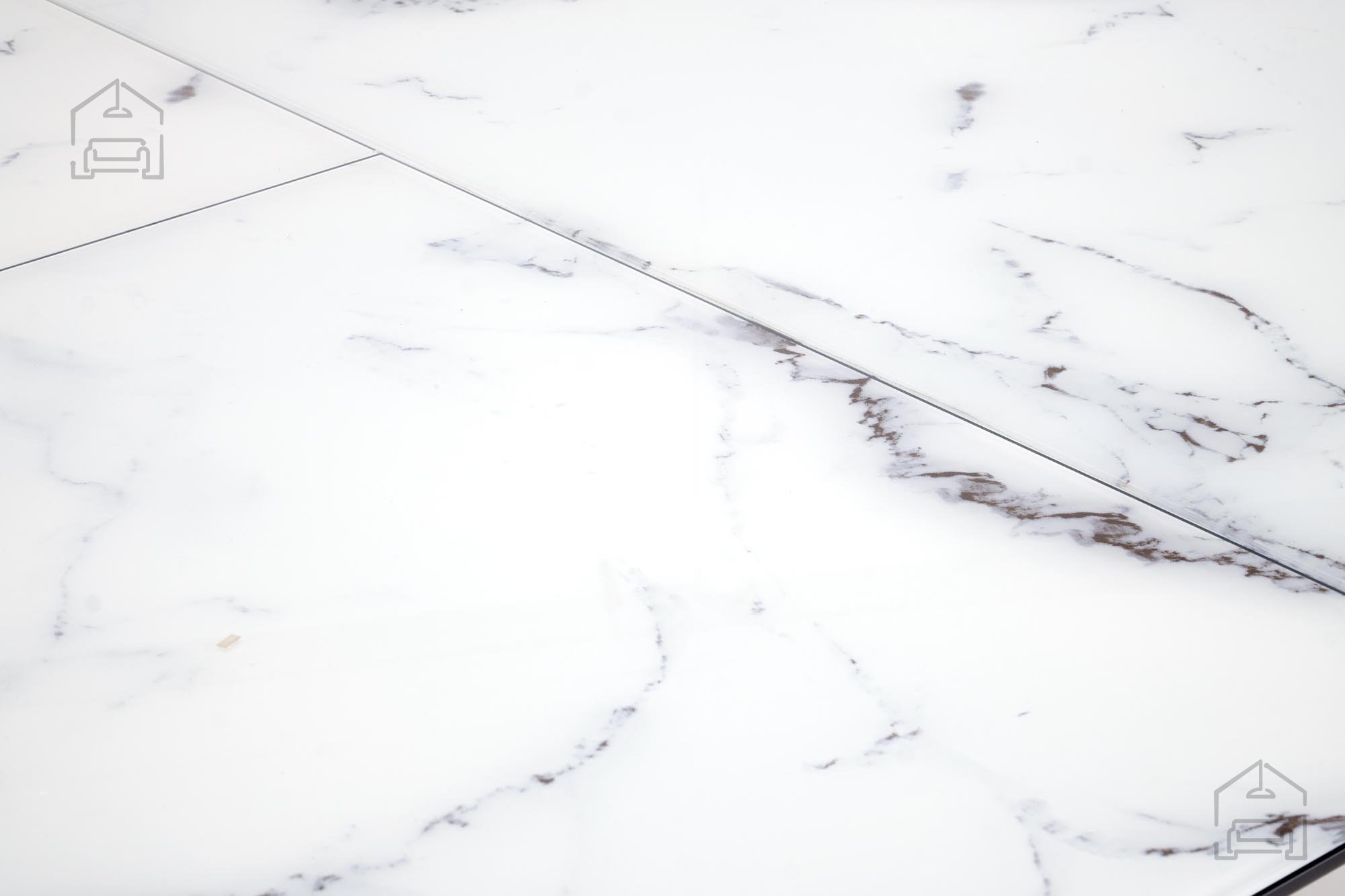 Die Tischplatte in weißer Marmoroptik ist eines der auffälligsten Gestaltungselemente des Vertigo-Tisches. Das feine Marmor-Muster bringt natürliche Eleganz und Helligkeit in den Raum und harmoniert wunderbar mit verschiedensten Einrichtungsstilen – von modern-minimalistisch bis klassisch. Die schwarzen Metallbeine setzen einen stilvollen Kontrast, der die klaren Linien des Tisches betont und für visuelle Ausgewogenheit sorgt. Diese Farbkombination lässt sich problemlos mit unterschiedlichen Stühlen und Accessoires kombinieren.