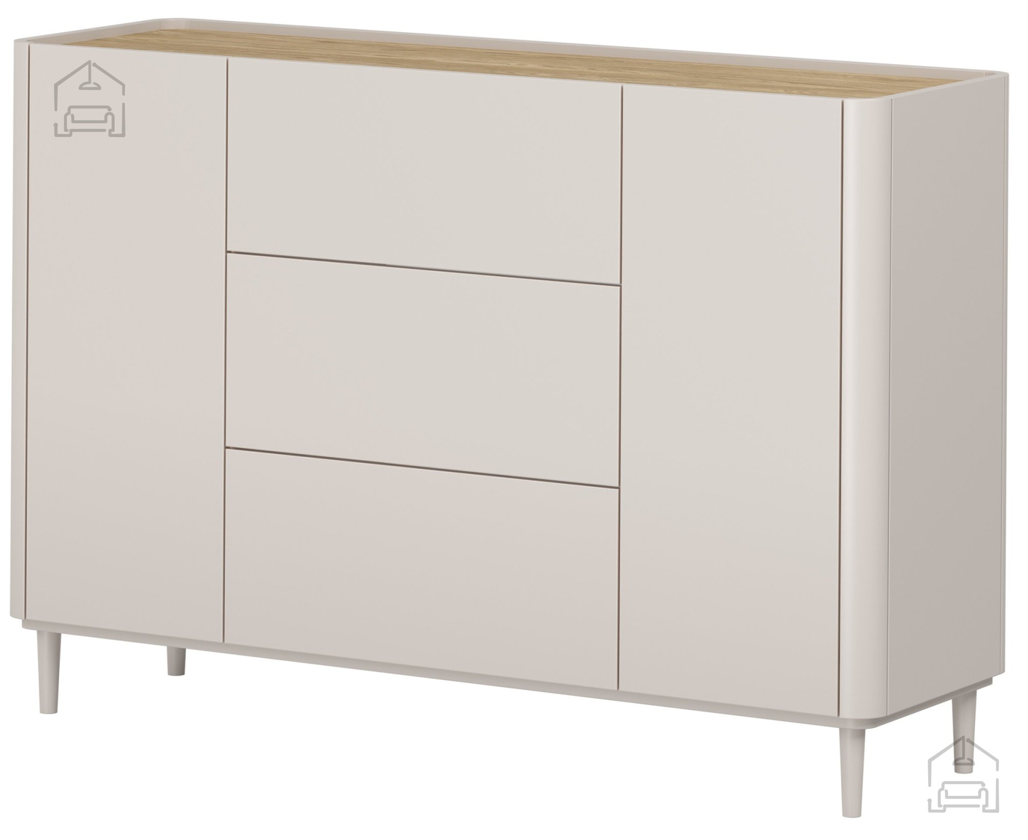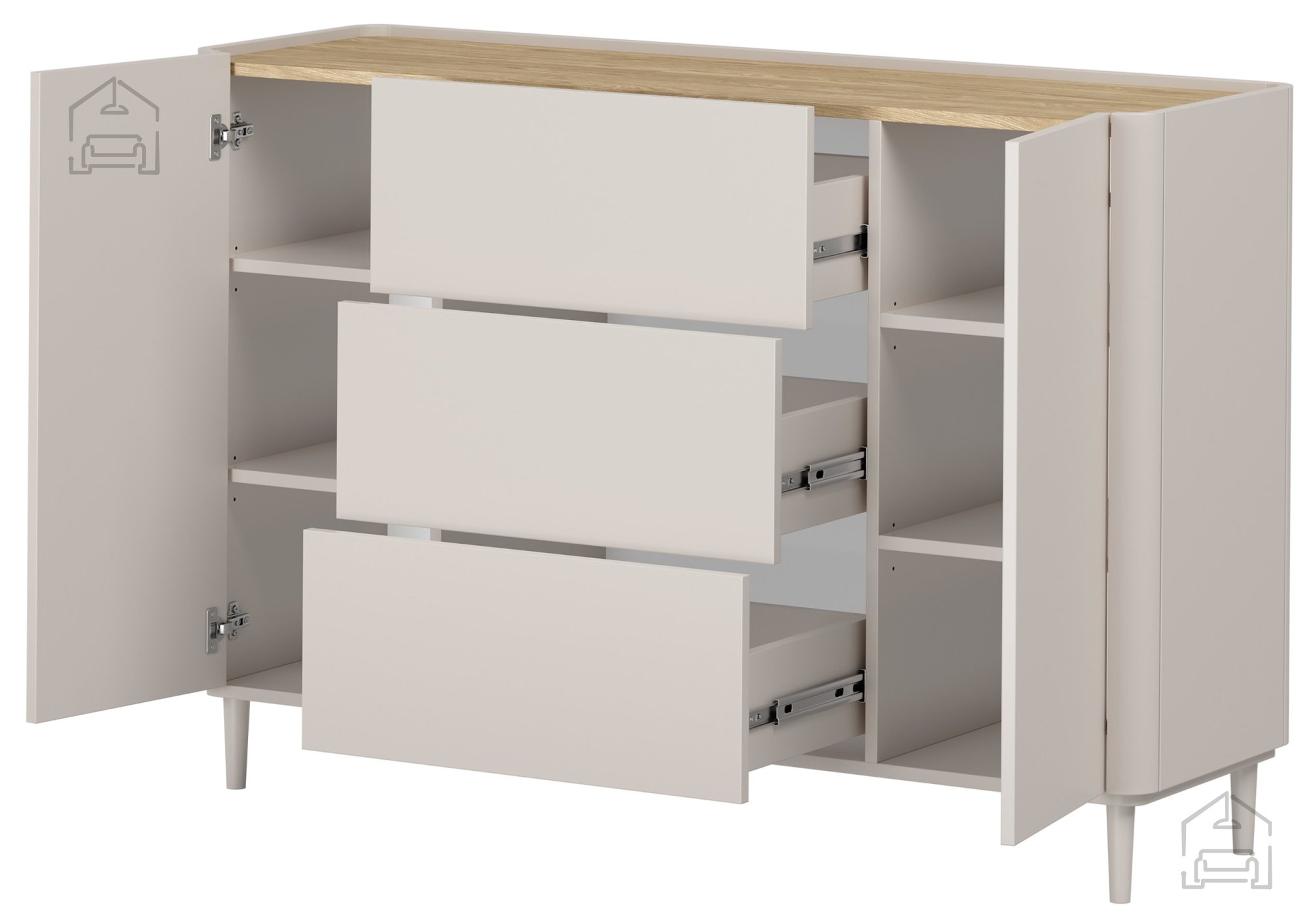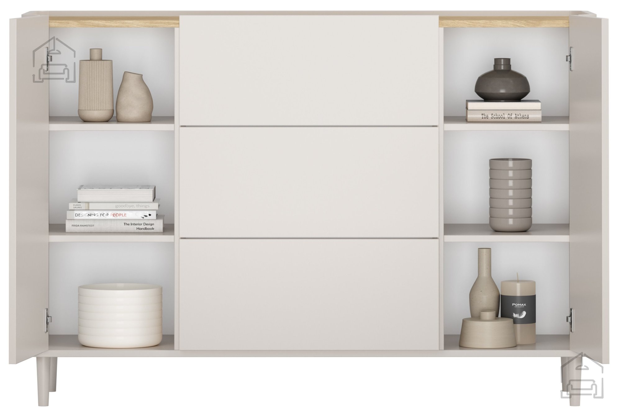 Die Kommode Elivo 150 2D3SZ mit Beinen in der Farbkombination Kaschmir und geölte Eiche vereint modernes Design, praktische Funktionalität und hochwertige Verarbeitung. Ihre ausgewogene, matte Optik ohne Griffe passt perfekt zu aktuellen Einrichtungstrends und bewahrt gleichzeitig eine zeitlose Eleganz. Mit einer Höhe von 102 cm, einer Breite von 150 cm und einer Tiefe von 48 cm zählt sie zu den mittelgroßen Möbelstücken – geräumig genug für den Alltag, aber auch ideal für kleinere Räume. Sie eignet sich für Wohnzimmer, Schlafzimmer, Büro oder Esszimmer und kann dort schnell zum stilvollen Mittelpunkt des Raumes werden.