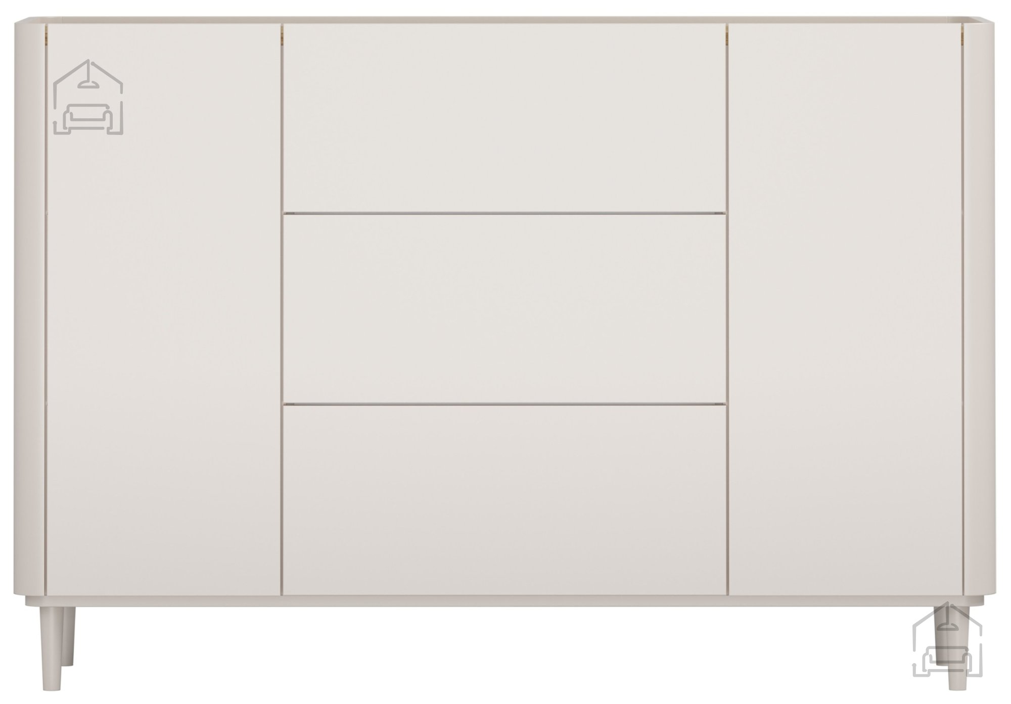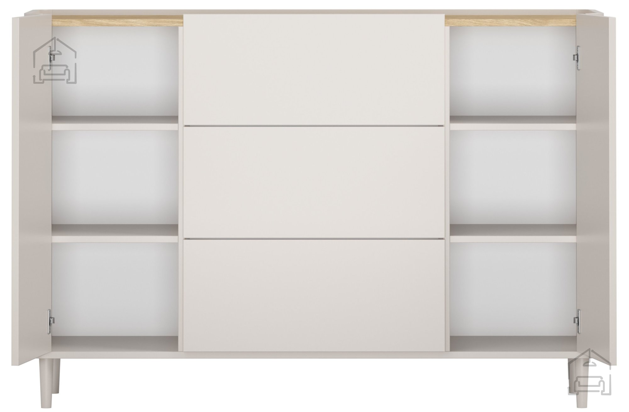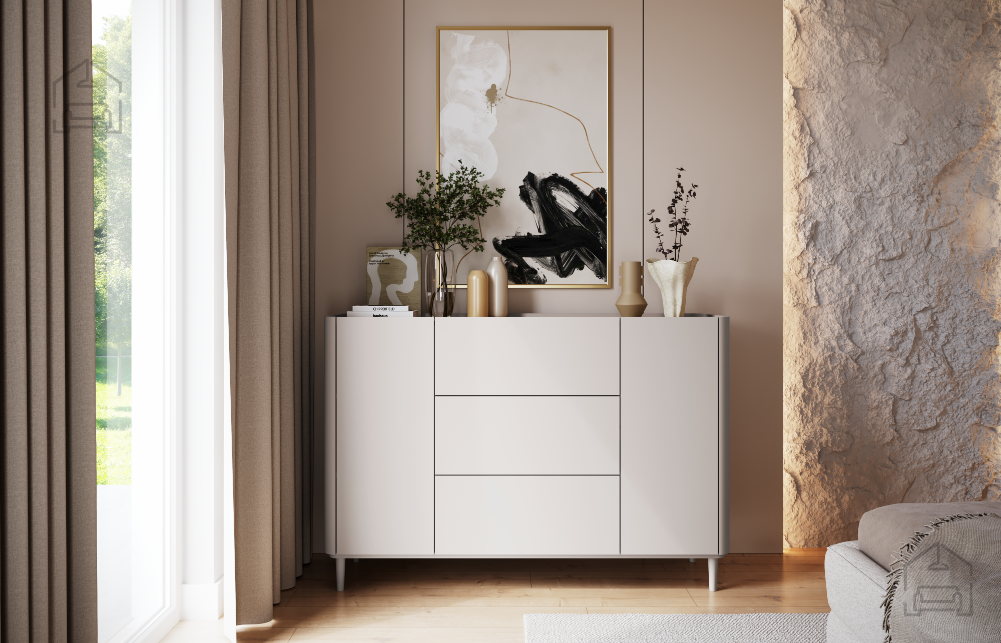 Die Kommode Elivo 150 2D3SZ mit Beinen in der Farbkombination Kaschmir und geölte Eiche vereint modernes Design, praktische Funktionalität und hochwertige Verarbeitung. Ihre ausgewogene, matte Optik ohne Griffe passt perfekt zu aktuellen Einrichtungstrends und bewahrt gleichzeitig eine zeitlose Eleganz. Mit einer Höhe von 102 cm, einer Breite von 150 cm und einer Tiefe von 48 cm zählt sie zu den mittelgroßen Möbelstücken – geräumig genug für den Alltag, aber auch ideal für kleinere Räume. Sie eignet sich für Wohnzimmer, Schlafzimmer, Büro oder Esszimmer und kann dort schnell zum stilvollen Mittelpunkt des Raumes werden.