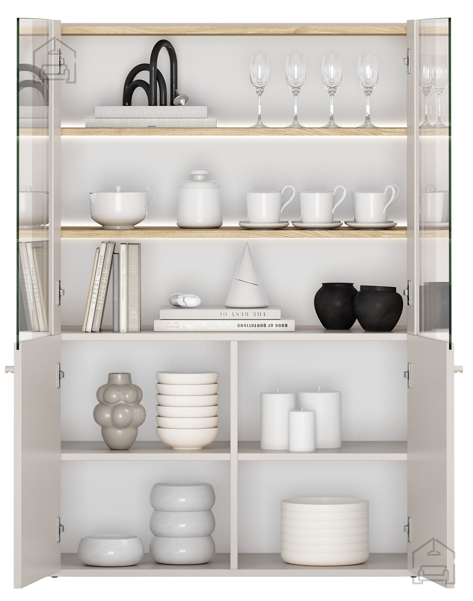 Im Inneren bietet die Vitrine Platz für dekorative Objekte ebenso wie für Alltagsgegenstände – von Gläsern, Porzellan und Büchern bis hin zu Souvenirs oder persönlichen Accessoires. Durch die durchdachte Anordnung der Regalböden bleibt alles übersichtlich und ordentlich verstaut.