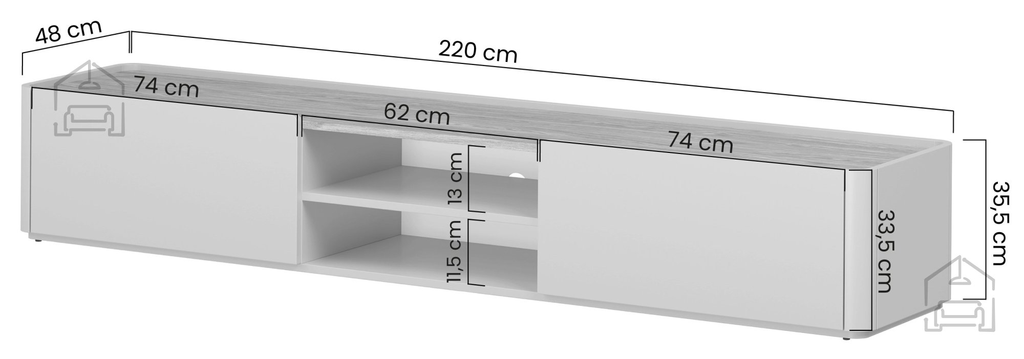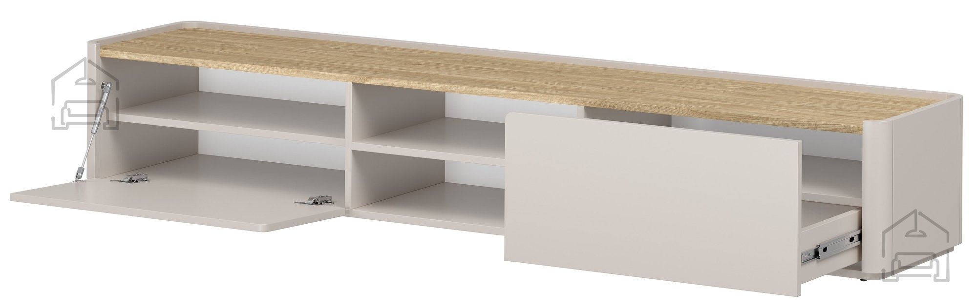 Mit den Maßen 220 × 48 × 35,5 cm bietet die TV-Kommode Elivo großzügigen Stauraum und gute Organisation. Die Aufteilung umfasst eine Schublade mit Soft-Close-Funktion, ein geräumiges Fach mit Tür sowie zwei offene Ablagen – perfekt für Receiver, Spielkonsolen oder Deko-Elemente. Das grifflose System sorgt für klare Linien und lässt sich durch sanften Druck bequem öffnen. Eine integrierte Kabelöffnung hilft, Anschlüsse ordentlich zu verstauen – für einen gepflegten TV-Bereich ohne sichtbare Kabel und Unordnung.