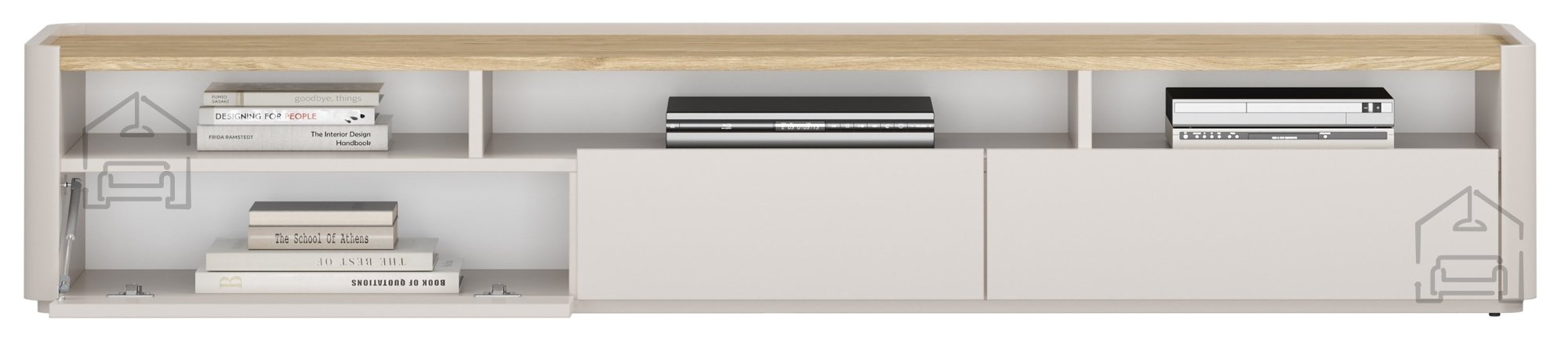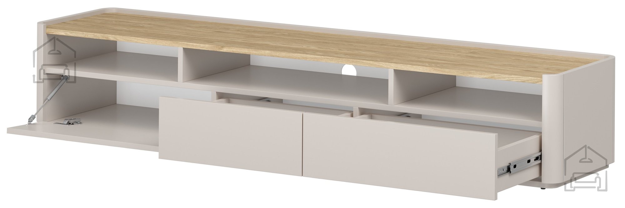 Die Kombination aus Cashmere und geölter Eiche verleiht der Kommode eine warme, zugleich moderne Wirkung. Der Fokus liegt auf einem puristischen Look ohne Griffe – Türen und Laden öffnen sich über das „Push-to-open“-System, das eine einfache und leise Bedienung ermöglicht. Die Kommode verfügt über ein geschlossenes Fach (1K) und zwei großzügige Schubladen (2SZ), ideal für geordnetes Verstauen von Multimedia-Geräten, Dokumenten oder Wohnzimmer-Accessoires.