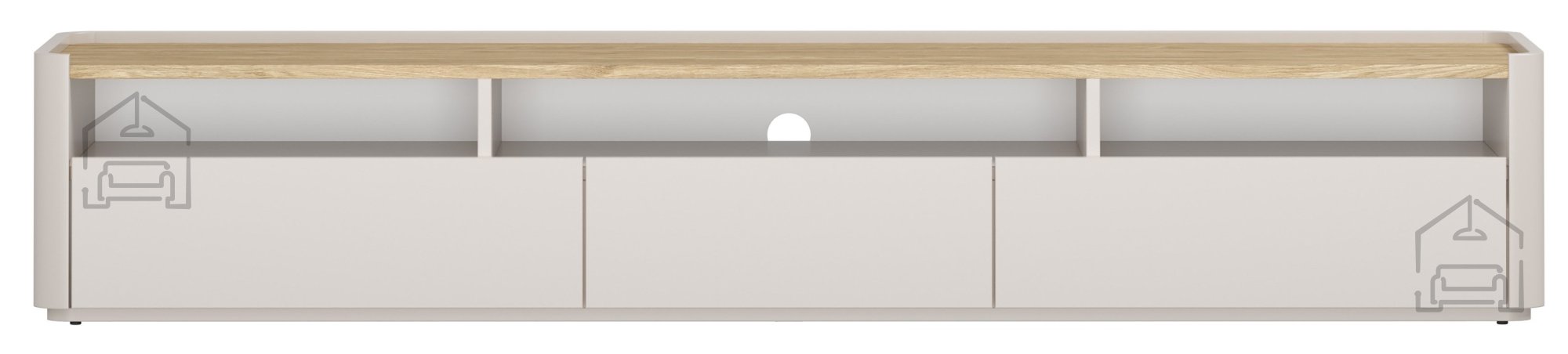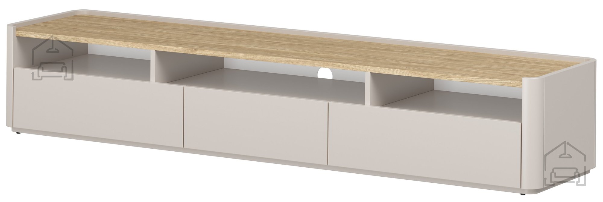 Die TV-Kommode Elivo 200 1K2SZ – Bogart ist ein elegantes und zugleich praktisches Möbelstück, das für moderne Wohnräume entworfen wurde, in denen sich Design und Funktionalität harmonisch ergänzen. Mit ihren Maßen von 200 × 48 × 35,5 cm bietet sie Platz für größere Fernseher und ausreichend Stauraum für Zubehör, Medien oder Dekoration. Die Oberfläche in Cashmere-Farbton mit einer Deckplatte in geölter Eiche sorgt für ein angenehmes Gleichgewicht zwischen der Wärme des Holzes und der modernen, hellen Farbwelt.