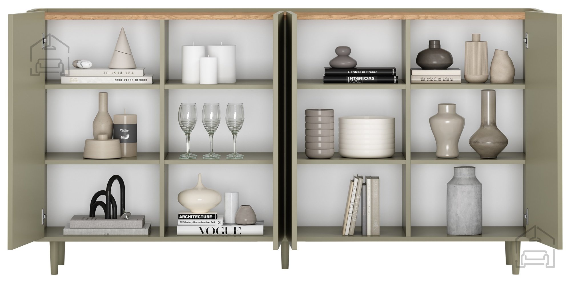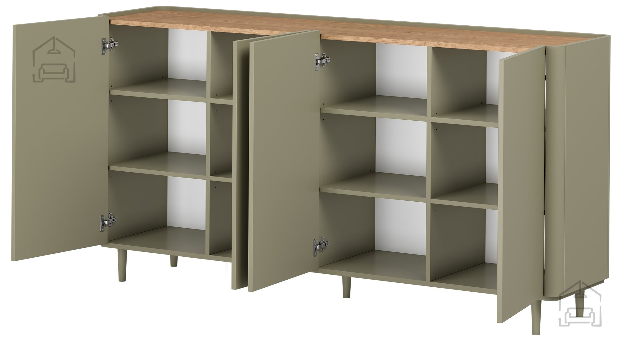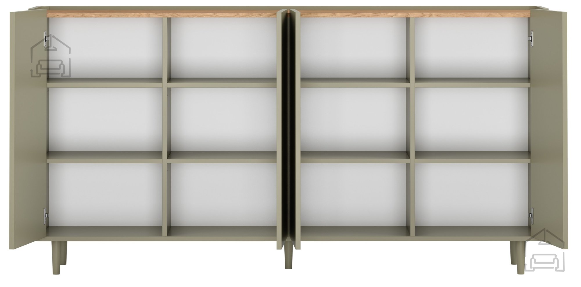 Das Innere der Kommode ist so gestaltet, dass der vorhandene Platz optimal genutzt wird. Sie umfasst 12 Fächer, zwei höhenverstellbare Einlegeböden mit dreistufiger Regulierung und vier Türen. Diese Aufteilung ermöglicht eine flexible Aufbewahrung unterschiedlichster Gegenstände – von Dokumenten und Textilien bis hin zu Geschirr oder Dekoration. Dank der durchdachten Struktur ist die Kommode vielseitig einsetzbar, etwa im Wohnzimmer, Essbereich, Büro oder Schlafzimmer.