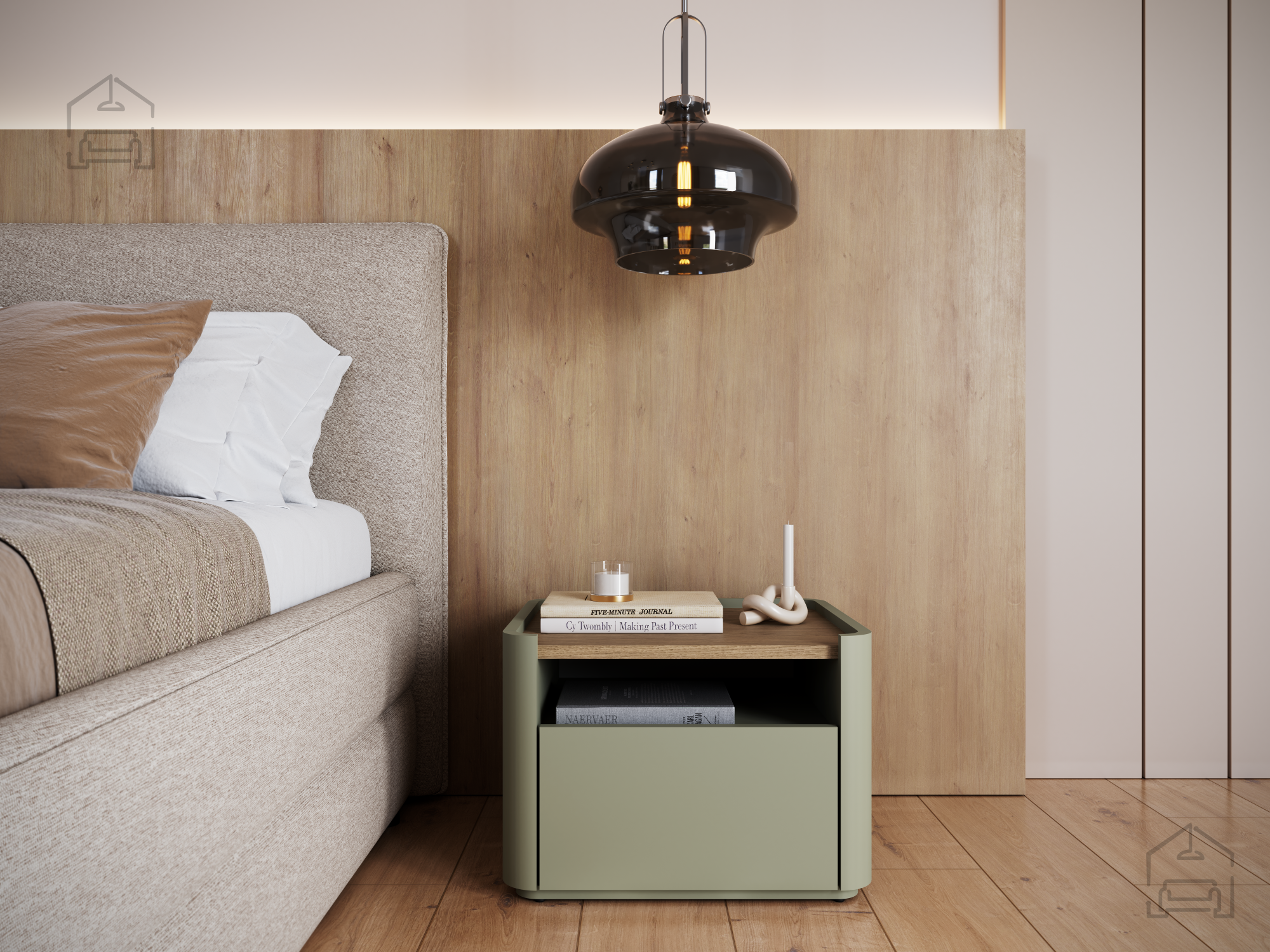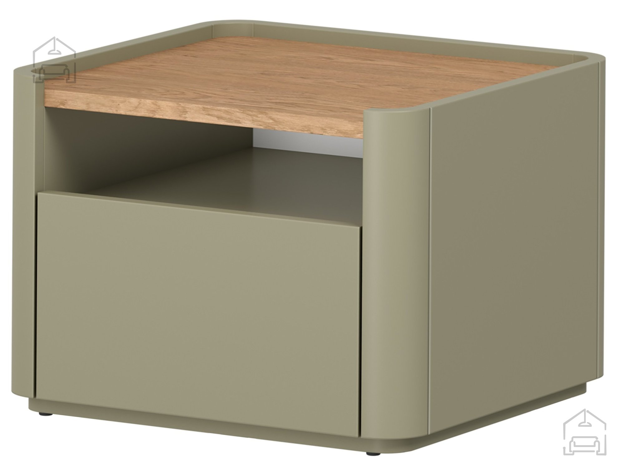 Charakteristisch für dieses Modell ist der Kontrast zwischen der Basisfarbe Eukalyptus und der oberen Platte in baltischer Dune-Eiche. Diese Kombination vermittelt ein Gefühl von natürlicher Helligkeit und Frische und harmoniert besonders gut mit anderen Holz- oder Weißtönen im Schlafzimmer. Die Oberfläche ist strapazierfähig und leicht zu reinigen – ideal für den täglichen Gebrauch, etwa zum Abstellen einer Lampe, eines Buches oder einer Teetasse.