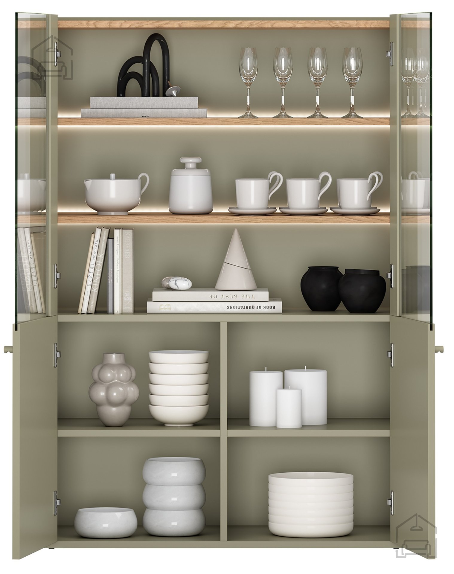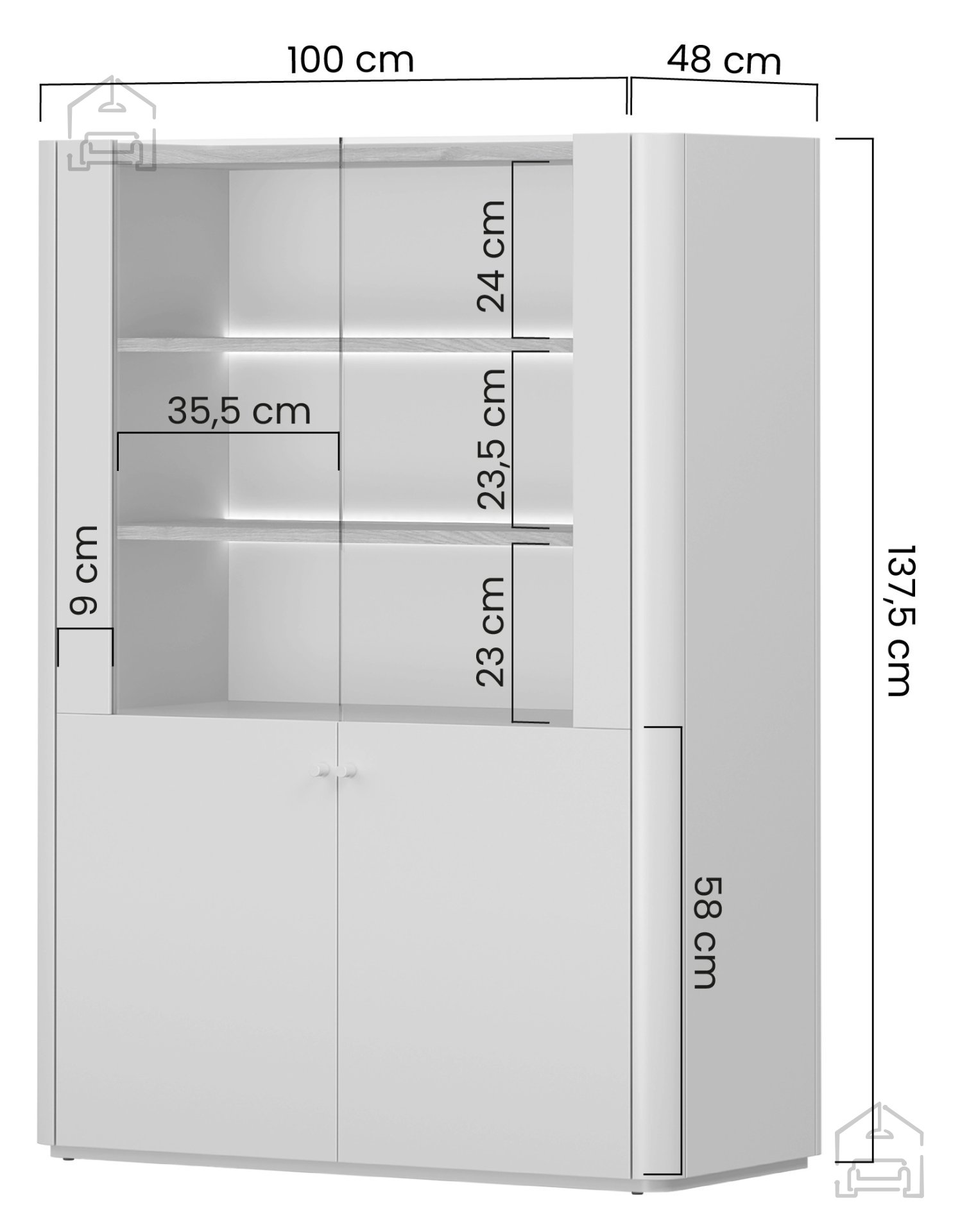 Mit den Maßen 100 × 48 × 137,5 cm bietet die Vitrine ein ideales Verhältnis zwischen Stauraum und kompaktem Format. Die zweiflügelige Ausführung (2D) ermöglicht einen bequemen Zugriff auf den Innenraum, wo Deko-Objekte, Gläser oder Bücher stilvoll präsentiert werden können. Die Türen schließen sanft und leise, ohne störendes Zuschlagen. Das grifflose System betont die klaren Linien und den modernen Charakter, während die dezent integrierten Griffmulden ein einfaches Öffnen ermöglichen.