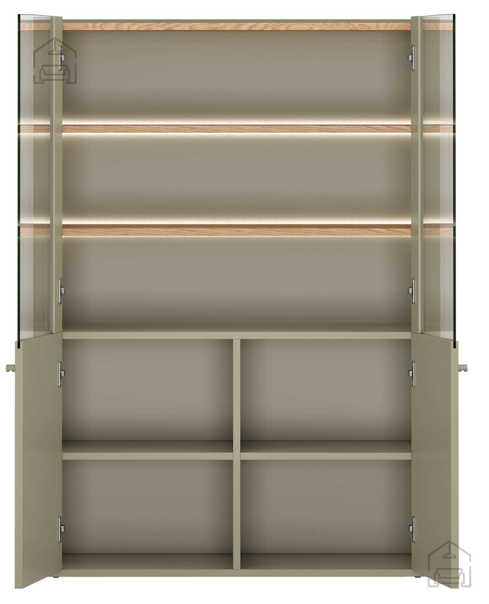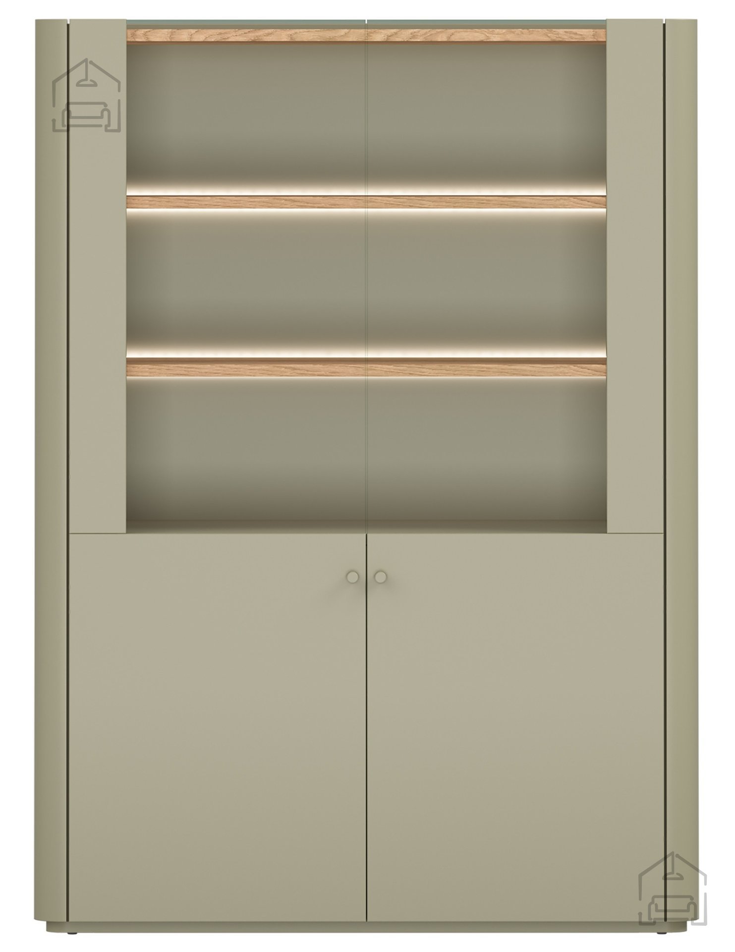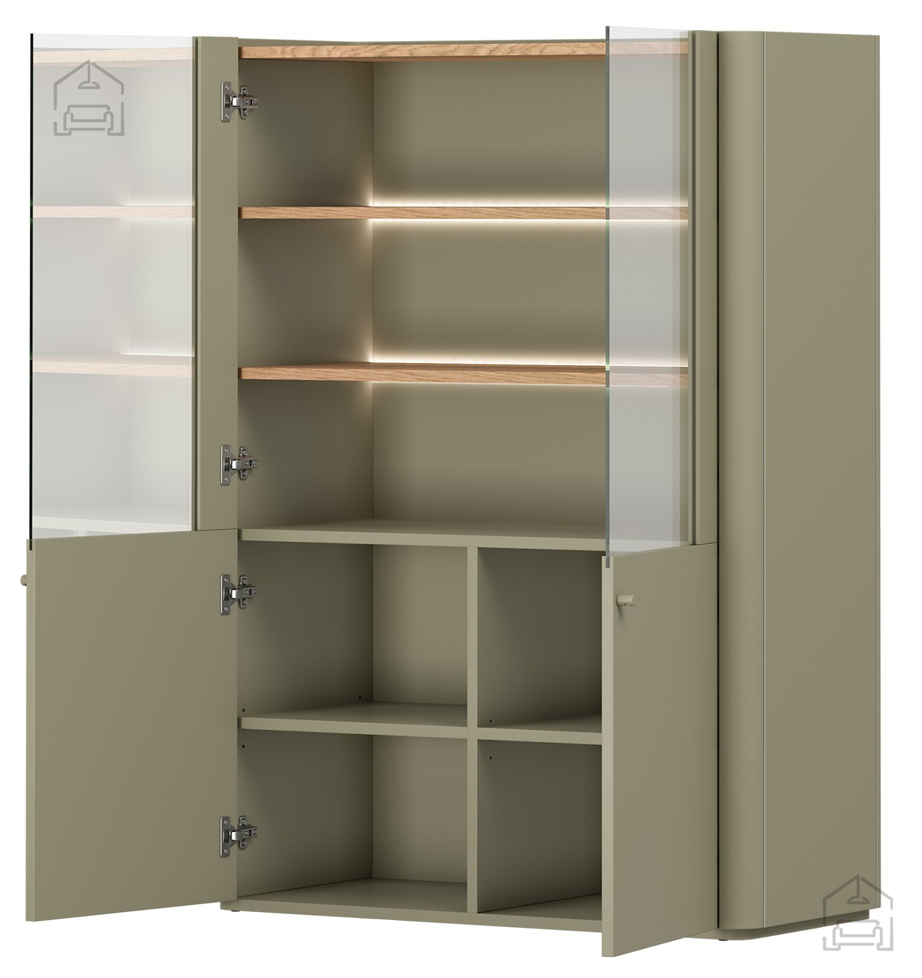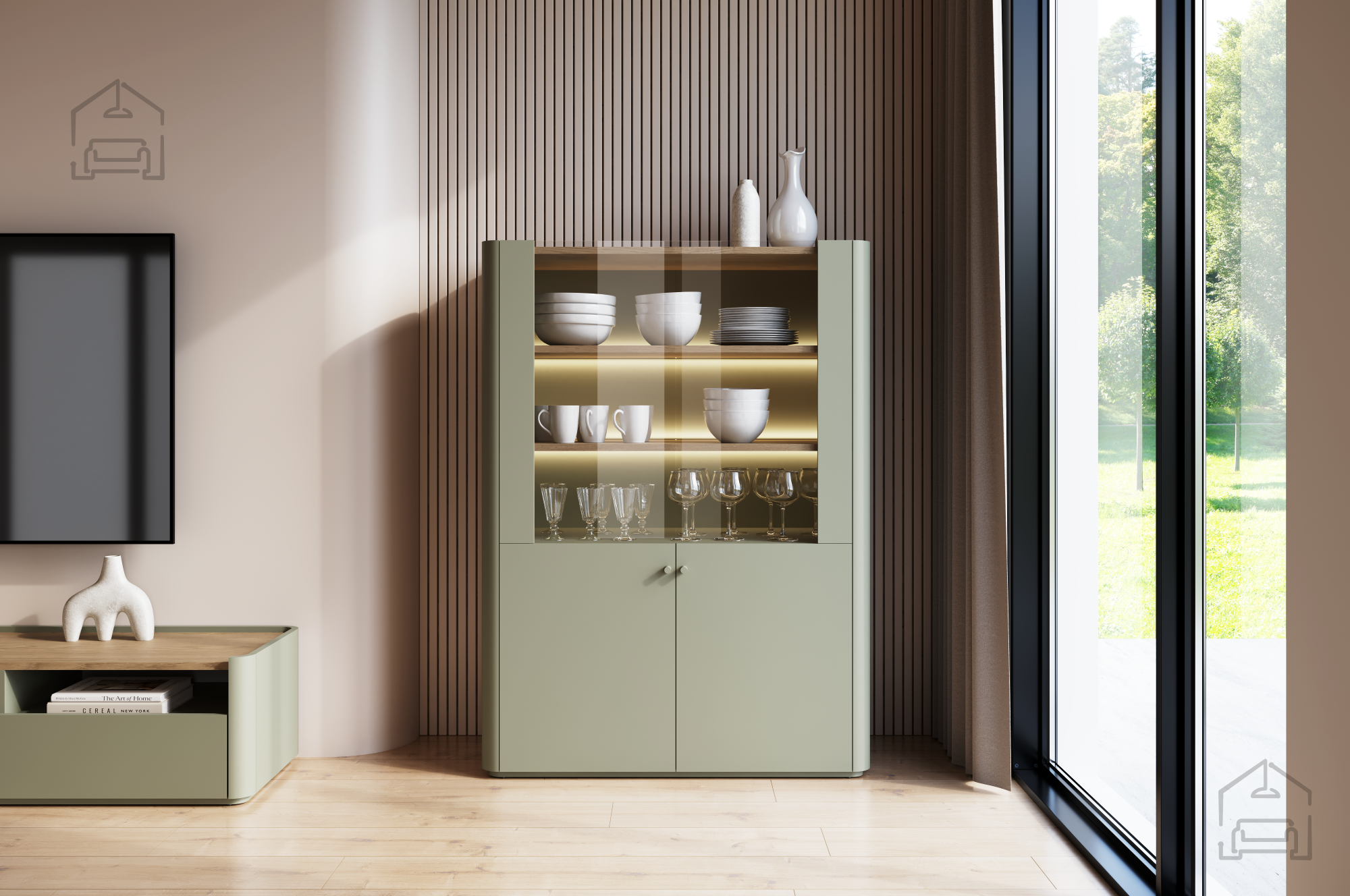 Die Vitrine Elivo 100 2D – Bogart passt hervorragend in unterschiedliche Wohnbereiche. Im Wohnzimmer dient sie als stilvolles Präsentationsmöbel, im Esszimmer als Aufbewahrungsort für Gläser und Porzellan, und im Vorraum als praktischer Stauraum für Accessoires. Die Farbkombination aus Eukalyptus und Eiche Baltic Dune harmoniert wunderbar mit neutralen Wänden, hellen Stoffen und metallischen Akzenten. Durch das grifflose Design und die LED-Beleuchtung wirkt die Vitrine leicht, modern und elegant.