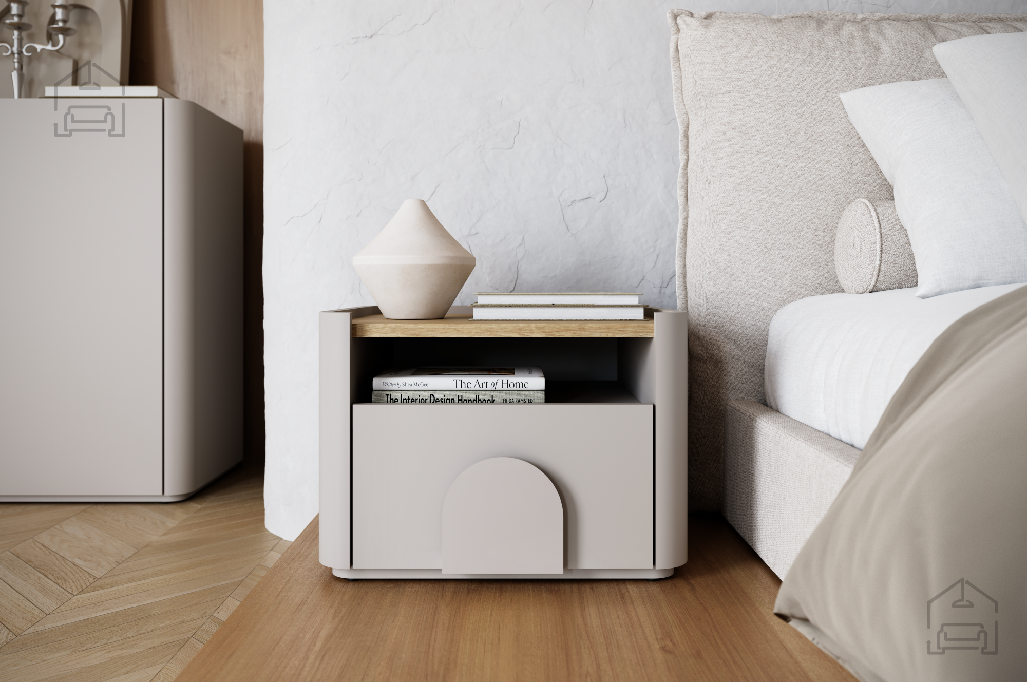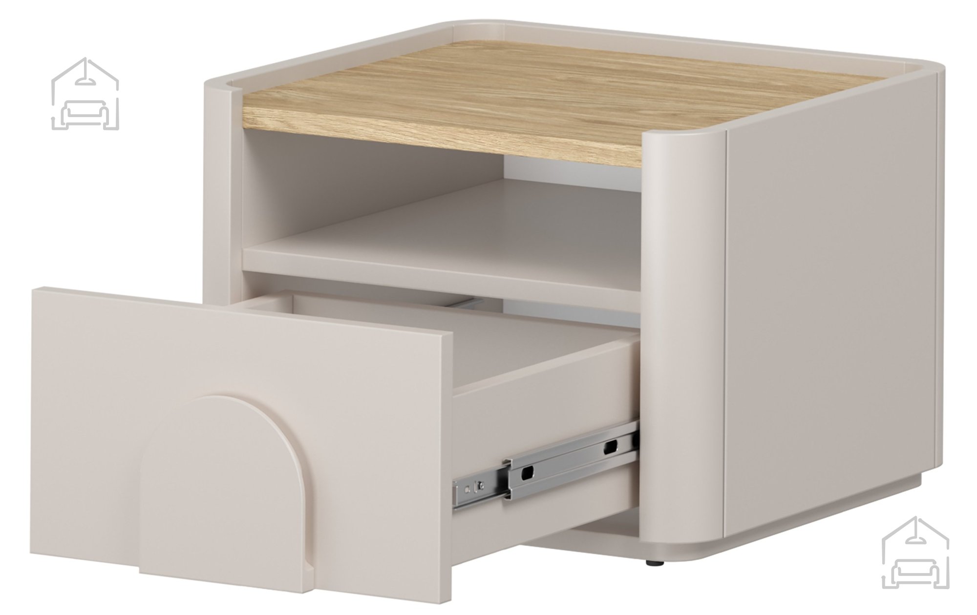 Das Nachtkästchen verfügt über eine geräumige Schublade mit Soft‑Close‑System, das ein sanftes und geräuschloses Schließen ermöglicht. In der Schublade finden Bücher, Brillen, Elektronik oder andere persönliche Dinge bequem Platz. Die obere Ablage bietet Raum für eine Lampe, einen Wecker oder dekorative Accessoires – für eine praktische und zugleich ansprechende Gestaltung des Nachtbereichs.
