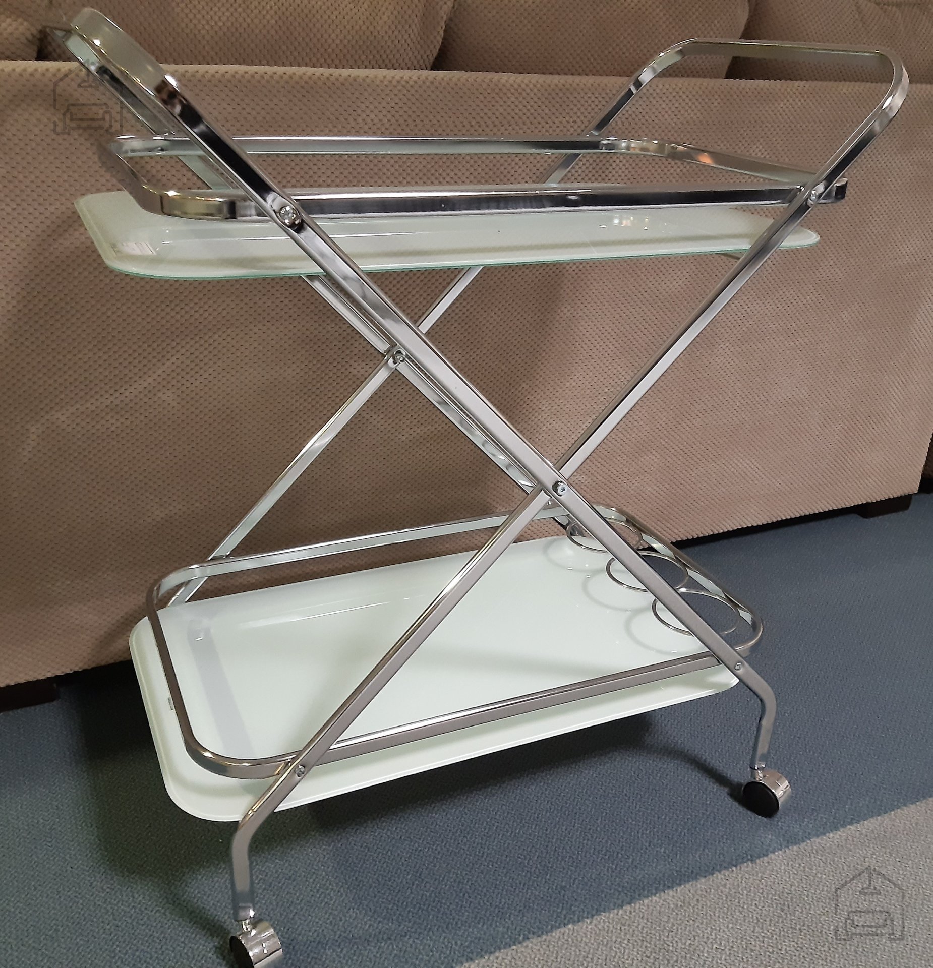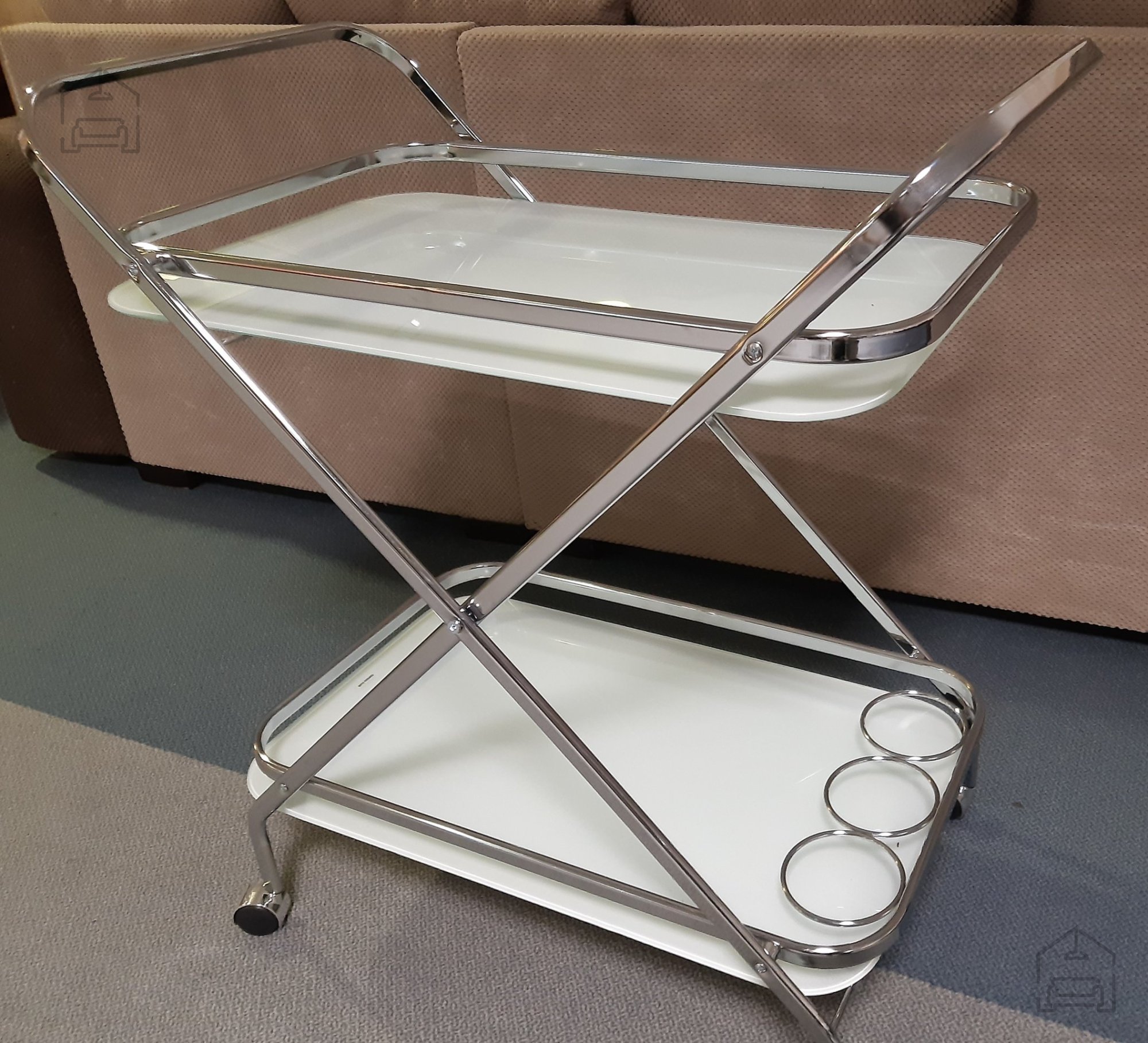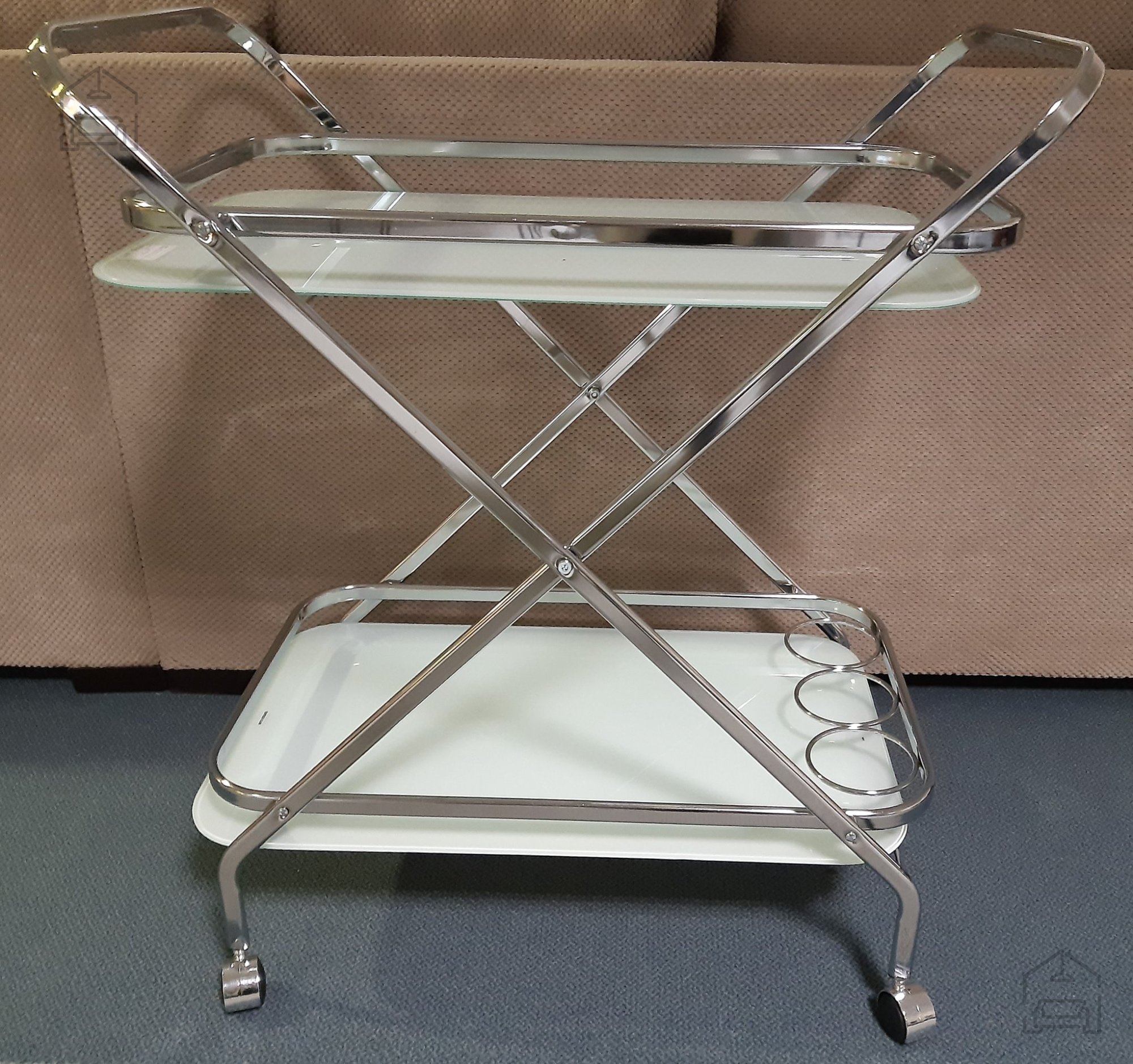 Der Wagen ist aus hochwertigen Materialien gefertigt, die eine lange Lebensdauer und einfache Pflege gewährleisten. Das Gestell besteht aus verchromten Stahlrohren, die für Stabilität und Robustheit sorgen. Die beiden Ablagen sind aus 0,5 cm starkem, weiß lackiertem Sicherheitsglas gefertigt, das besonders stoß- und hitzebeständig ist – ideal also für den täglichen Gebrauch. Die Kombination aus Metallrahmen und Glasböden verleiht dem Möbelstück eine leichte, aber dennoch stabile Anmutung und fügt sich harmonisch in unterschiedlichste Einrichtungsstile ein – von modern-minimalistisch bis klassisch-elegant.