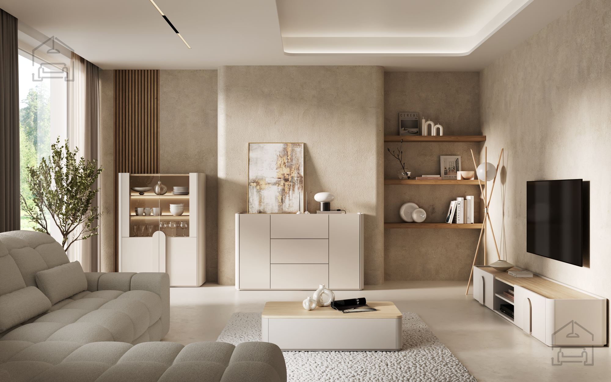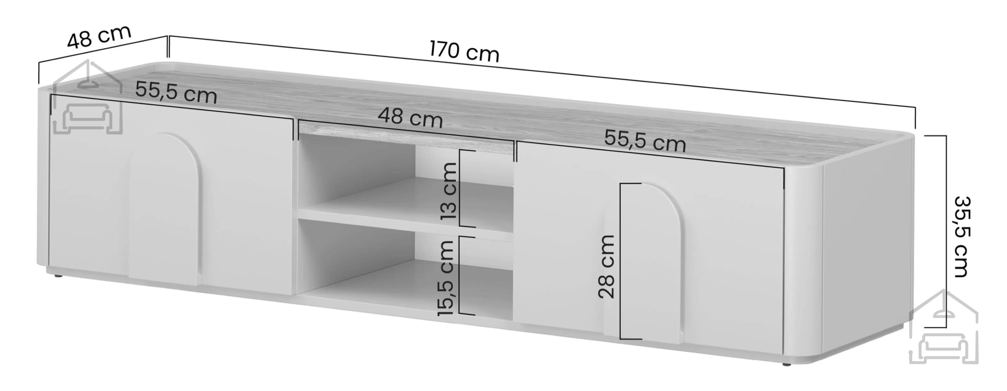 Auf der oberen Platte finden Fernseher, Lautsprecher oder persönliche Dekorationen wie Pflanzen, Kerzen oder Fotos ihren Platz. Dank der ausgewogenen Proportionen und der dezenten Farbpalette wirkt die Kommode nie aufdringlich, sondern ergänzt den Raum harmonisch. Weiche Linien und abgerundete Kanten vermitteln ein Gefühl von Sicherheit und optischer Sanftheit.