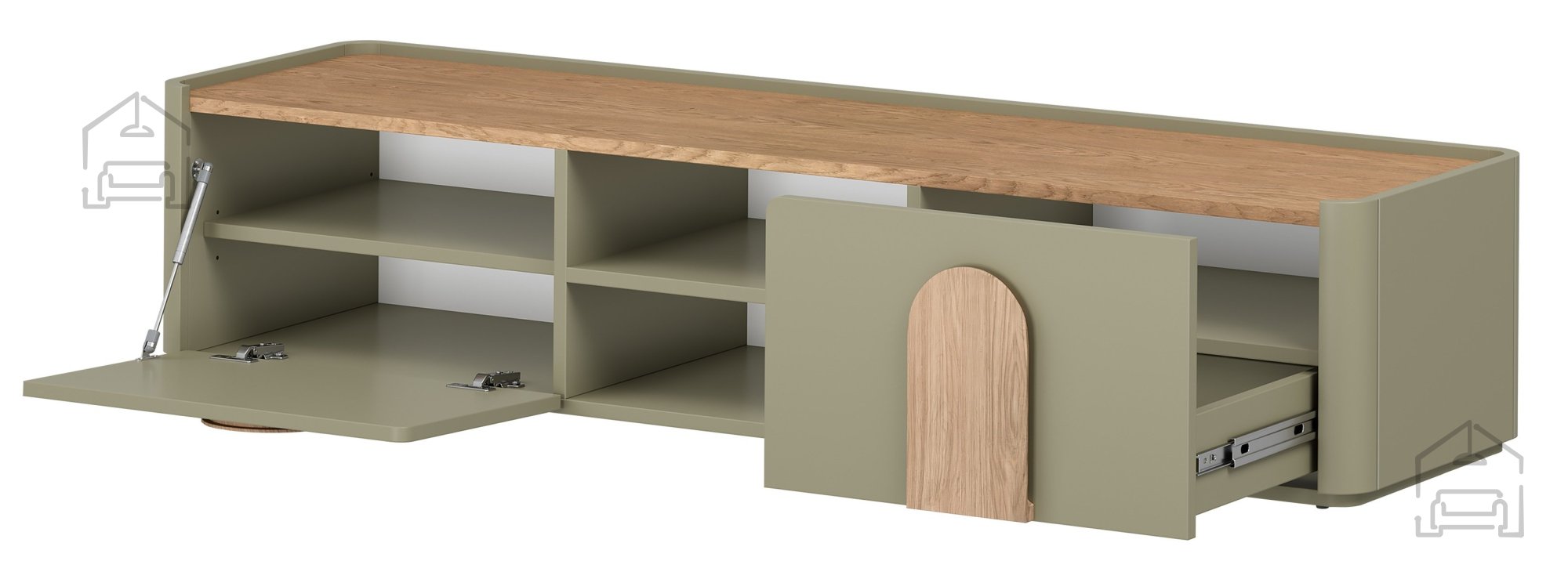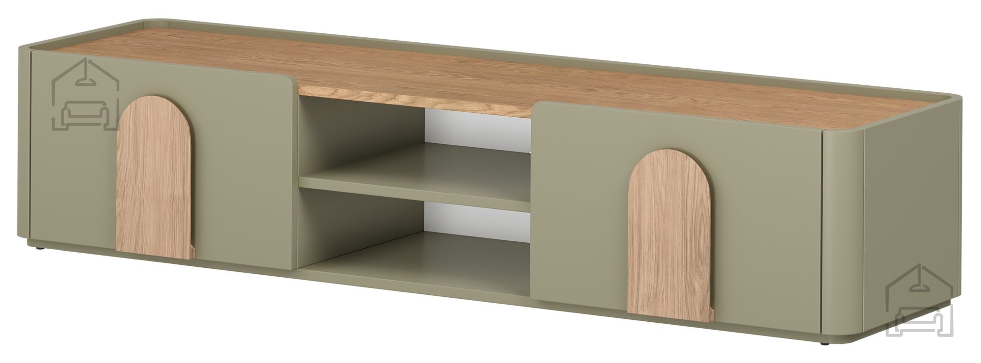 Die TV‑Kommode Amilio 170 1K1SZ – Bogart verbindet modernen skandinavischen Stil mit der natürlichen Wärme von Holz und durchdachter Funktionalität. Sie besteht aus hochwertigen Materialien – Melaminplatte 18 mm stark, Fronten aus MDF 18 mm und Rückwand aus HDF 3 mm. Die Oberfläche im Eukalyptus‑Ton harmoniert wunderbar mit der Deckplatte in Eiche Baltic Dune und schafft so einen ausgewogenen Kontrast zwischen dem sanften Grünton und der warmen Helligkeit des Holzes. Natürliche Eichen‑Griffe setzen dezente Akzente und verleihen dem Möbelstück eine behagliche, wohnliche Note.
