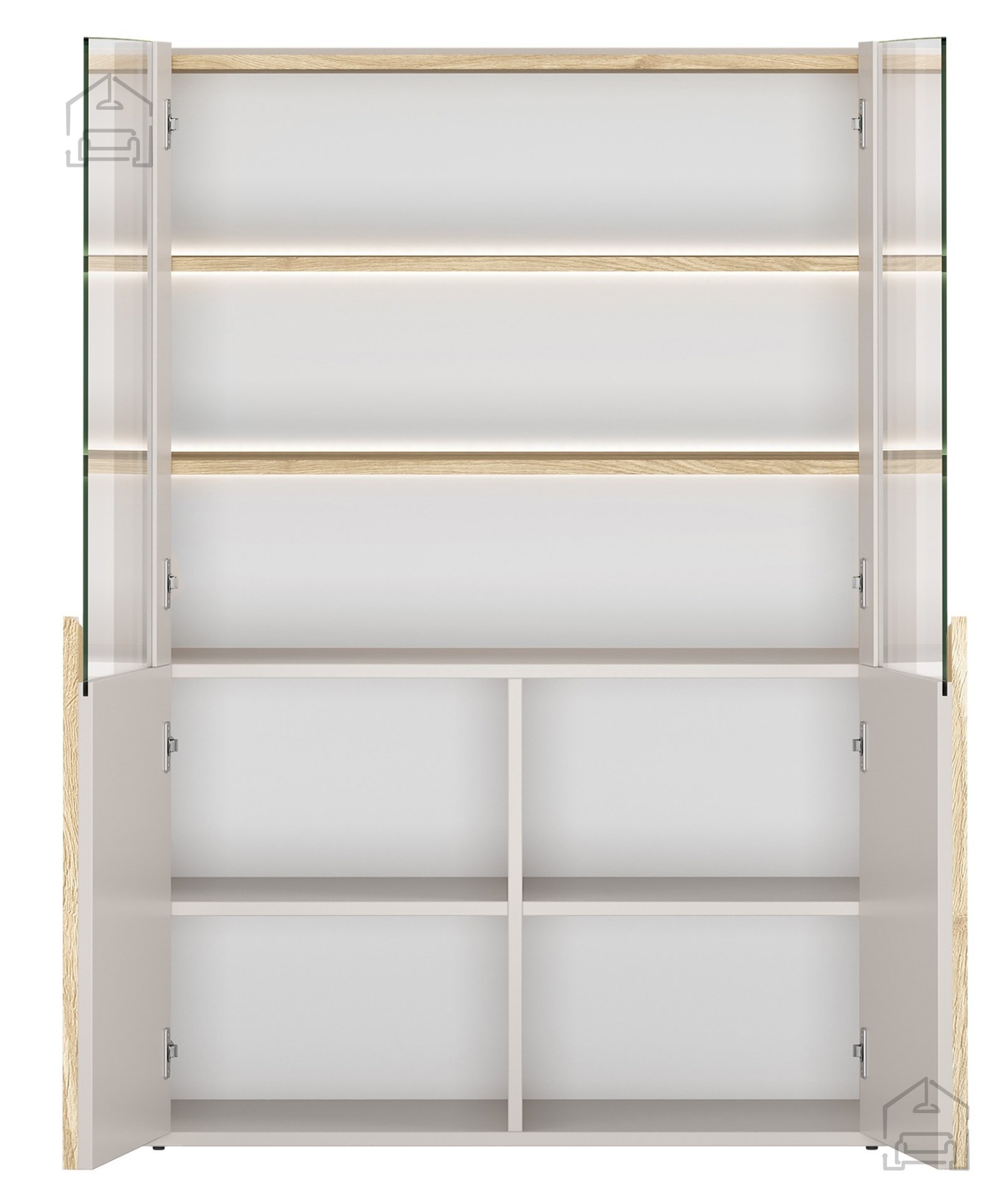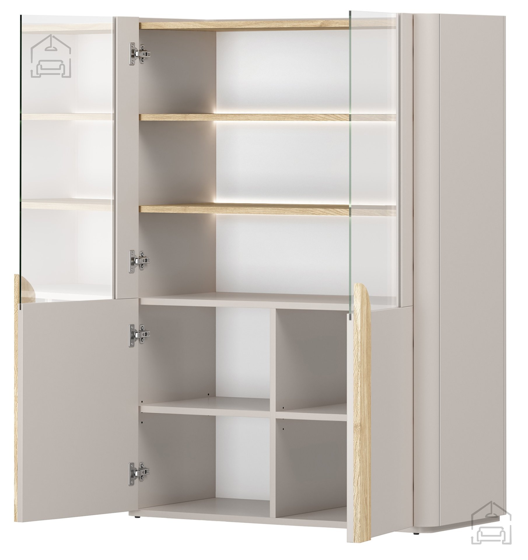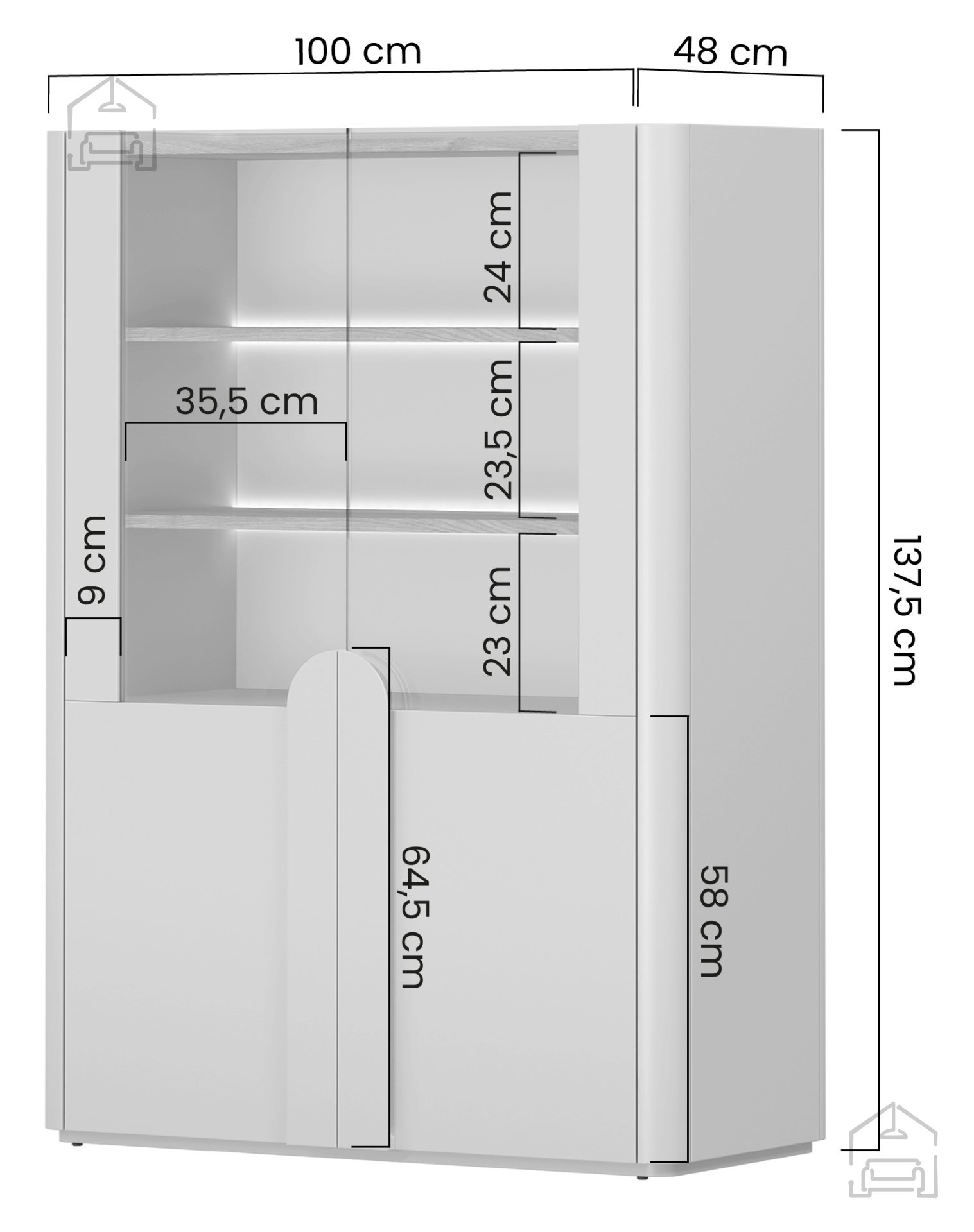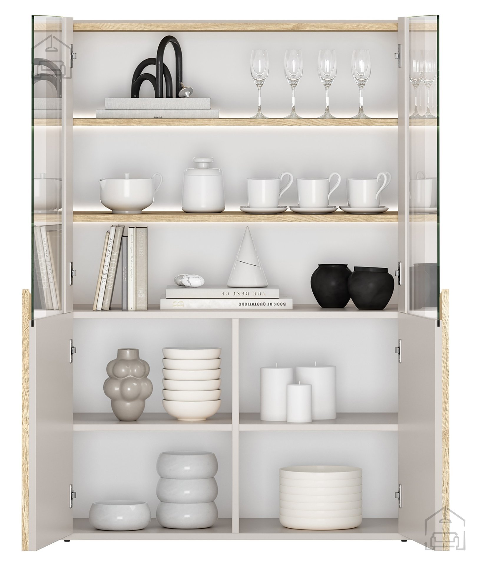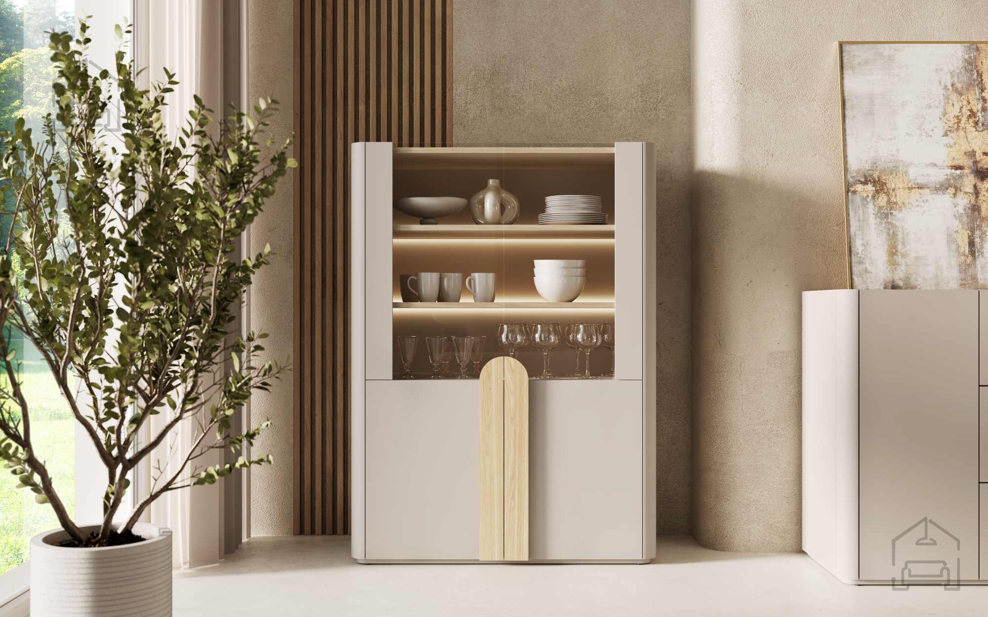 Mit den Abmessungen von 100 × 48 × 137,5 cm bietet die Vitrine großzügigen Stauraum, ohne den Raum zu dominieren. Sie eignet sich perfekt, um an der Wand des Wohnzimmers, Essbereichs oder Vorzimmers platziert zu werden. Durch ihre ausgewogene Höhe lässt sie sich gut mit weiteren Möbelstücken derselben Kollektion oder mit neutralen Elementen in ähnlichen Farbtönen kombinieren.