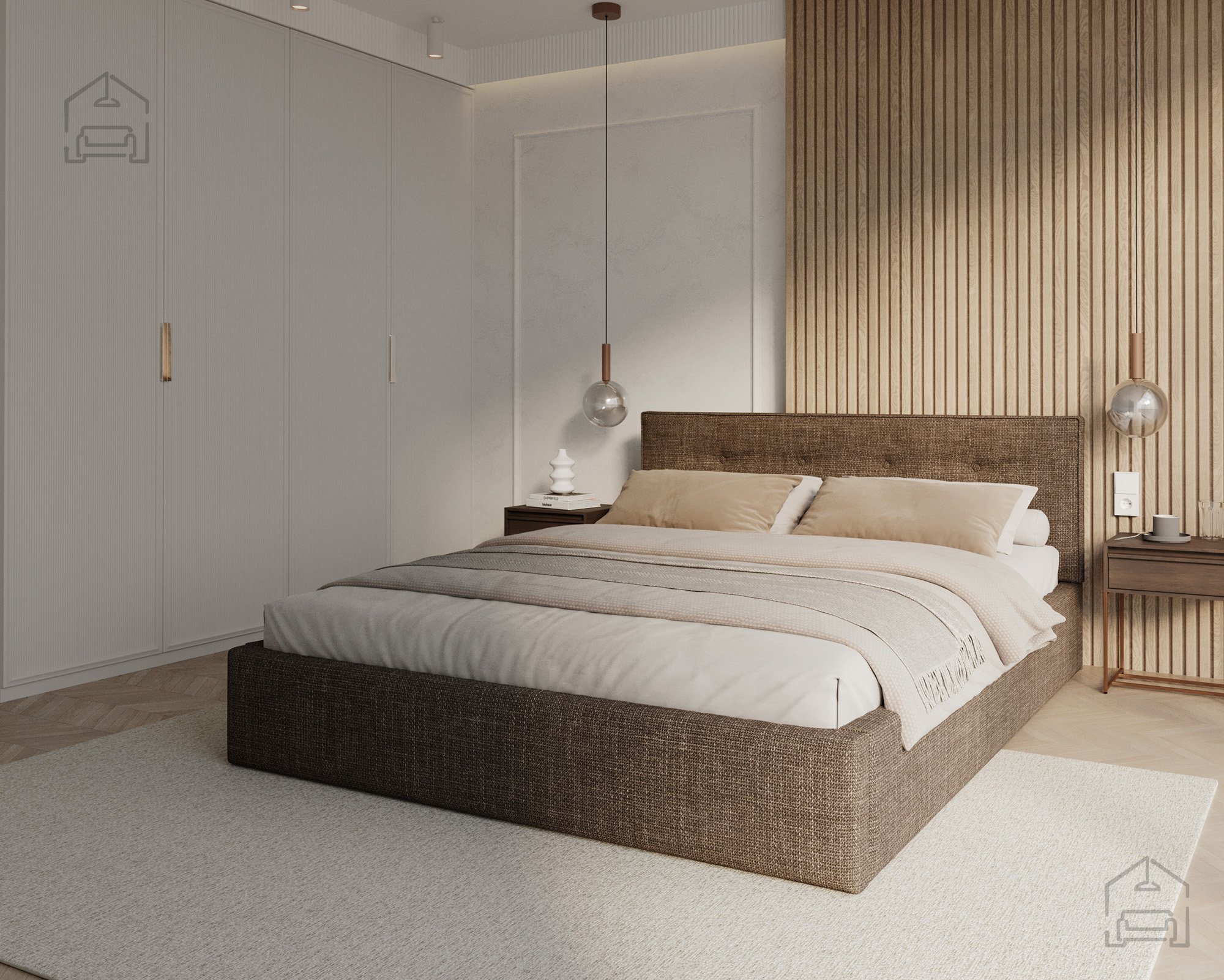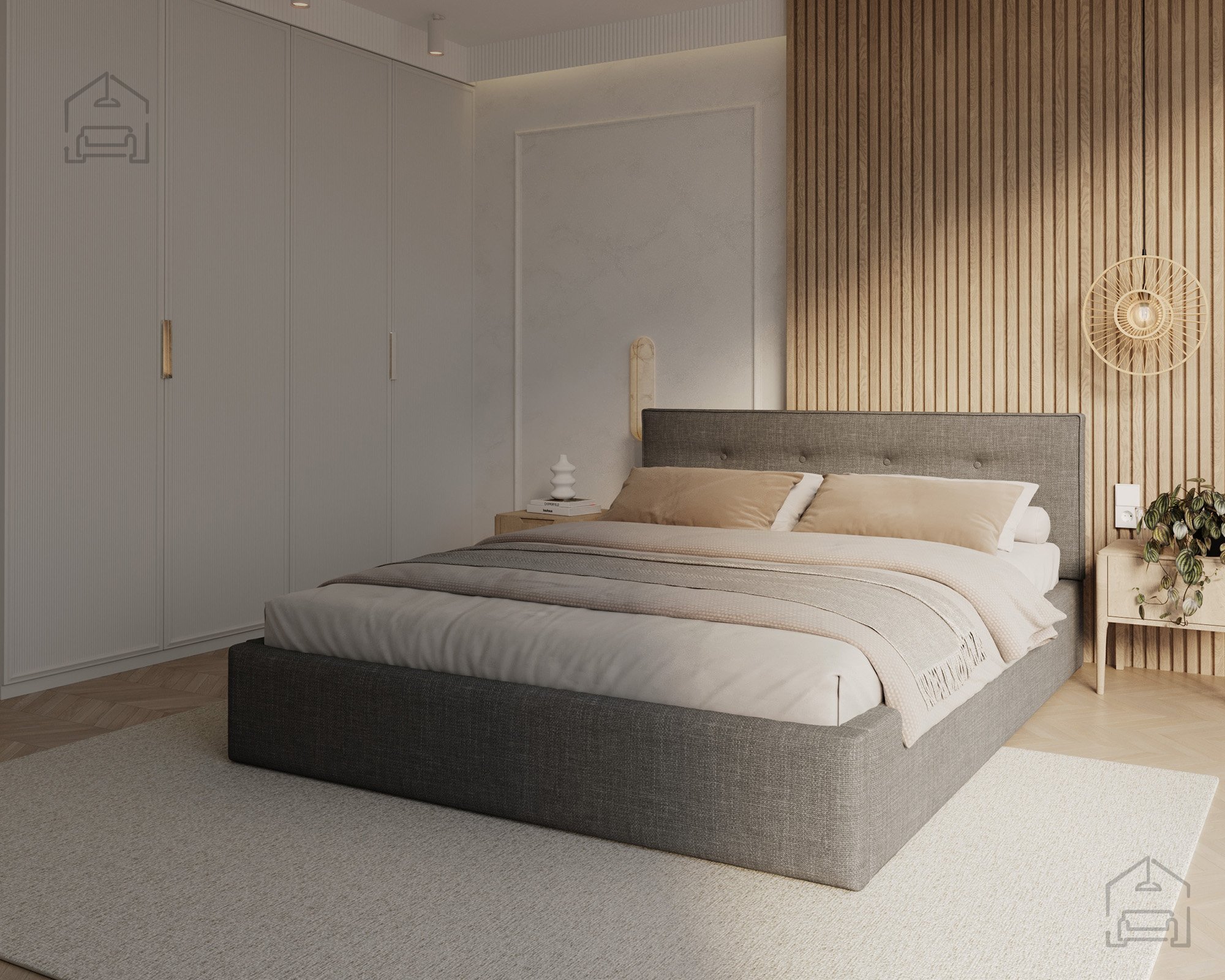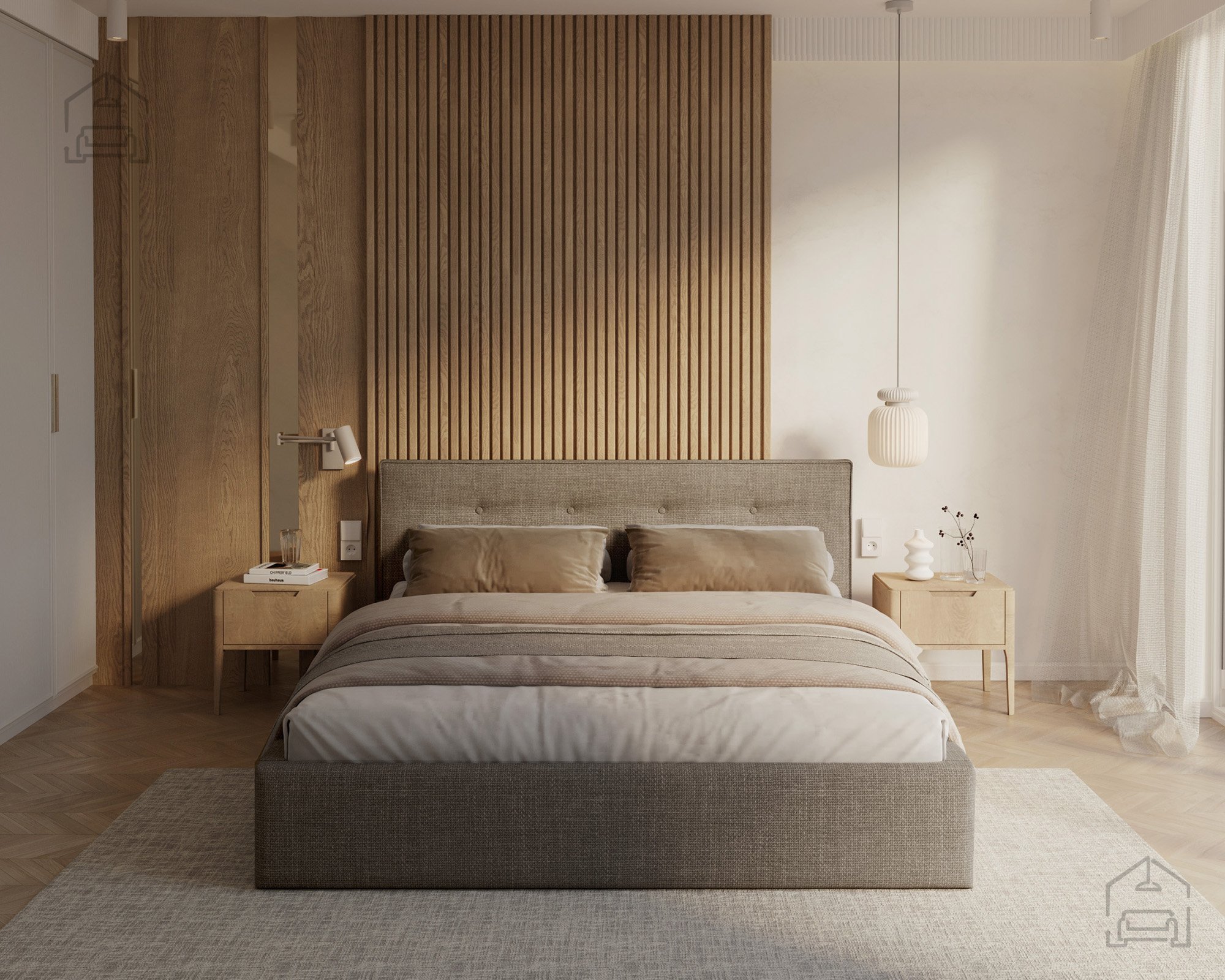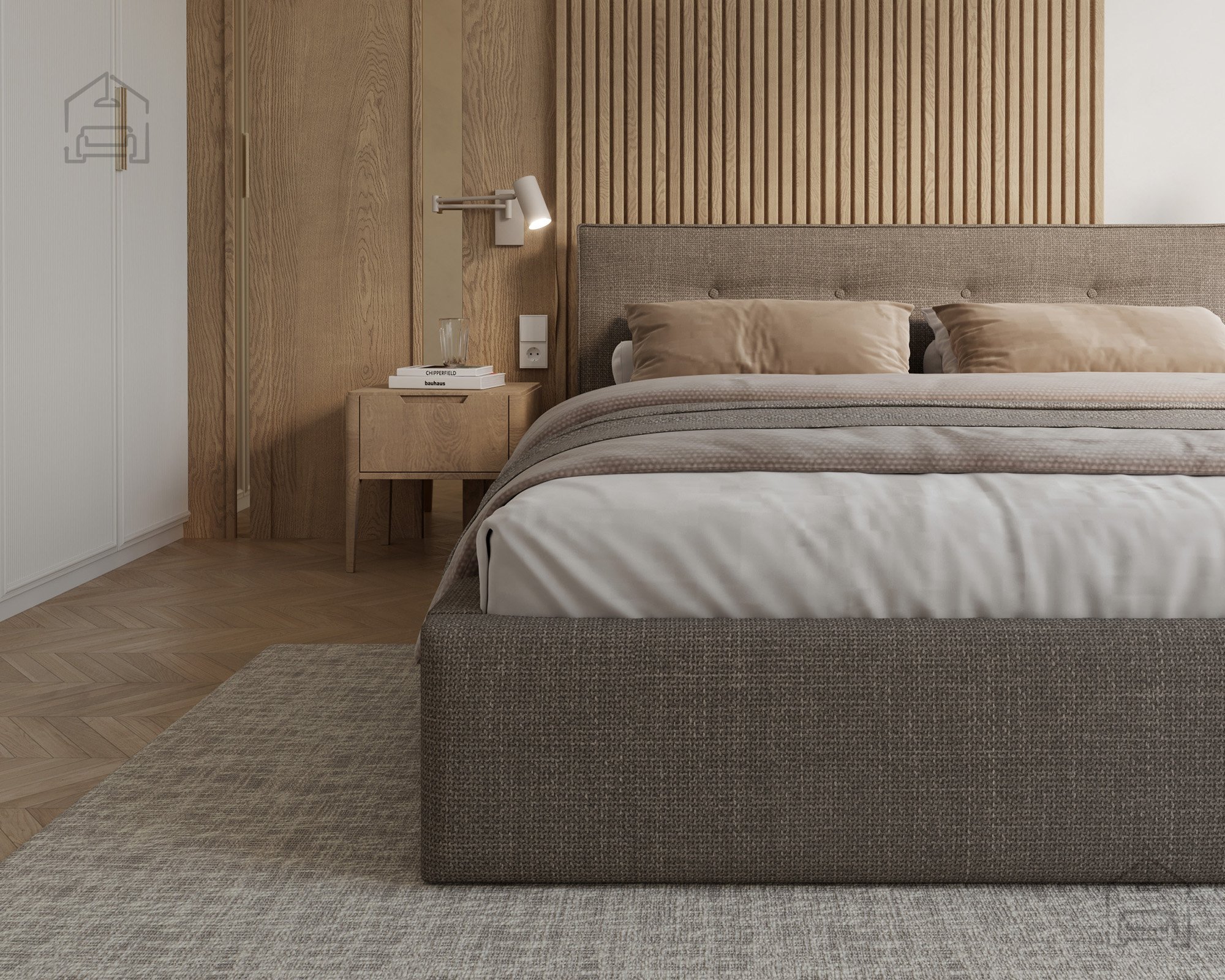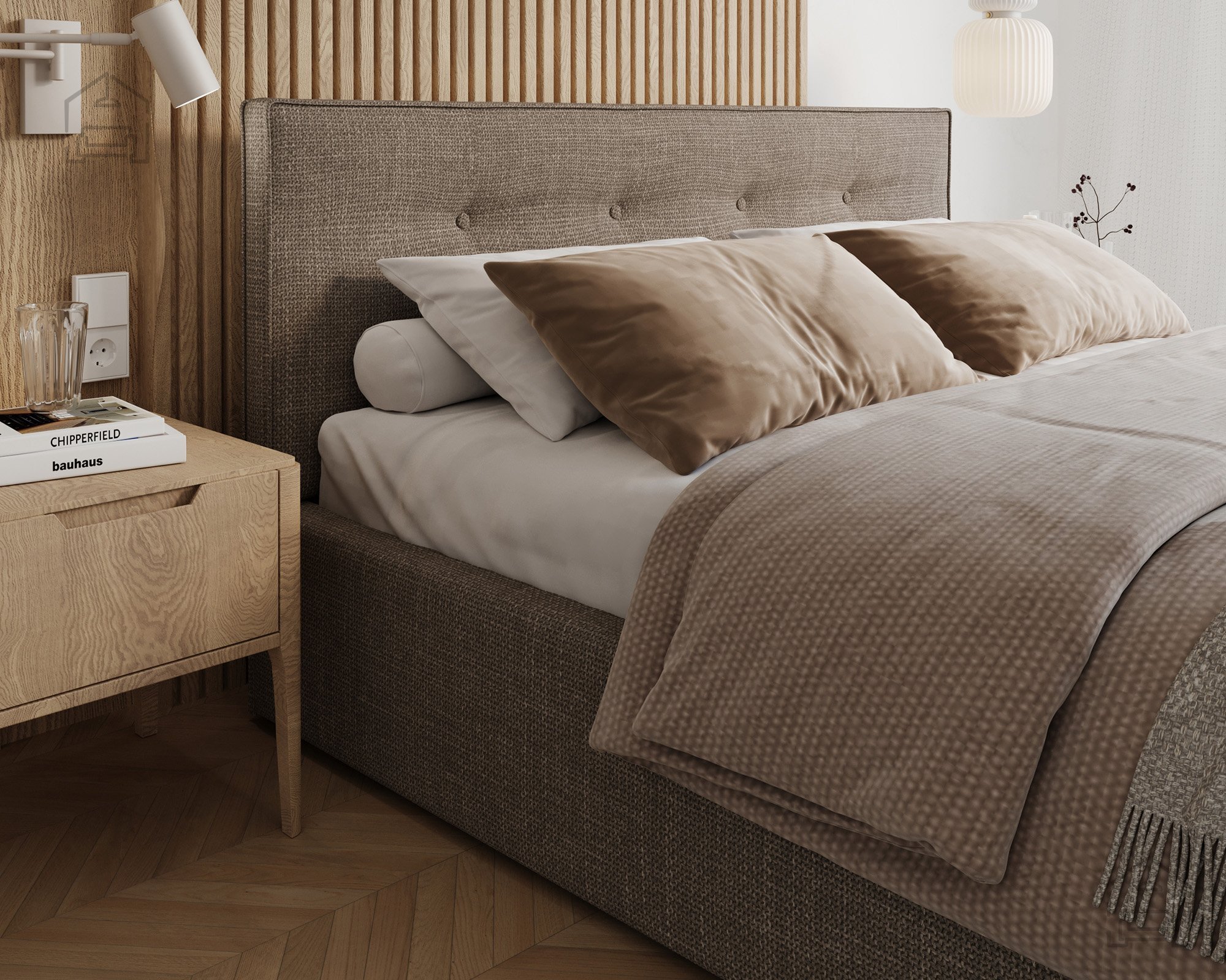 Der Bettrahmen ist mit dem Stoff Ottawa Beige bezogen, dessen dezenter Farbton und feine Struktur dem Schlafzimmer eine warme, elegante Atmosphäre verleihen. Der Stoff fühlt sich angenehm an und bleibt auch bei längerer Nutzung formschön und gepflegt.