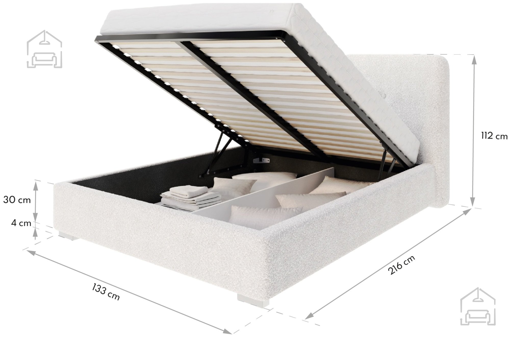 Der integrierte Hebemechanismus aus Holz ermöglicht ein leichtes Anheben der Liegefläche und gibt den Blick auf den geräumigen Bettkasten frei. Diese Lösung ist besonders praktisch in kleineren Schlafzimmern, wo jeder Zentimeter zählt. Der Stauraum eignet sich ideal für Decken, Kissen oder andere Textilien und hilft, Ordnung im Raum zu bewahren.