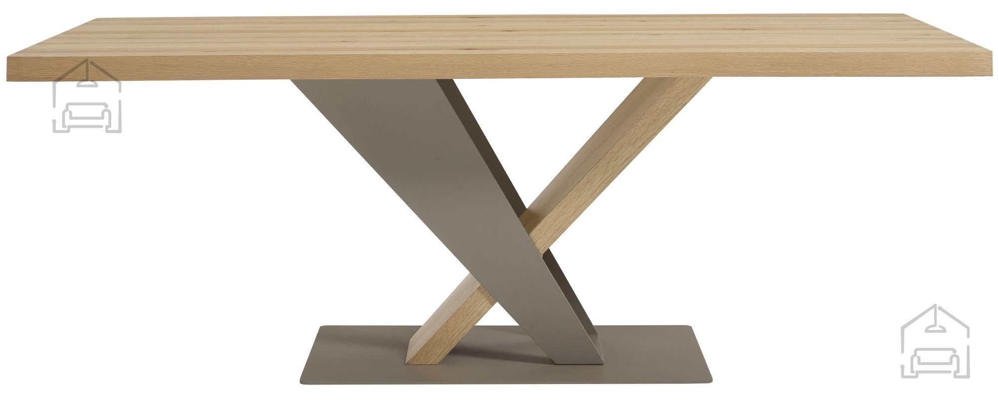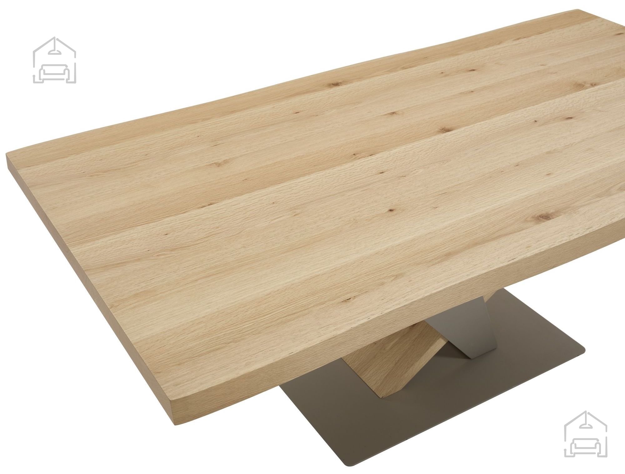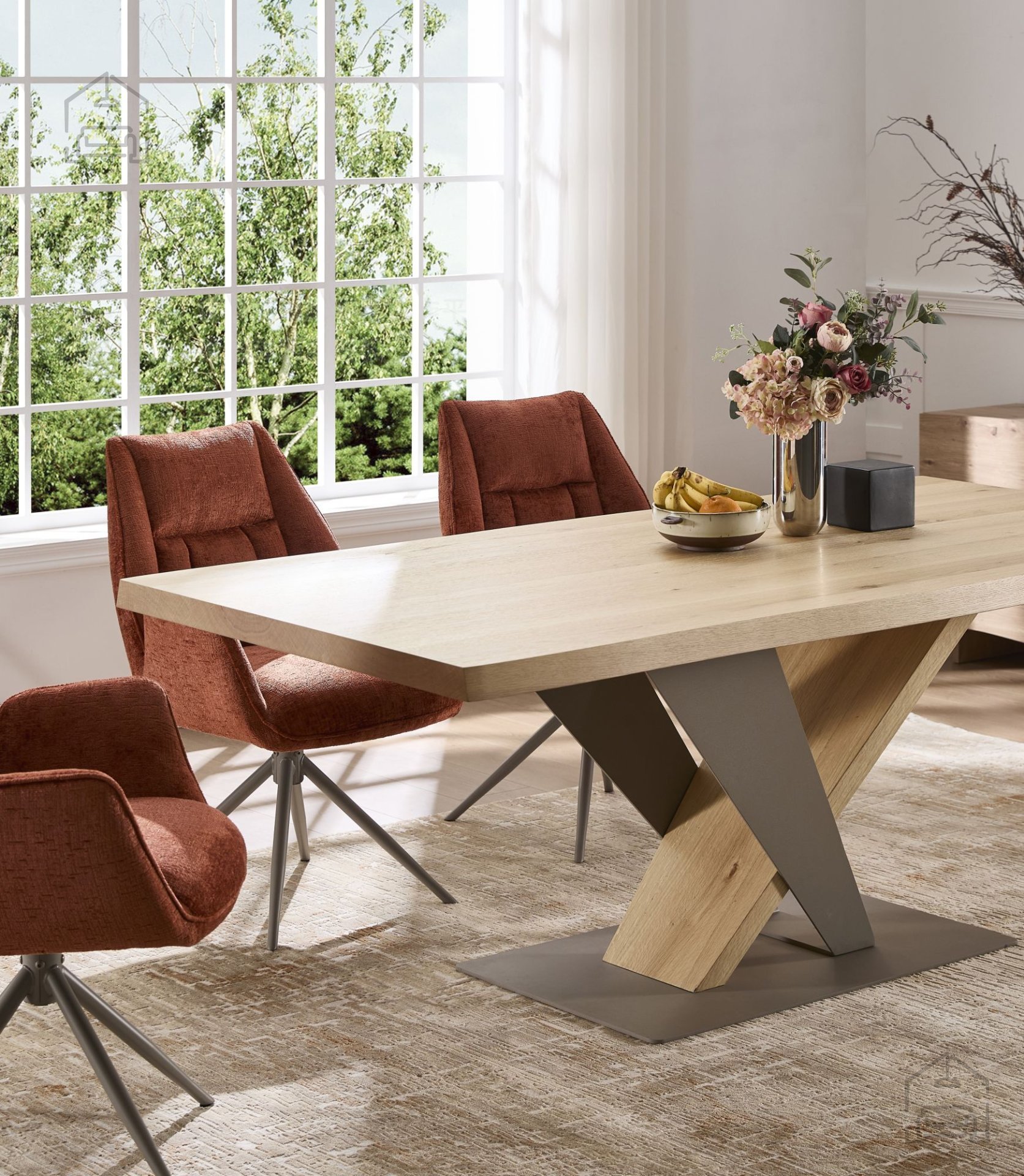 Der visuelle Kontrast zwischen der Holzstruktur der Platte und dem Metallgestell verleiht dem Tisch Tarvo eine moderne Note. Durch seine klare, markante Form wirkt er als zentraler Blickfang im Ess- oder Wohnbereich. Das kreuzförmige Metallgestell bietet nicht nur Stabilität, sondern sorgt auch für ein interessantes Spiel von Licht und Schatten, das den architektonischen Charakter des Möbelstücks zusätzlich betont.
