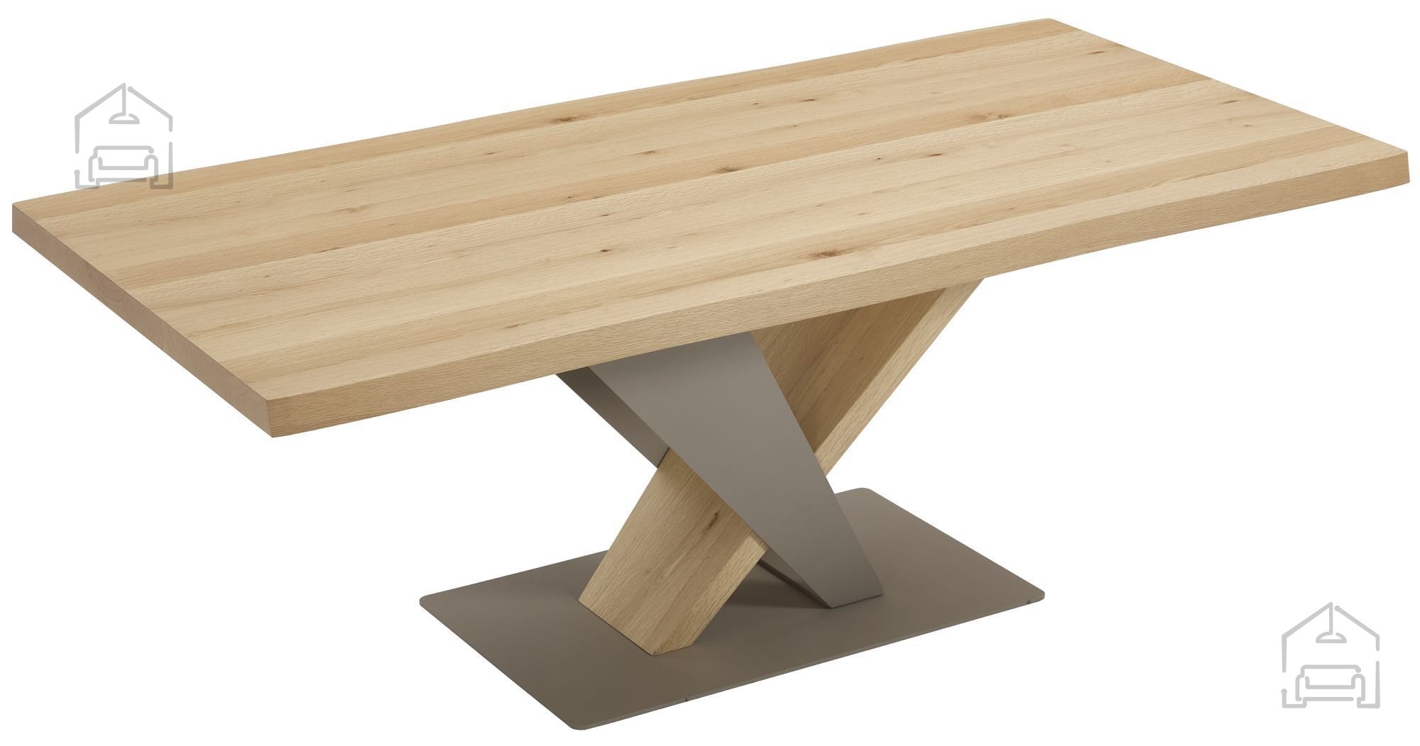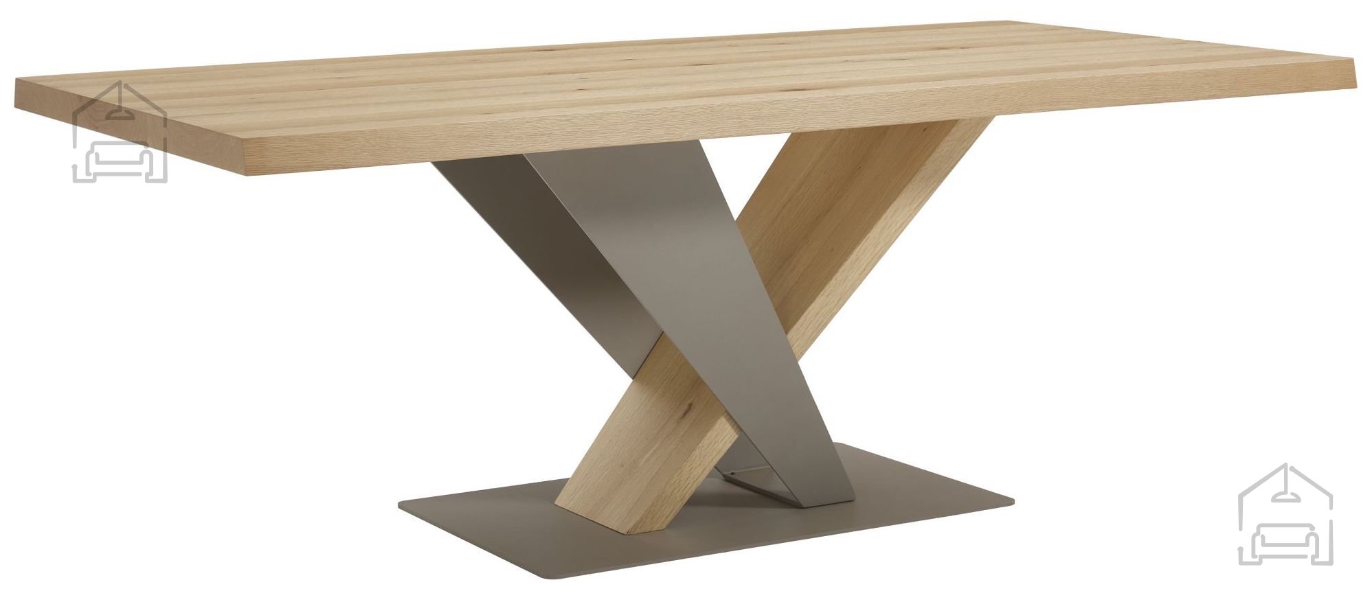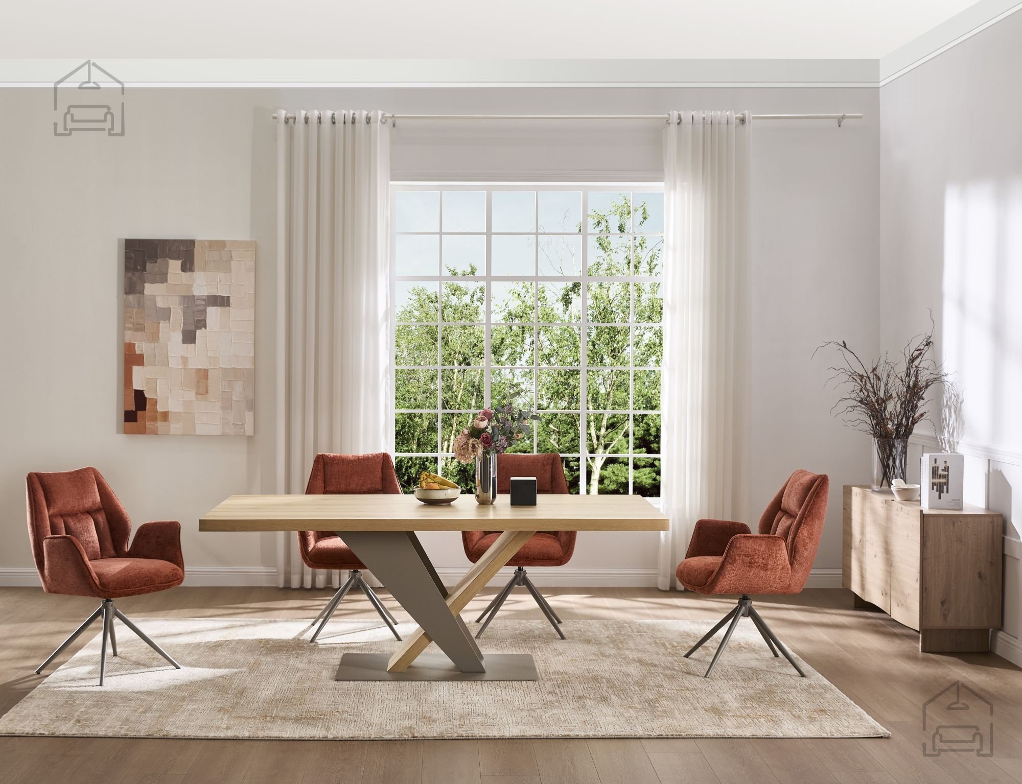 Der visuelle Kontrast zwischen der Holzstruktur der Platte und dem Metallgestell verleiht dem Tisch Tarvo eine moderne Note. Durch seine klare, markante Form wirkt er als zentraler Blickfang im Ess- oder Wohnbereich. Das kreuzförmige Metallgestell bietet nicht nur Stabilität, sondern sorgt auch für ein interessantes Spiel von Licht und Schatten, das den architektonischen Charakter des Möbelstücks zusätzlich betont.
