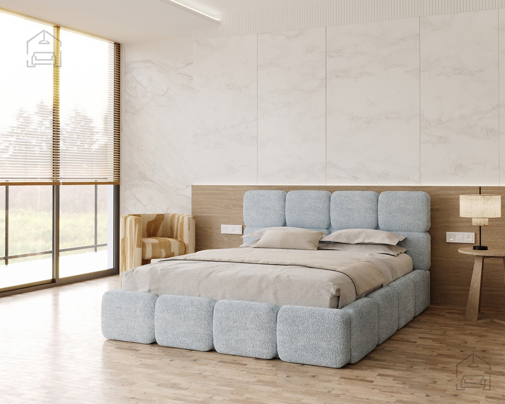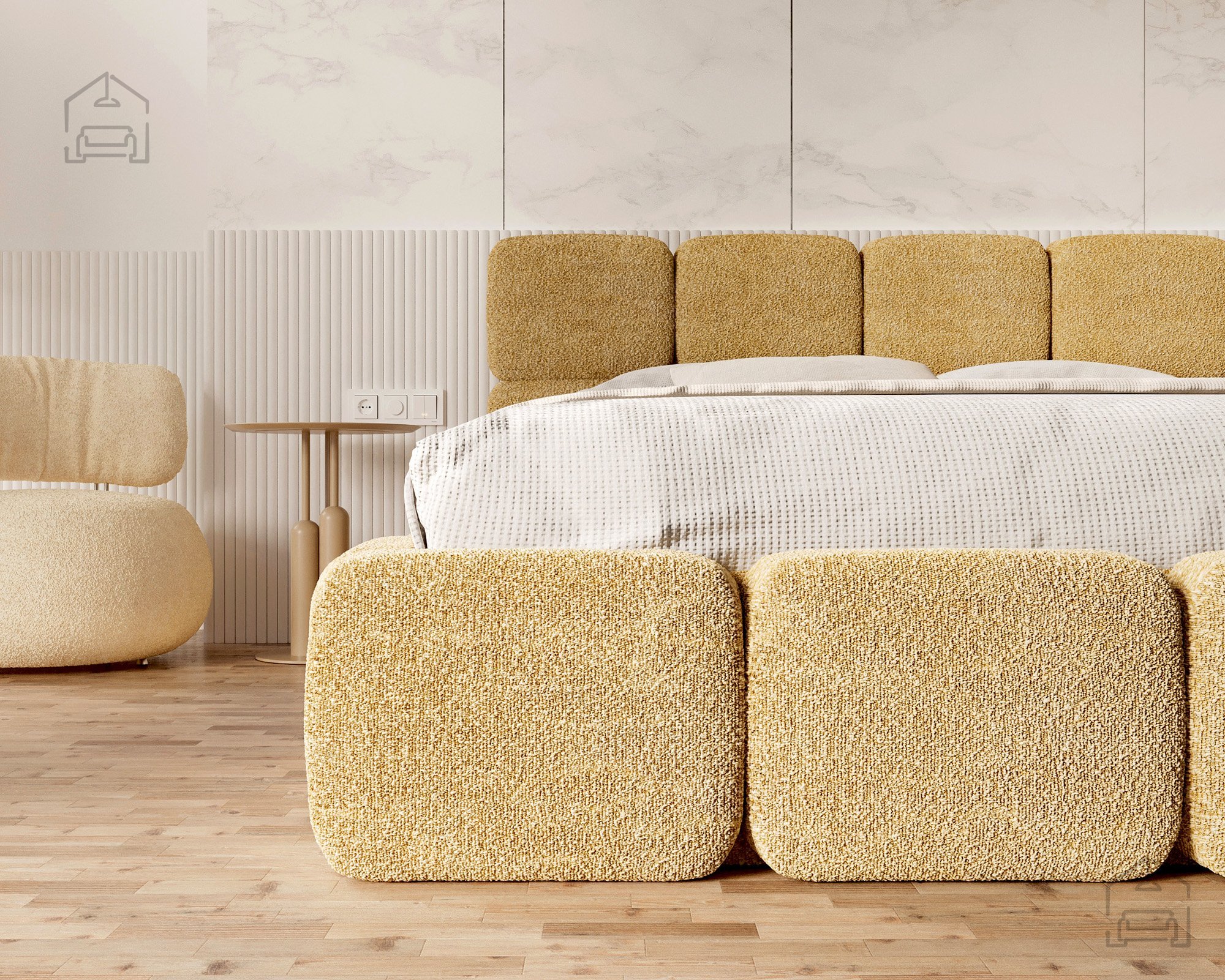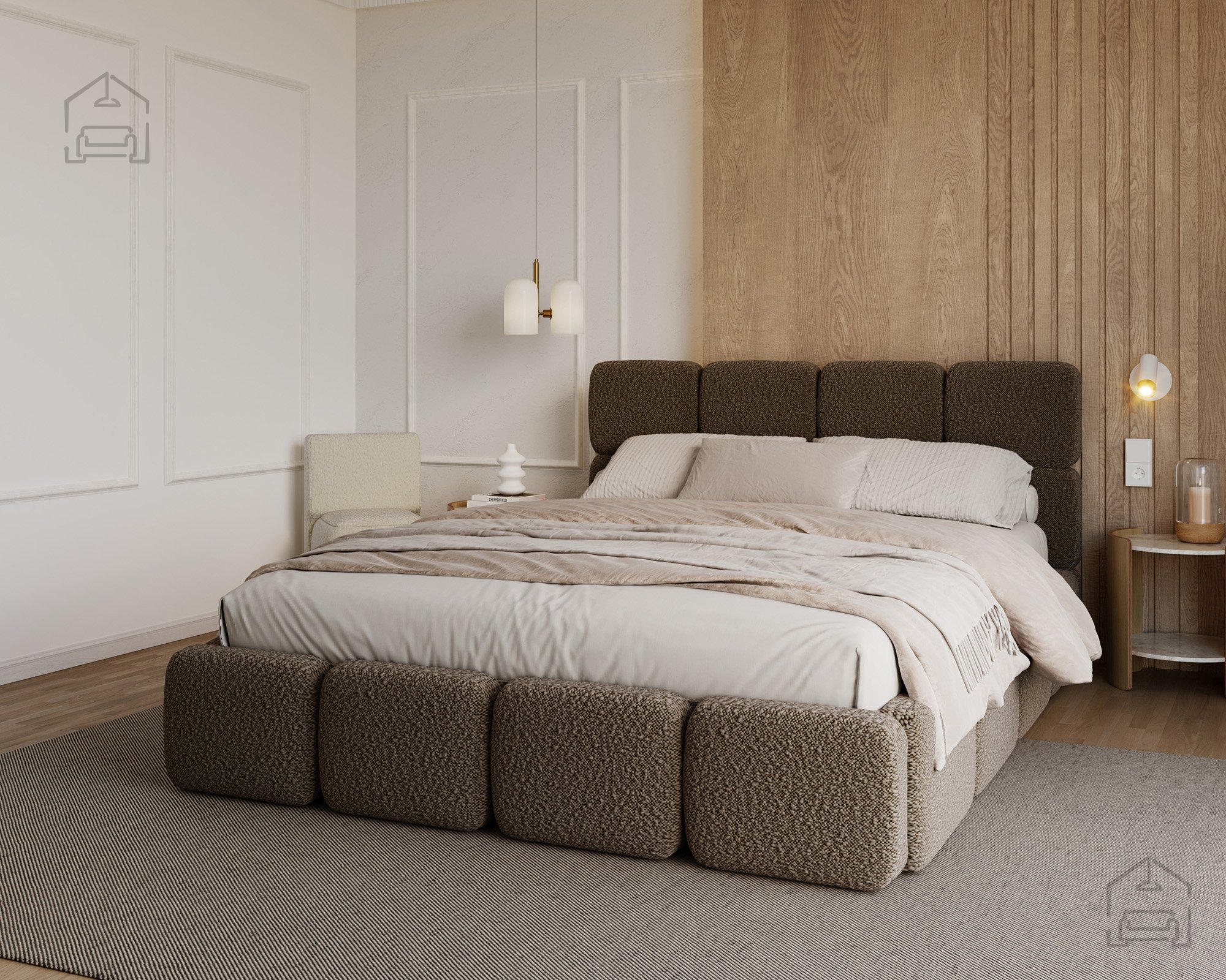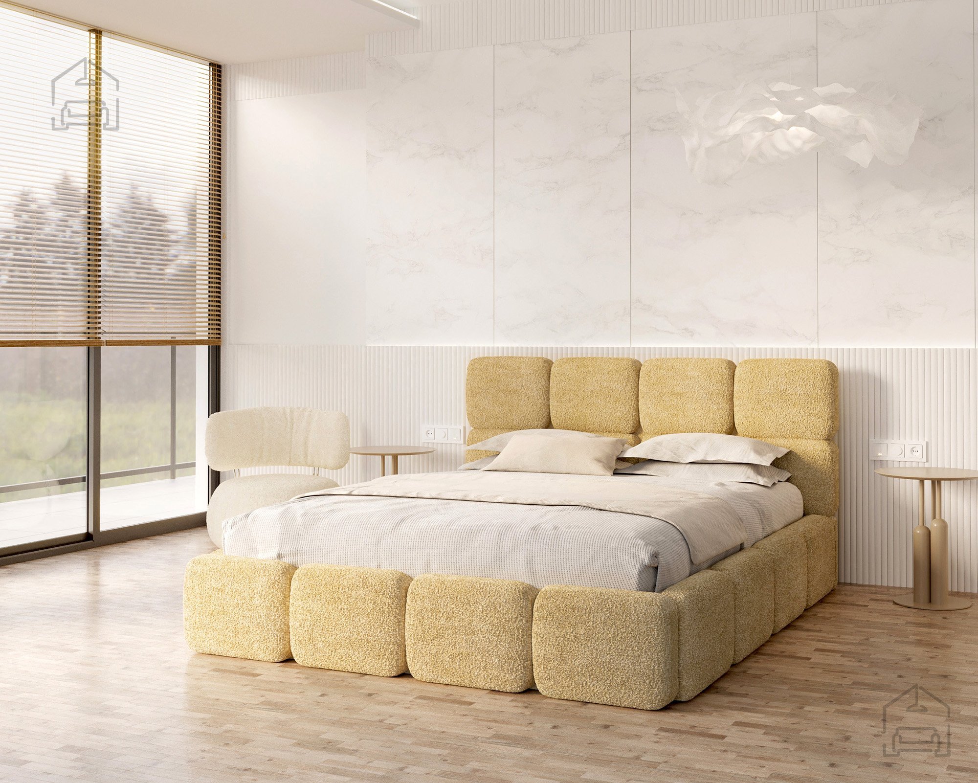 Die Basis des Bettes besteht aus Spanplatte und Holz, was Stabilität und Langlebigkeit gewährleistet. Die T-25-Schaumfüllung bietet genau das richtige Maß an Komfort und Elastizität und behält auch nach längerer Nutzung ihre Form. Der gepolsterte Rahmen ist mit dem Stoff Cleo Honey bezogen, der sich angenehm weich anfühlt und zugleich strapazierfähig ist. Die warmen Farbtöne und Strukturen schaffen eine behagliche Atmosphäre, in der man sich gerne entspannt.