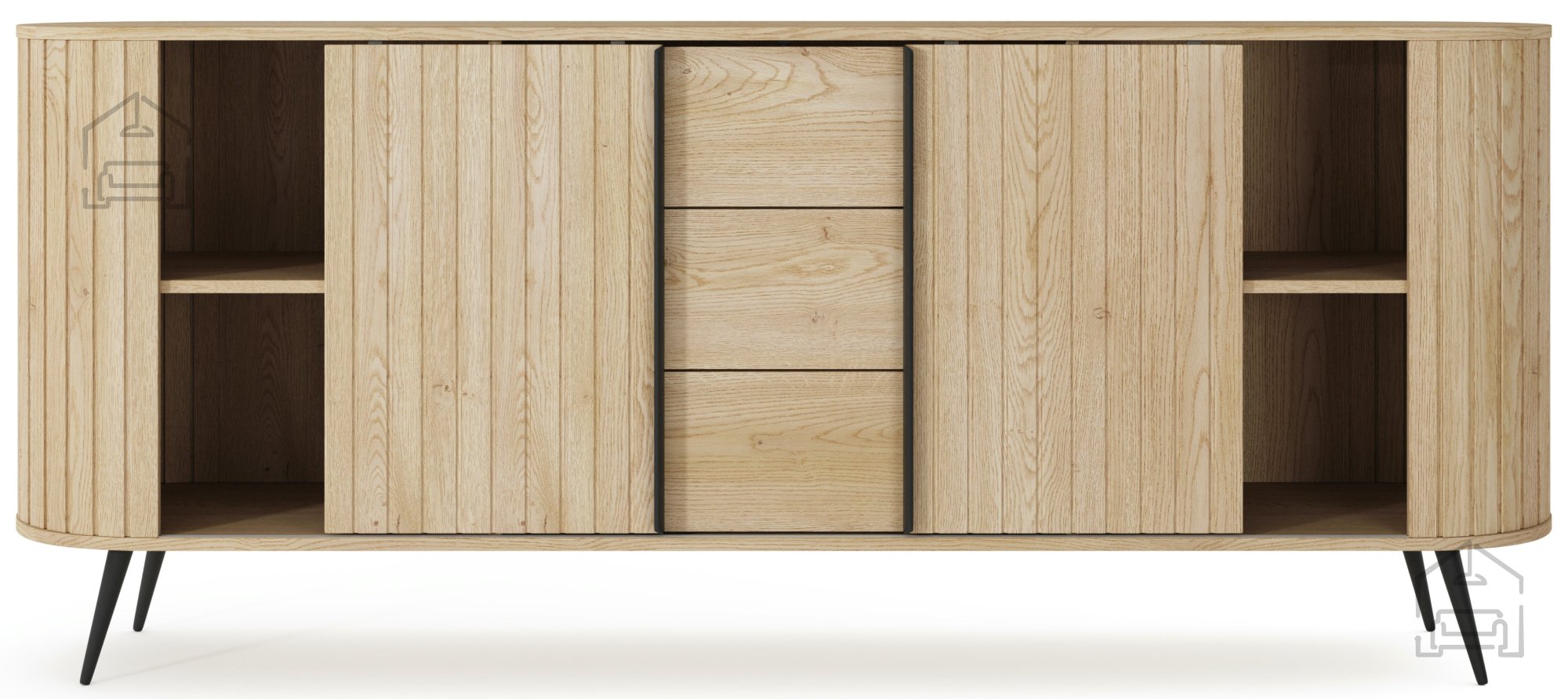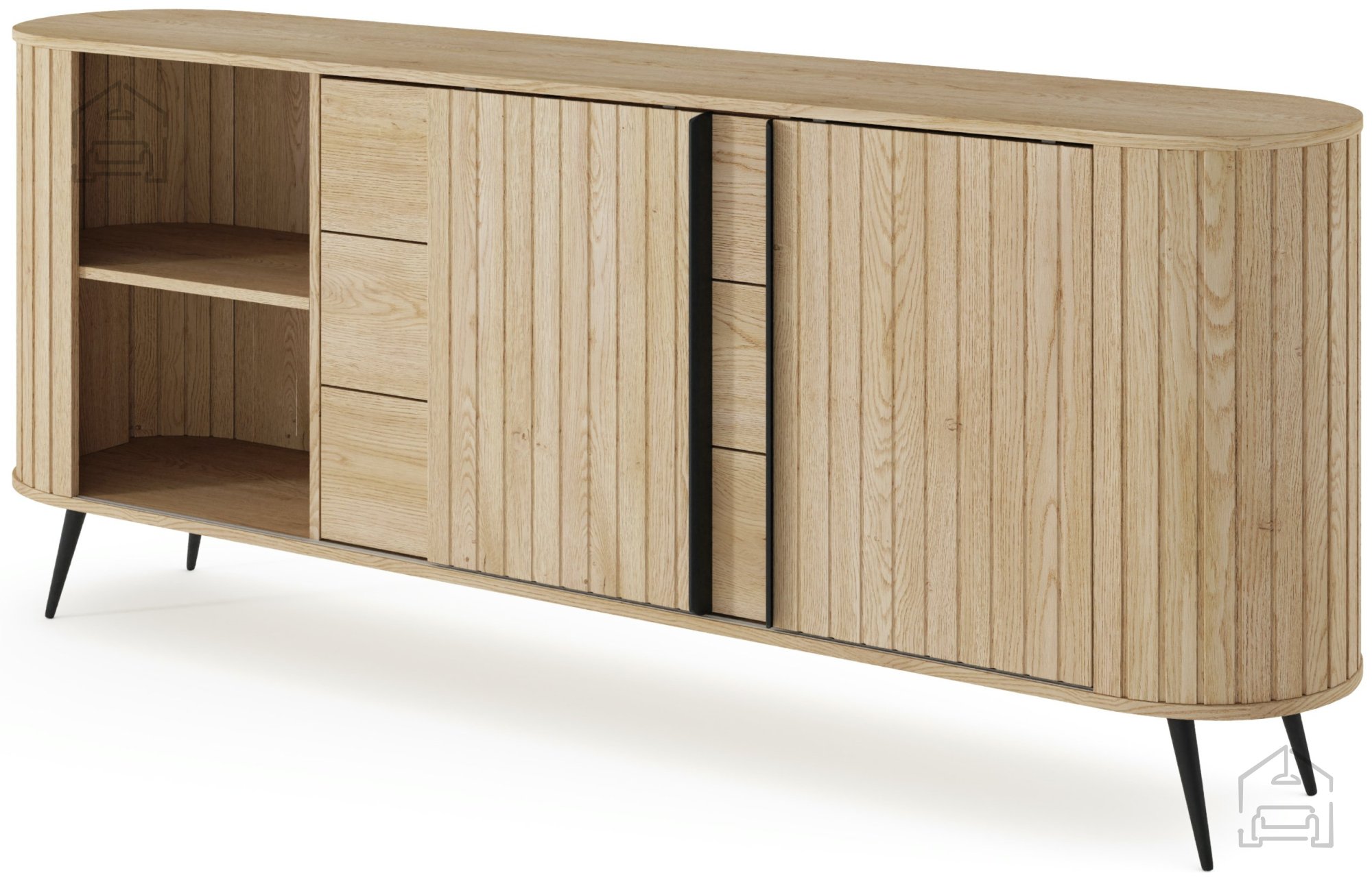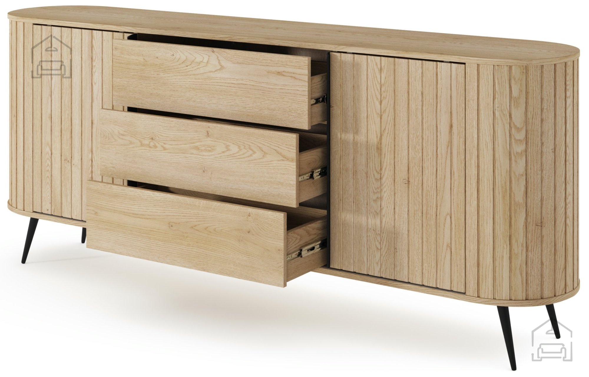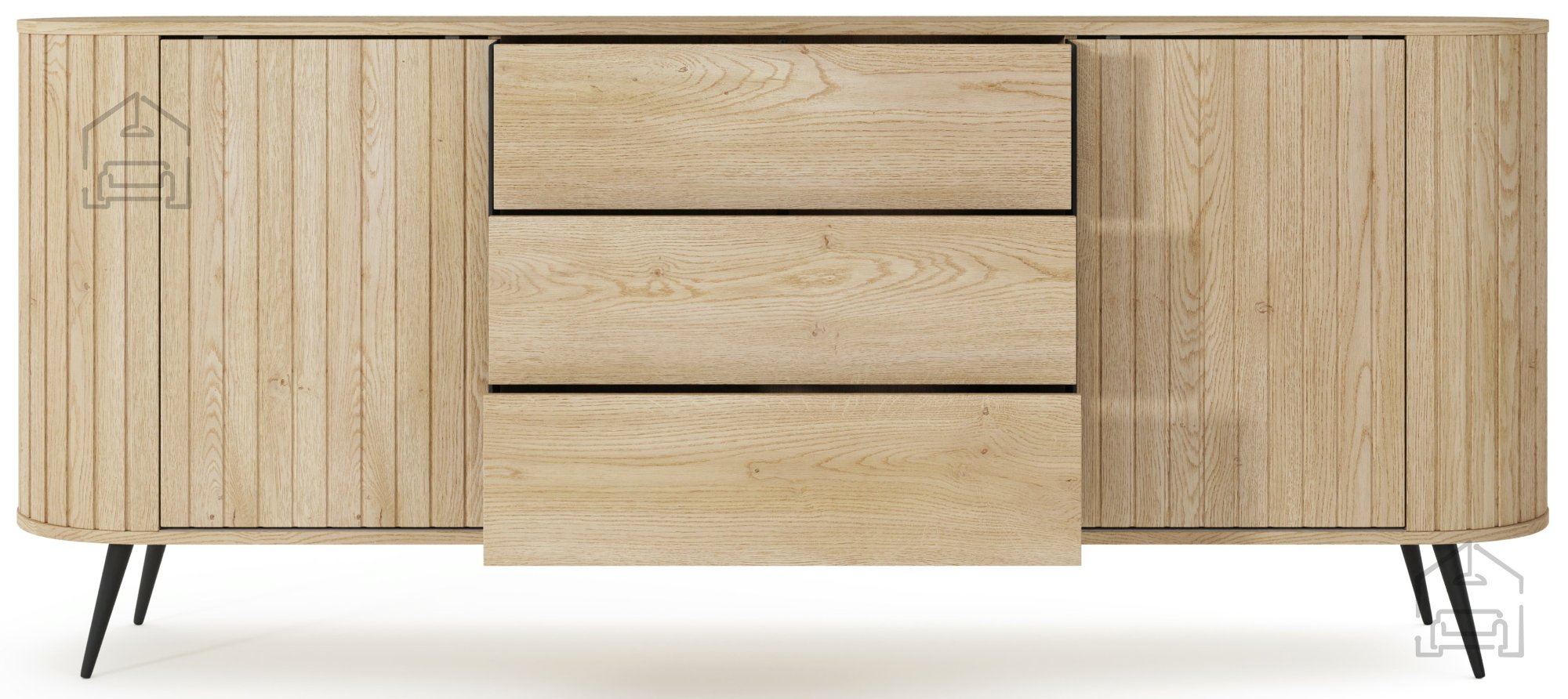 Die Kommode Lovi ist ideal für alle, die natürliche Holztöne und schlichte Eleganz schätzen. Trotz ihrer fast zwei Meter Länge wirkt sie dank der Metallfüße leicht und luftig. Das lässt den Raum offener erscheinen und erleichtert gleichzeitig die Reinigung. Die Oberfläche in Cremona Eiche zeigt eine feine Struktur, die an echtes Holz erinnert und für ein warmes, wohnliches Ambiente sorgt.