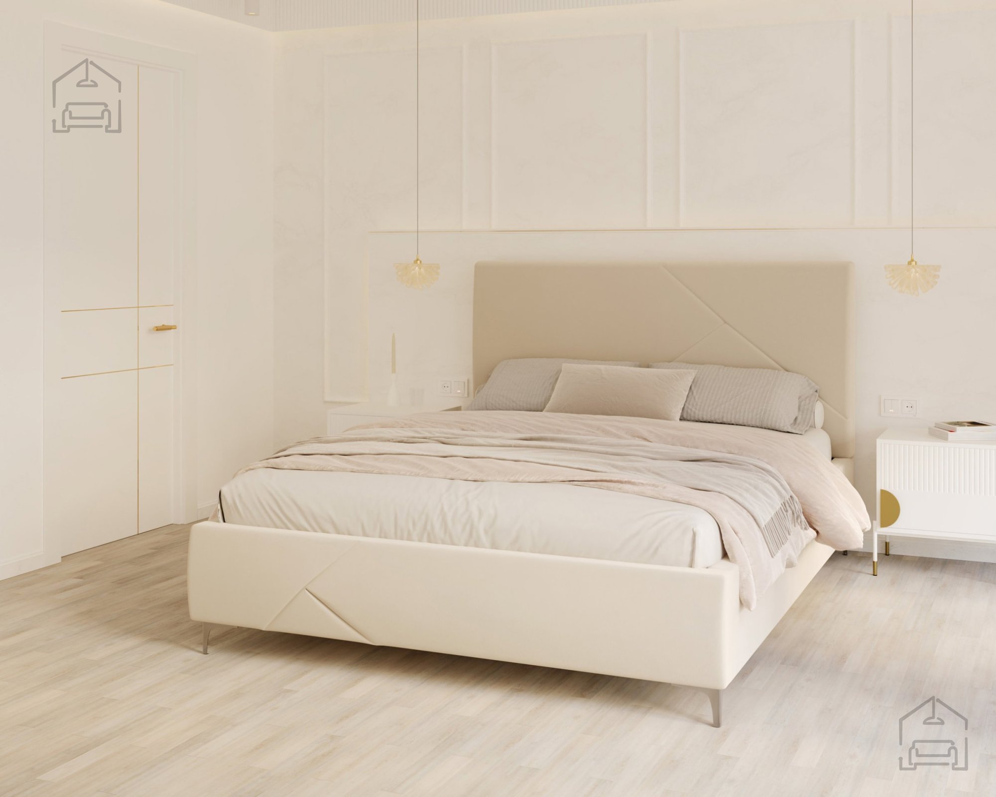 Abgerundet wird das Erscheinungsbild durch stilvolle Bettfüße, die dem Modell Leichtigkeit und optischen Charme verleihen. Dennoch bleibt die gesamte Konstruktion solide, da der Grundrahmen aus hochwertigem Holz und Spanplatte gefertigt ist – eine gelungene Kombination aus Stabilität und ästhetischer Eleganz.