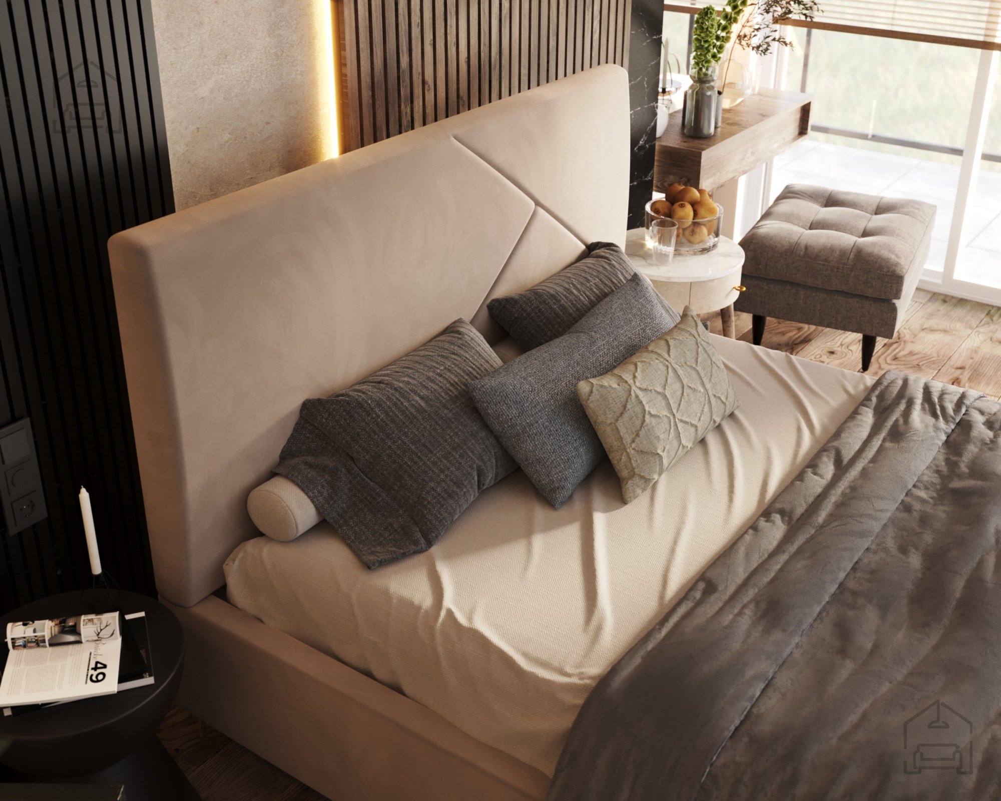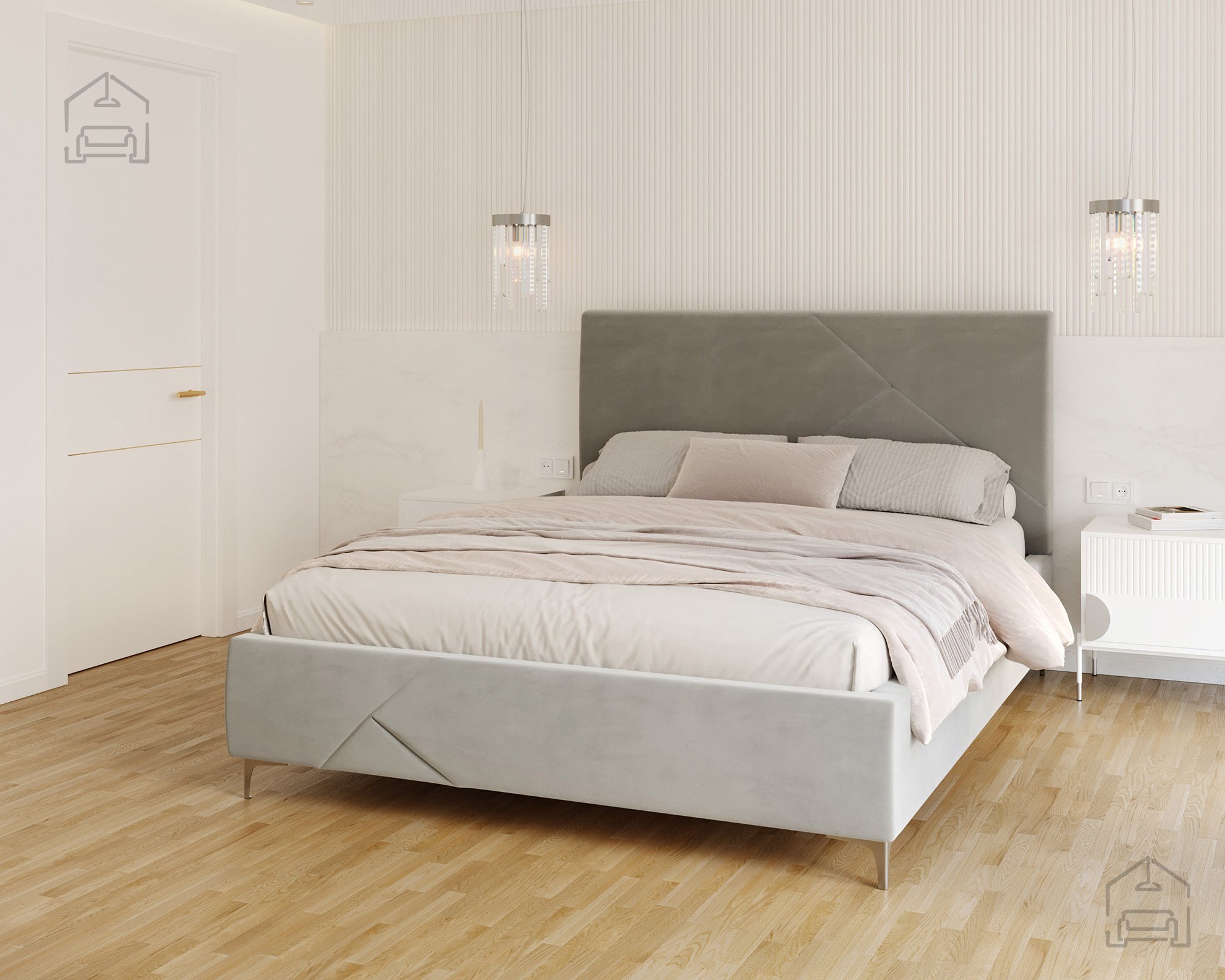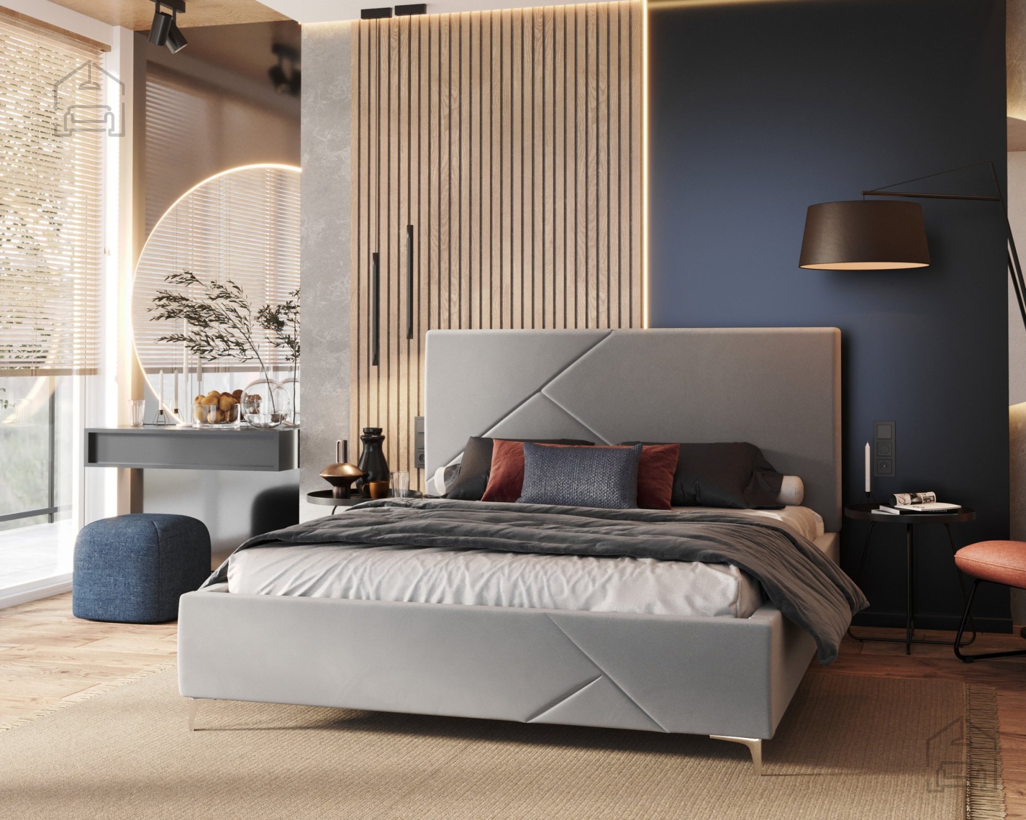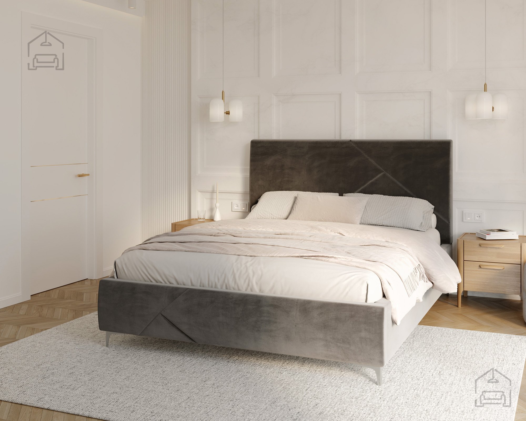 Der gepolsterte Rahmen ist in mehreren Farben erhältlich; auf dem Foto ist er in der Stoffausführung Paris Mouse gezeigt – ein weicher, eleganter Stoff, der hervorragend zu modernen und minimalistischen Einrichtungsstilen passt. Durch die Möglichkeit, Bezug und Farbe individuell zu wählen, lässt sich das Bett Navaro perfekt an den eigenen Geschmack und das Schlafzimmerambiente anpassen.