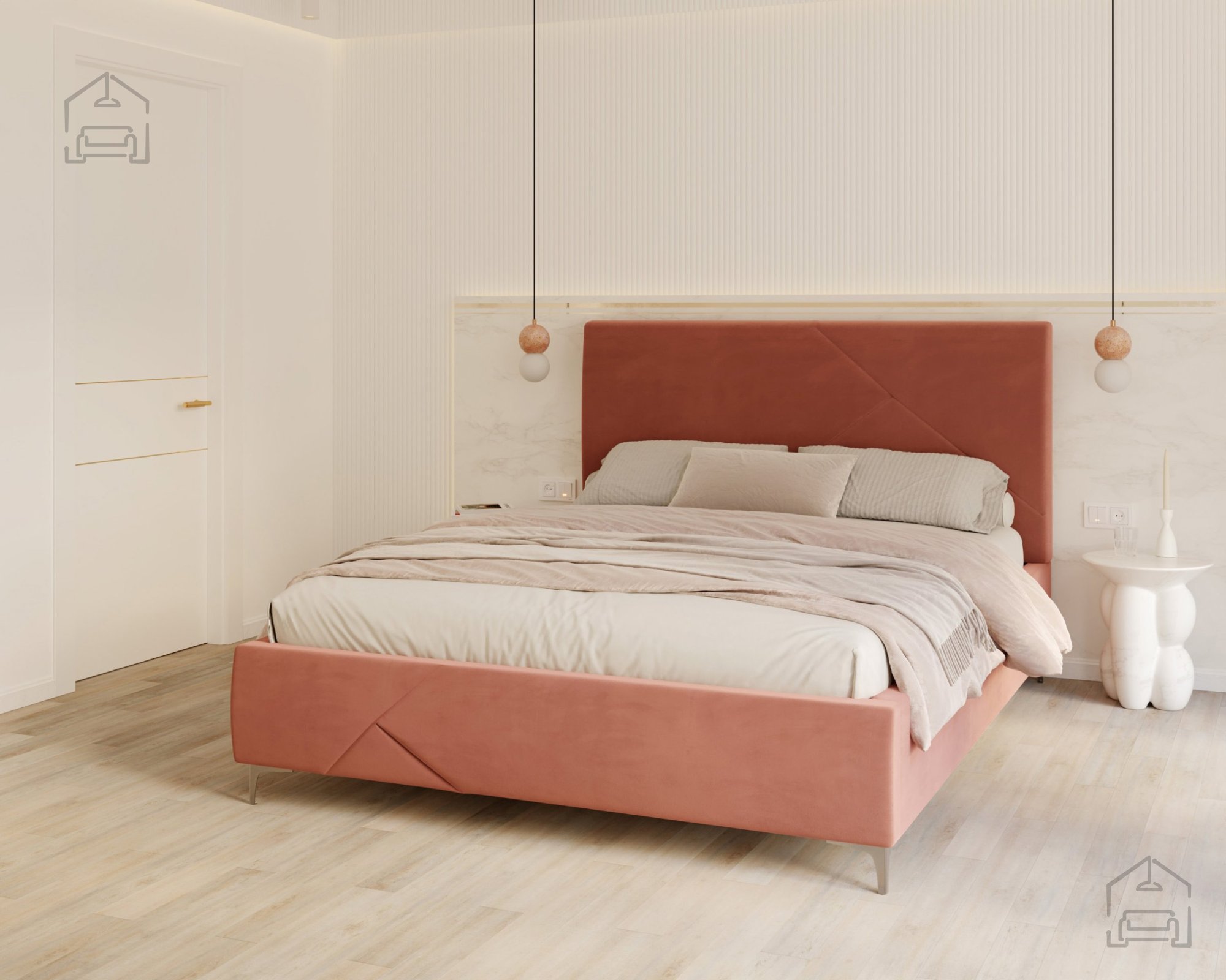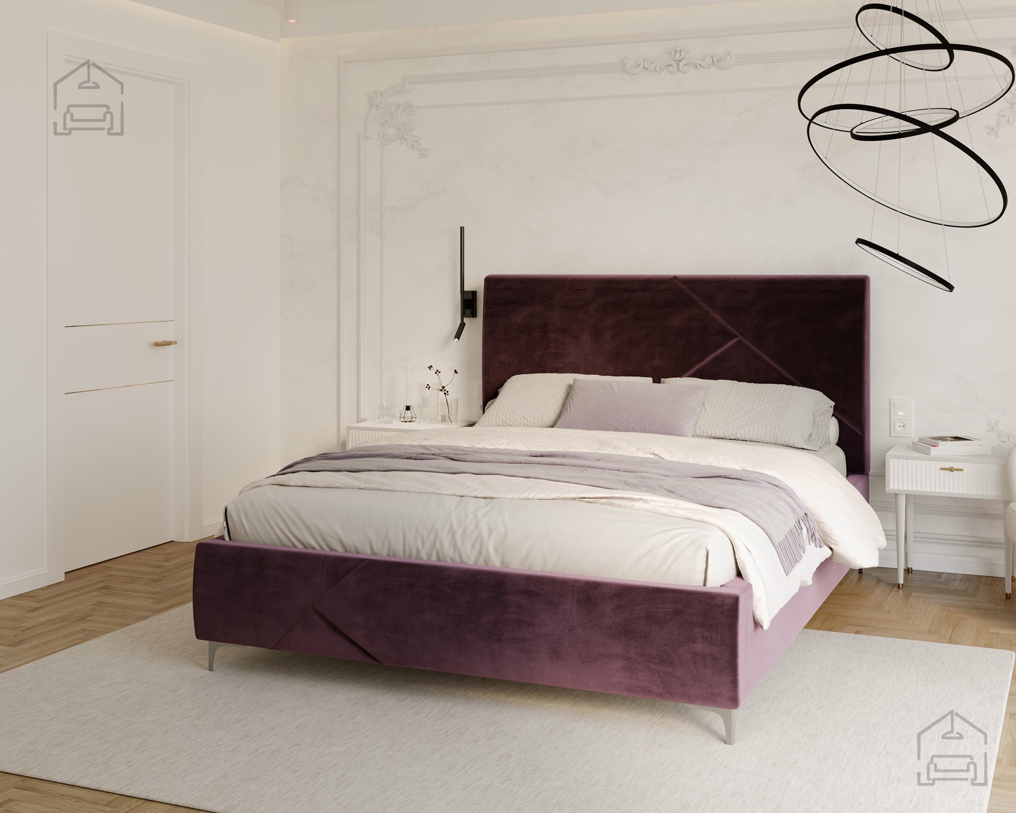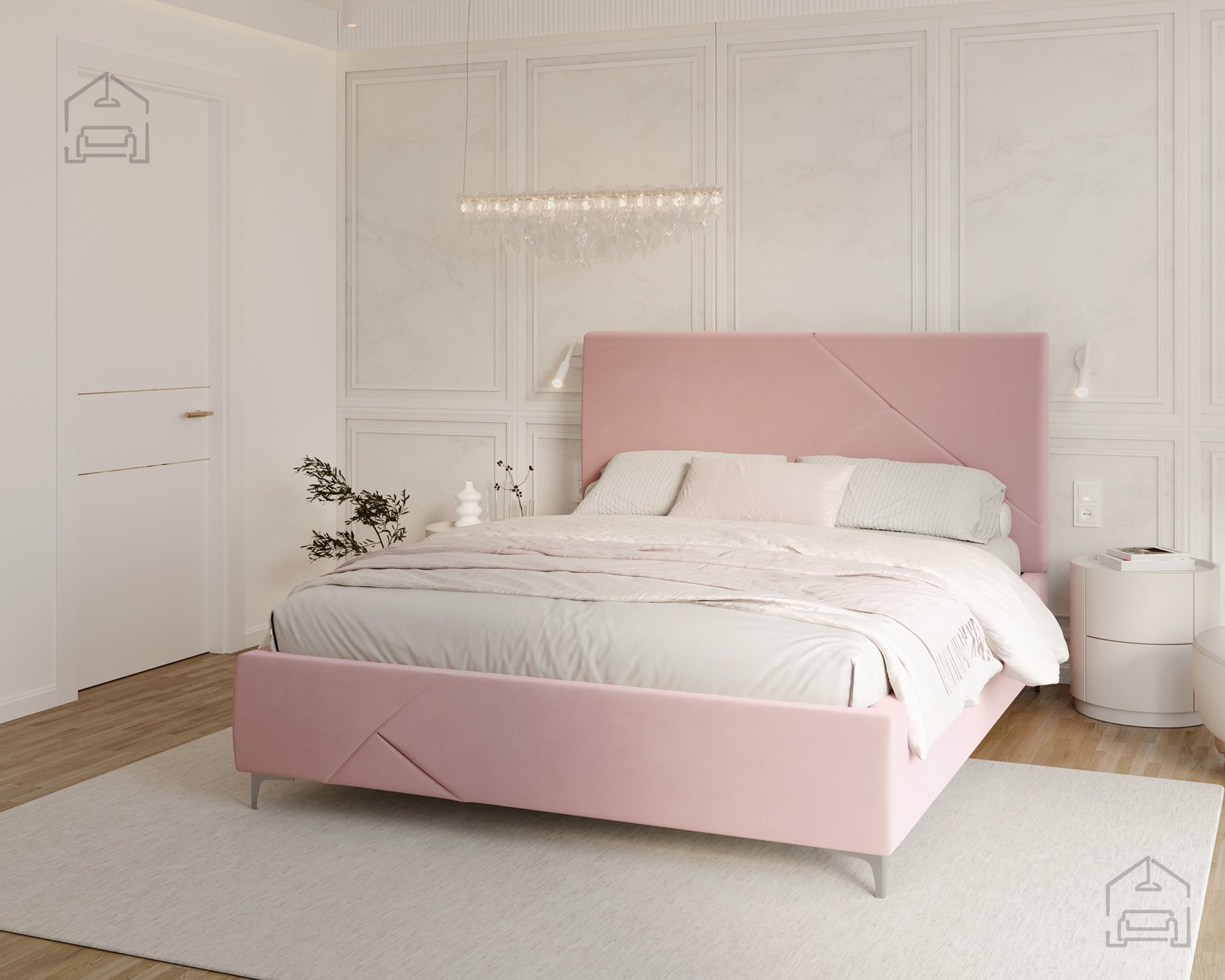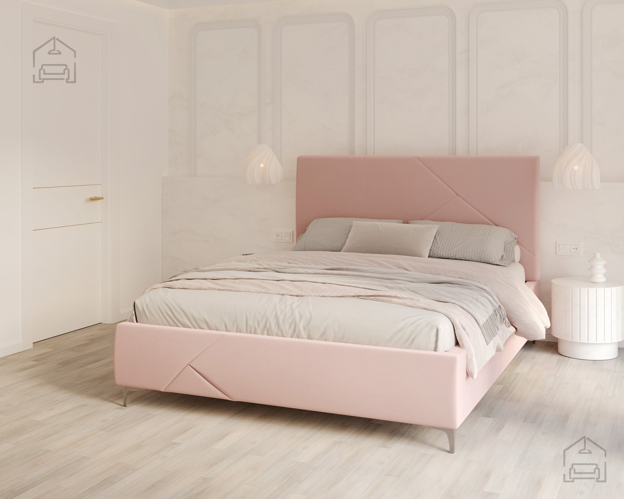 Der gepolsterte Rahmen ist in mehreren Farben erhältlich; auf dem Foto ist er in der Stoffausführung Paris Mouse gezeigt – ein weicher, eleganter Stoff, der hervorragend zu modernen und minimalistischen Einrichtungsstilen passt. Durch die Möglichkeit, Bezug und Farbe individuell zu wählen, lässt sich das Bett Navaro perfekt an den eigenen Geschmack und das Schlafzimmerambiente anpassen.