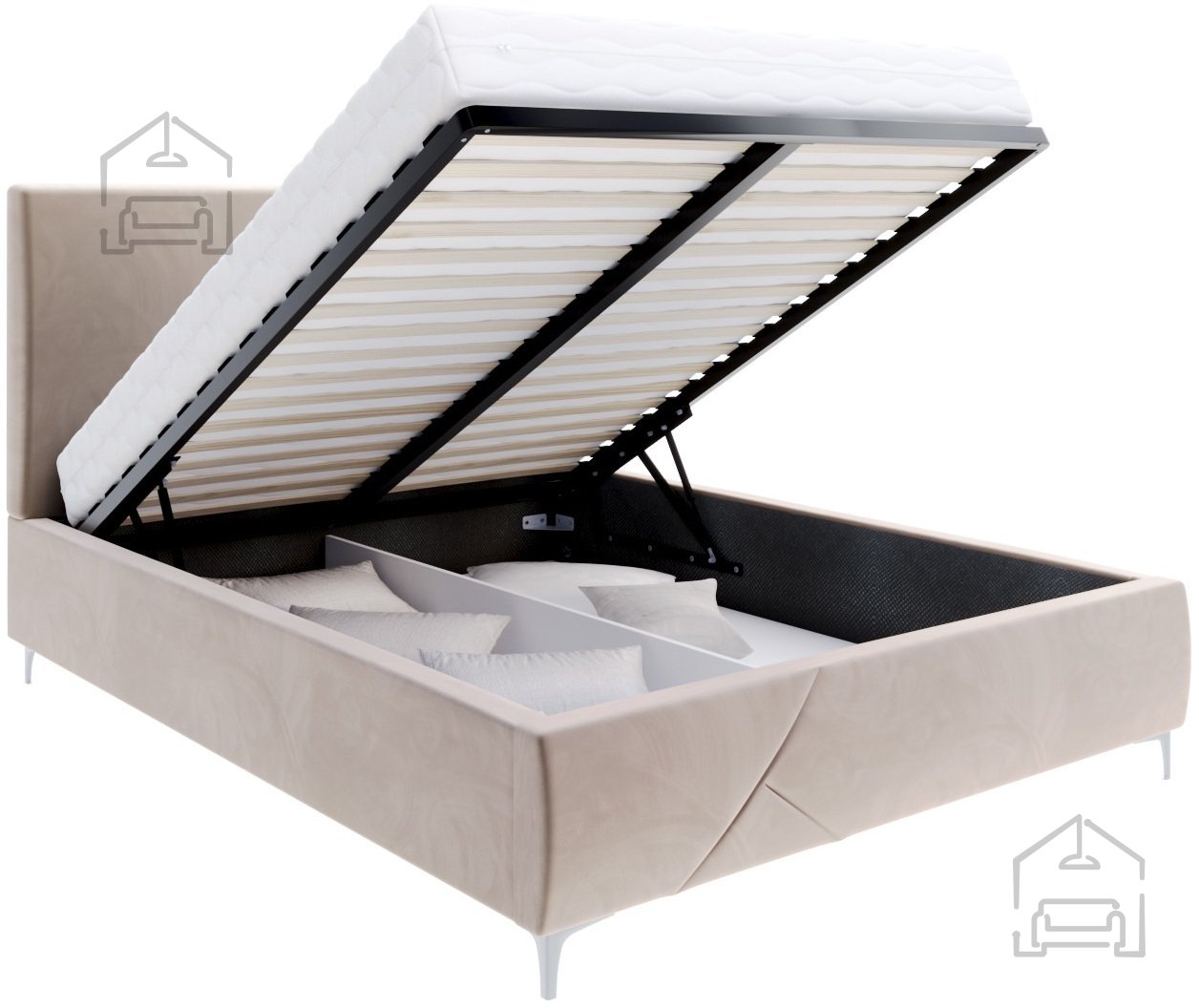 Unter dem Bett verbirgt sich ein großzügiger Stauraum, ergänzt durch einen hochwertigen Lattenrost. Gemeinsam bilden sie eine praktische Lösung für alle, die Funktionalität und Stil in einem Möbelstück vereinen möchten. Der Hebemechanismus funktioniert leichtgängig und sicher, ohne großen Kraftaufwand beim Anheben der Liegefläche.
