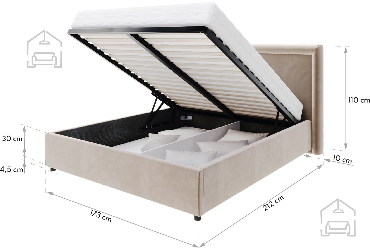 Ein besonderes Highlight des Bettes Nobile ist der integrierte Hebemechanismus, der einen einfachen Zugang zum geräumigen Bettkasten ermöglicht. Diese Lösung ist ideal für kleinere Schlafzimmer oder für alle, die zusätzlichen Stauraum wünschen, ohne auf Stil zu verzichten. Der Bettkasten bietet ausreichend Platz für Decken, Kissen oder saisonale Textilien und hilft dabei, Ordnung und ein gepflegtes Erscheinungsbild im Raum zu bewahren.