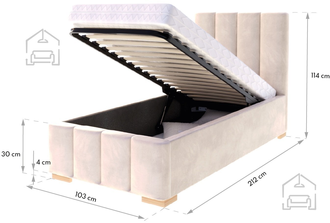 Das Modell Austin besteht aus einer Kombination aus T-25-Schaumstoff, Holz und Spanplatte – eine gelungene Balance zwischen Komfort und Stabilität. Die Liegefläche wird von einem robusten Stahl-Hebemechanismus getragen, der ein sicheres und leichtes Anheben des Rahmens ermöglicht. Dieses System ist auf hohe Belastungen ausgelegt und trägt so zur Langlebigkeit des Bettes bei. Zusätzliche Verstärkungen zwischen den einzelnen Elementen sorgen für Stabilität und verhindern Knarren – auch nach vielen Jahren der Nutzung.
