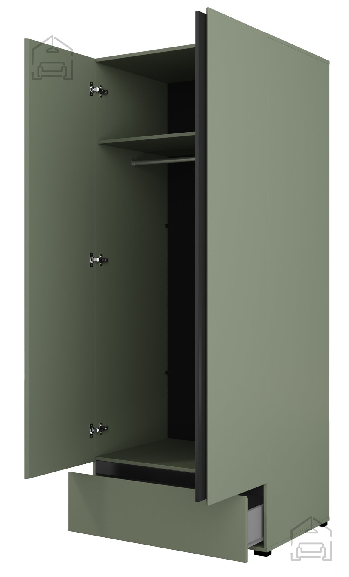 Das Innenleben des Kleiderschranks Cross S ist so gestaltet, dass Kleidung und Accessoires übersichtlich verstaut werden können. Hinter den beiden Türen verbirgt sich ein großzügiger Hauptbereich in elegantem Schwarz, der einen schönen Kontrast zur lebhaften grünen Außenseite bildet. Das obere Fach bietet Platz für saisonale Kleidung, Boxen oder Accessoires, während die Metallkleiderstange ideal zum Aufhängen von Hemden, Jacken und Kleidern ist. Unten befindet sich eine geräumige Schublade, die sich dank eines leisen Mechanismus sanft und geräuschlos öffnen lässt – perfekt auch für die Abendstunden. Die glatten Fronten ohne Griffe unterstreichen das klare, minimalistische Gesamtbild.