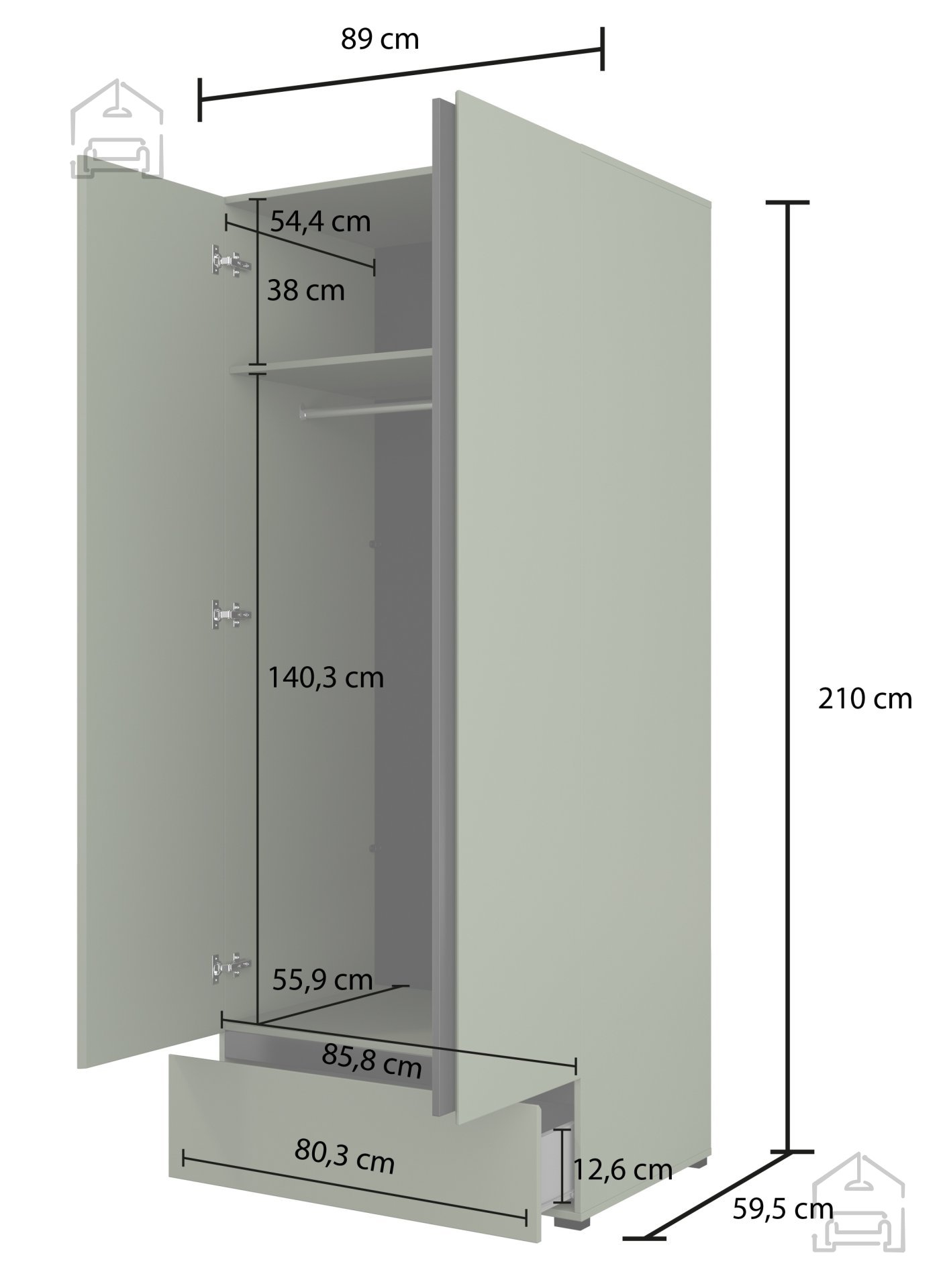 Der Kleiderschrank Cross S in Grün-Schwarz vereint Funktionalität, ansprechendes Design und solide Verarbeitung. Mit seinen Maßen von 89 × 60 × 210 cm nutzt er den vorhandenen Platz optimal und wirkt dank seiner schlanken, vertikalen Form sowohl in kleineren Vorzimmern als auch in großzügigen Schlafzimmern elegant. Gefertigt ist er aus einer 15 mm starken Möbelplatte, die für Stabilität und Robustheit sorgt. Die Rückwand besteht aus einer 3 mm HDF-Platte, welche das gesamte Möbel zusätzlich verstärkt und eine saubere Rückseite garantiert. Alle Kanten sind mit einer stoßfesten ABS-Umleimung versehen, die vor täglicher Abnutzung schützt und das gepflegte Erscheinungsbild lange erhält.