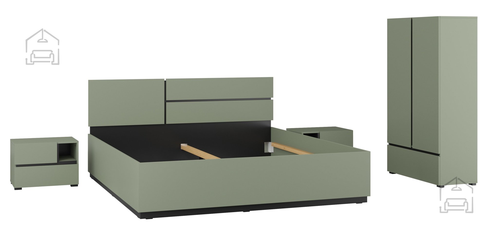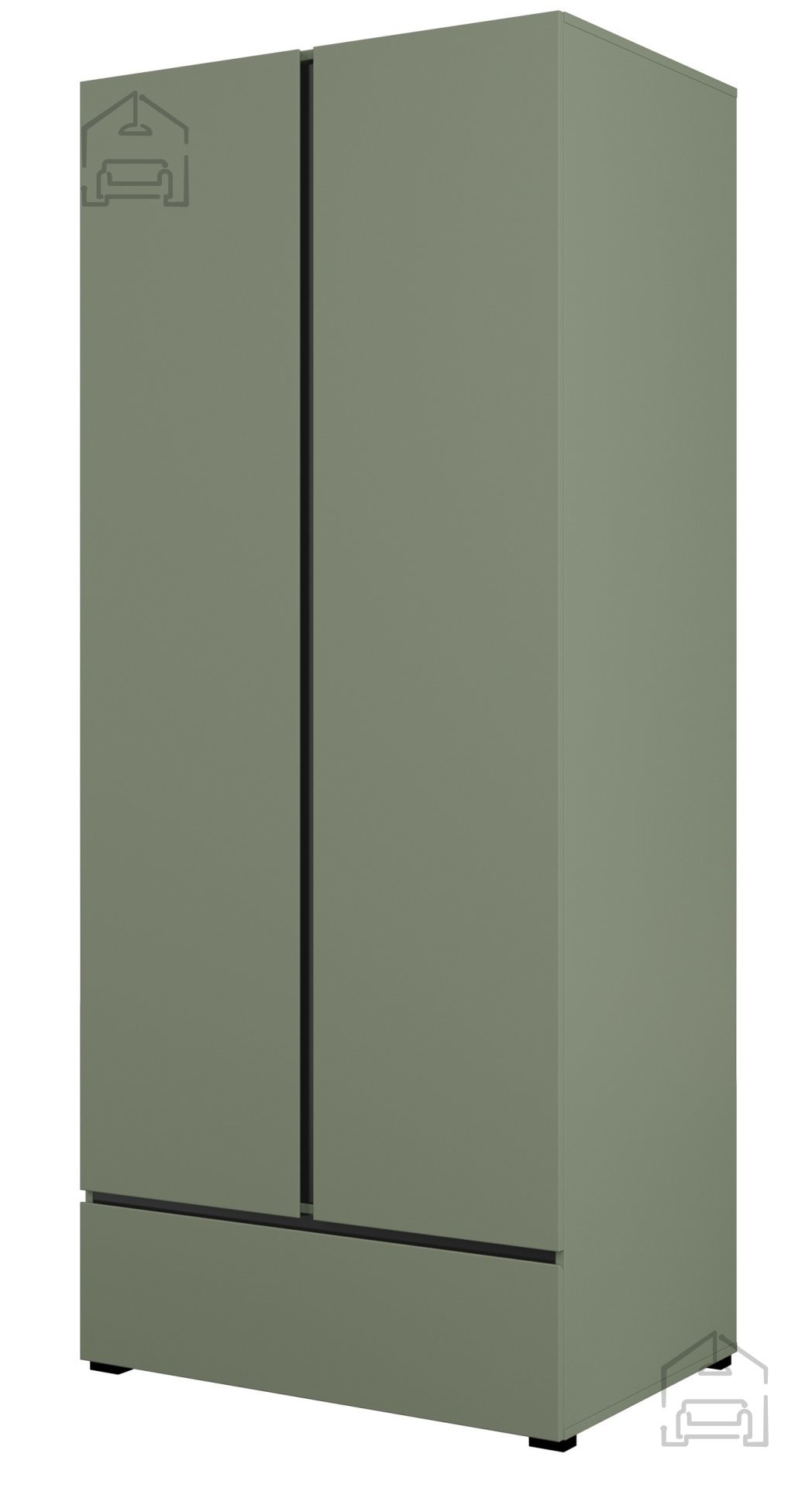 Die grüne Oberfläche in Kombination mit schwarzen Details verleiht dem Raum Frische und einen modernen Charakter. Diese Farbgestaltung schafft ein harmonisches Gleichgewicht zwischen natürlicher Wärme und einem Hauch von Industrial-Stil. Durch ihr ruhiges, aber markantes Erscheinungsbild passt der Schrank Cross S zu vielen Einrichtungsstilen – von modern und minimalistisch bis hin zu eklektisch, wo er als farblicher Akzent besonders gut zur Geltung kommt. Der Verzicht auf Griffe sorgt für eine einheitliche Front, erleichtert die Reinigung und wirkt zeitlos modern.
