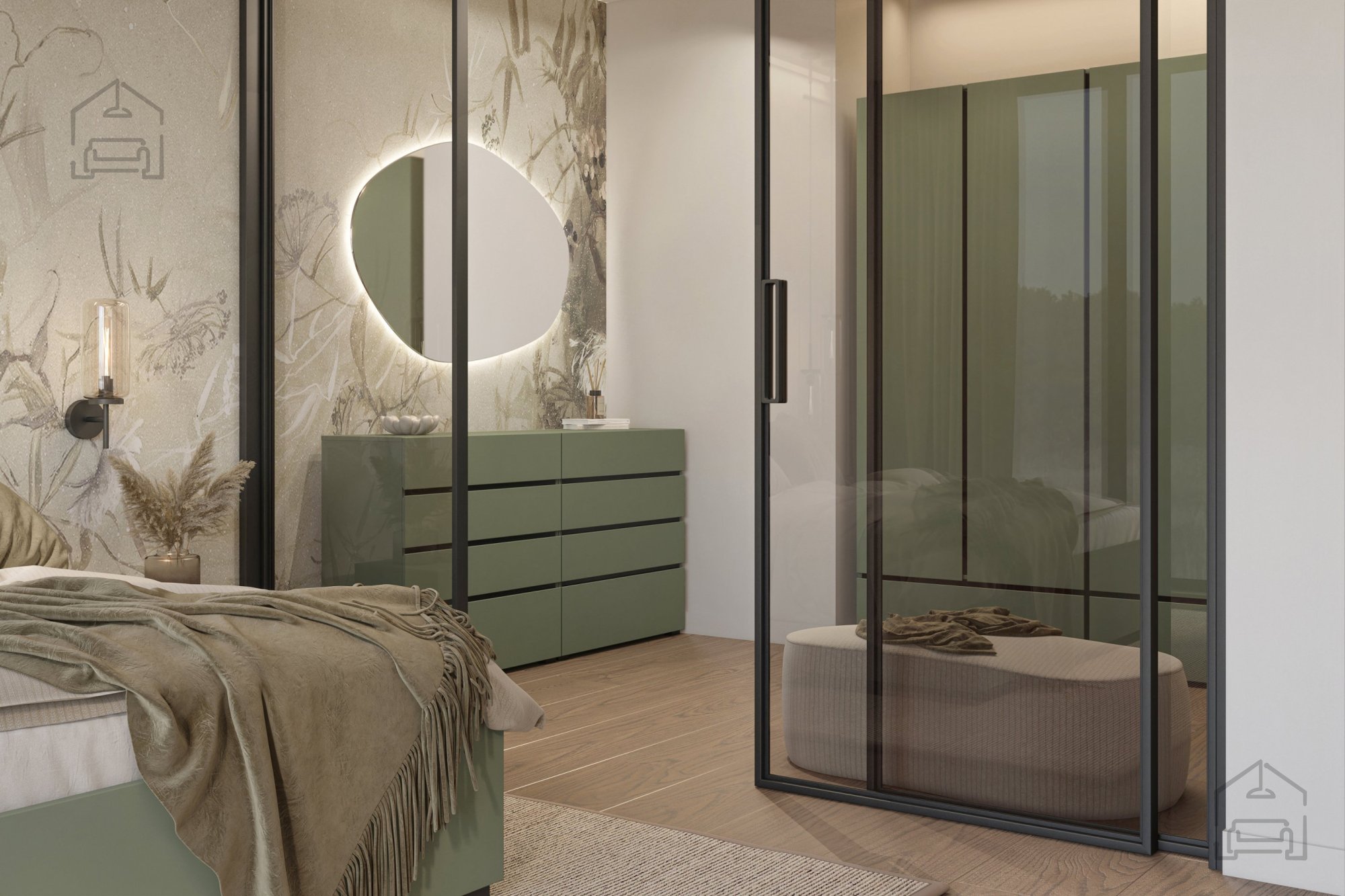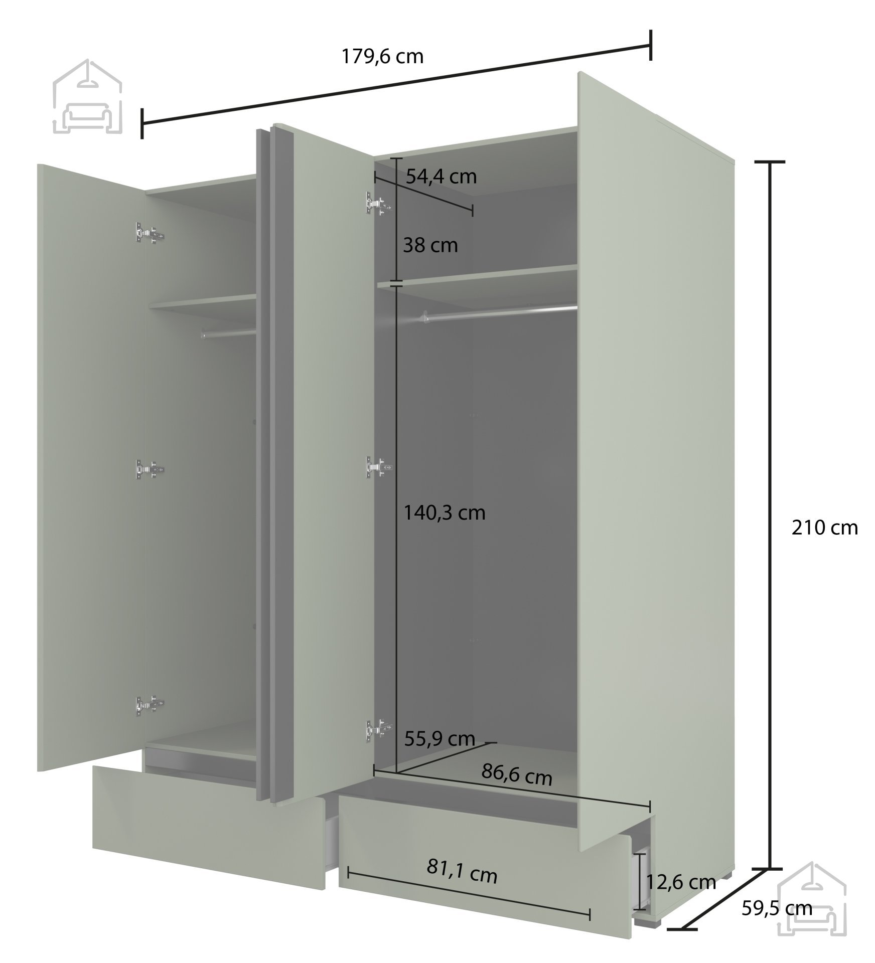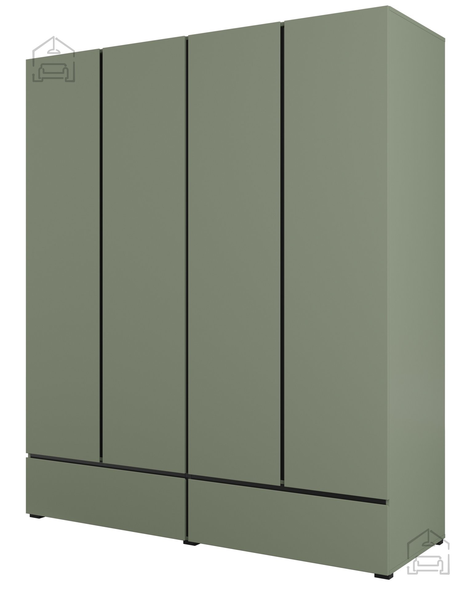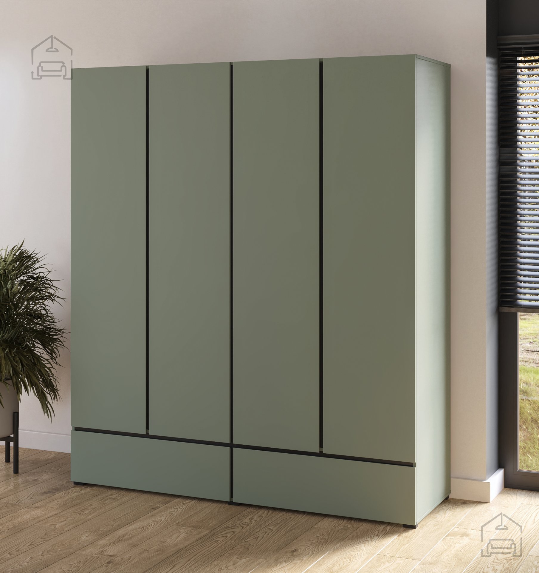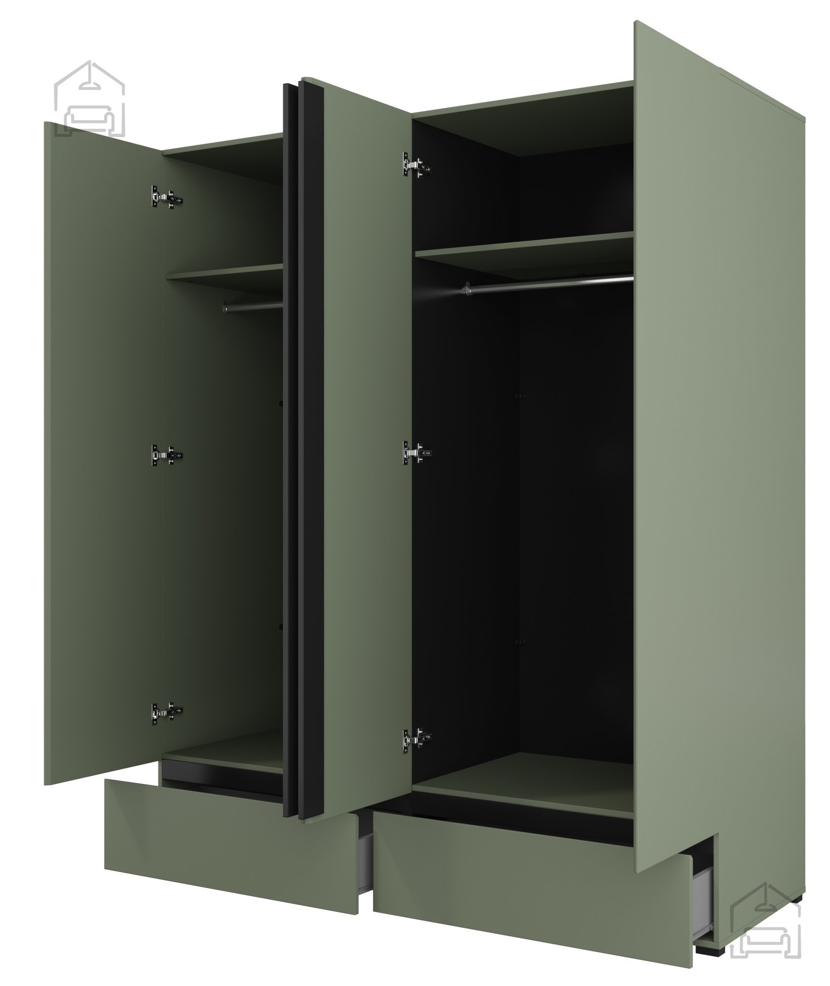 Der Kleiderschrank Cross S 2 besticht durch sein trendiges Grün, das mit eleganten schwarzen Akzenten harmonisch kombiniert ist. Er wurde so entworfen, dass er reichlich Stauraum für Kleidung, Accessoires und persönliche Gegenstände bietet und gleichzeitig für ein aufgeräumtes, stilvolles Ambiente sorgt. Produziert wird er in Polen in der renommierten Fabrik Helvetia meble, die für präzise Verarbeitung und hochwertige Materialien bekannt ist.