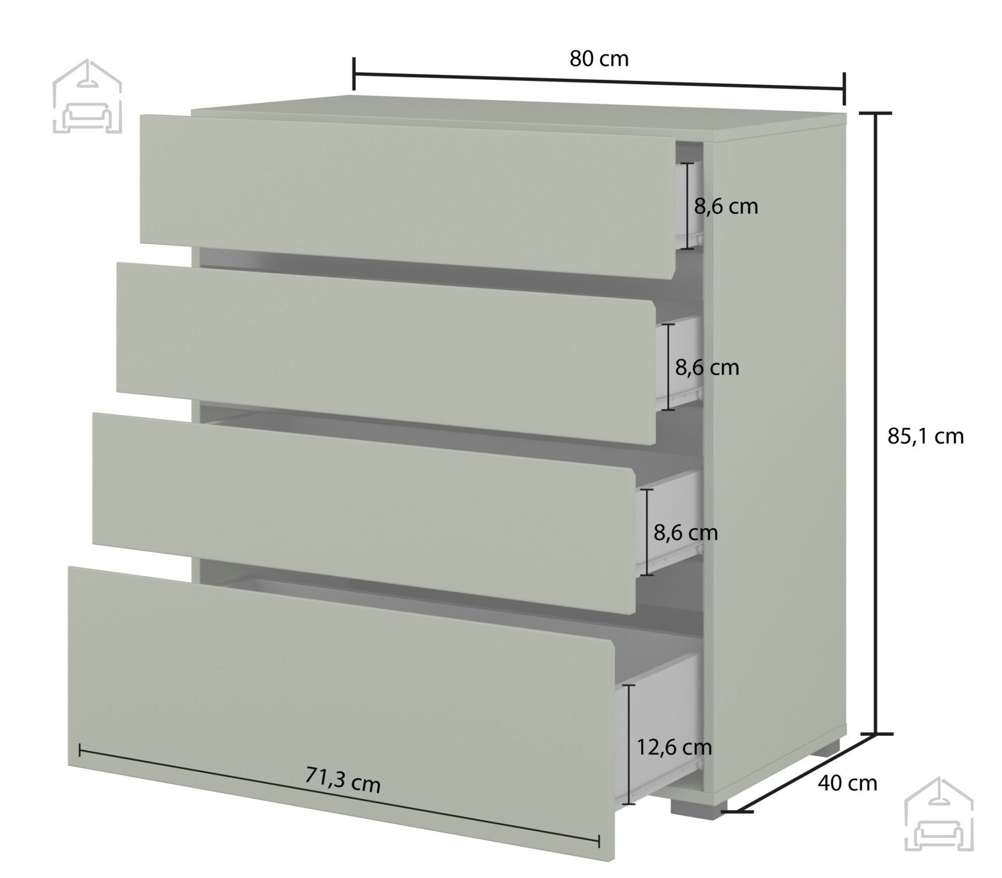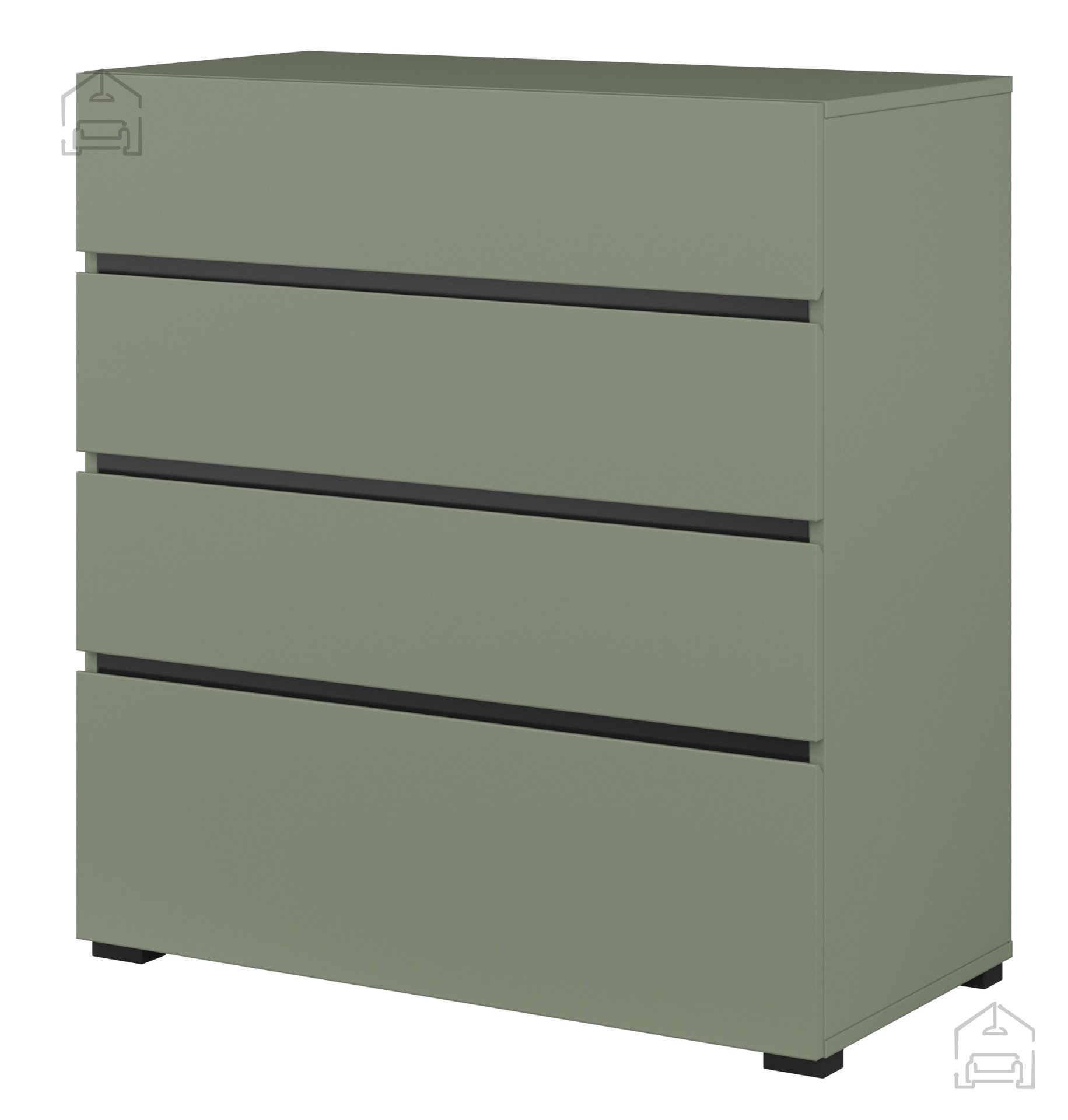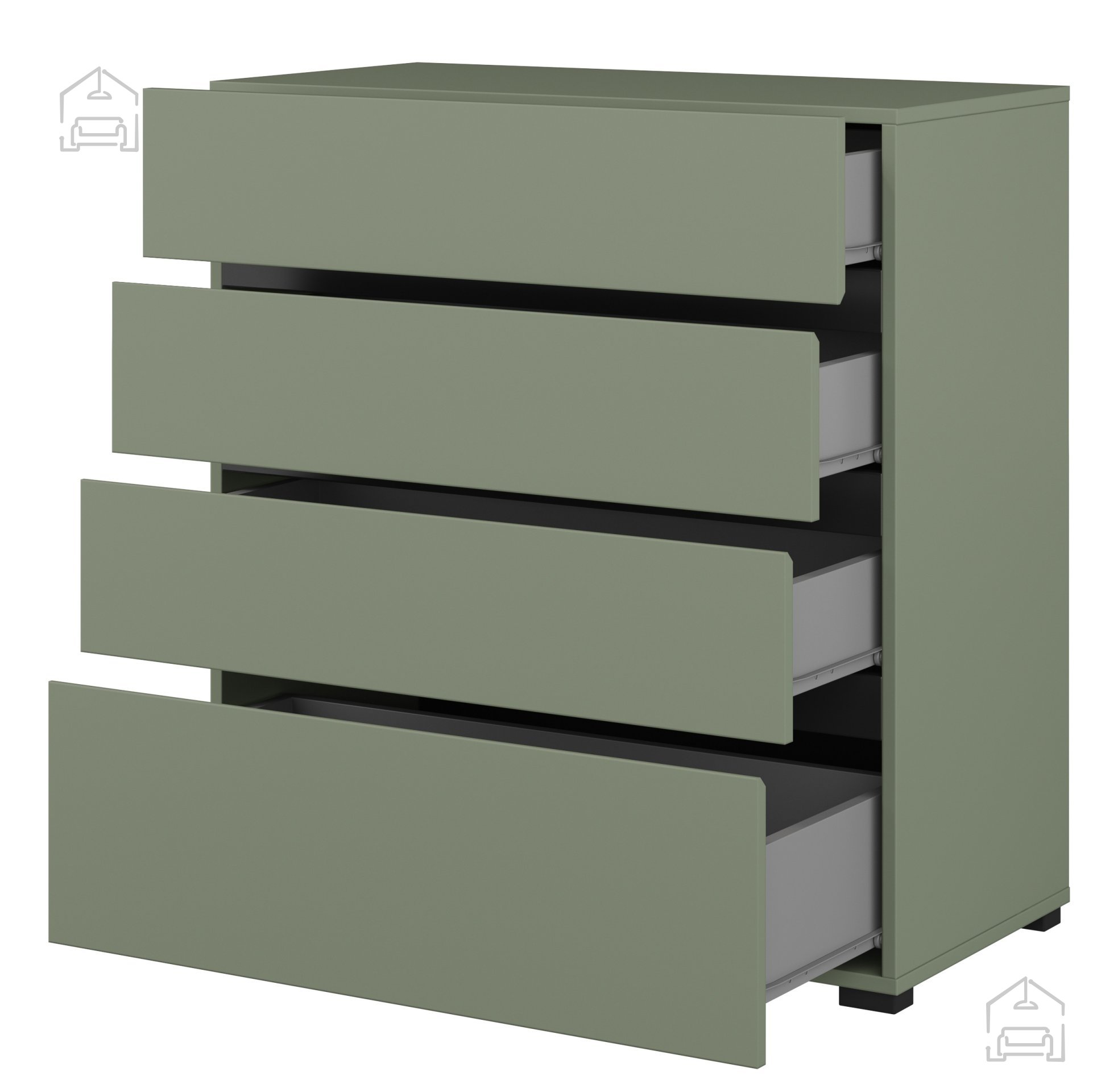 Die Kommode verfügt über vier großzügige Schubladen, die ausreichend Platz für verschiedenste Utensilien bieten. Die Schubladen lassen sich leichtgängig und leise öffnen, was die Handhabung besonders angenehm macht. Durch die übersichtliche Innenaufteilung eignet sie sich sowohl zur Aufbewahrung von Kleidung als auch für kleinere Haushaltsgegenstände, Dokumente oder Wohnaccessoires. Ihre praktische Größe kommt vor allem in kleineren Wohnungen gut zur Geltung, wo jeder Zentimeter zählt.