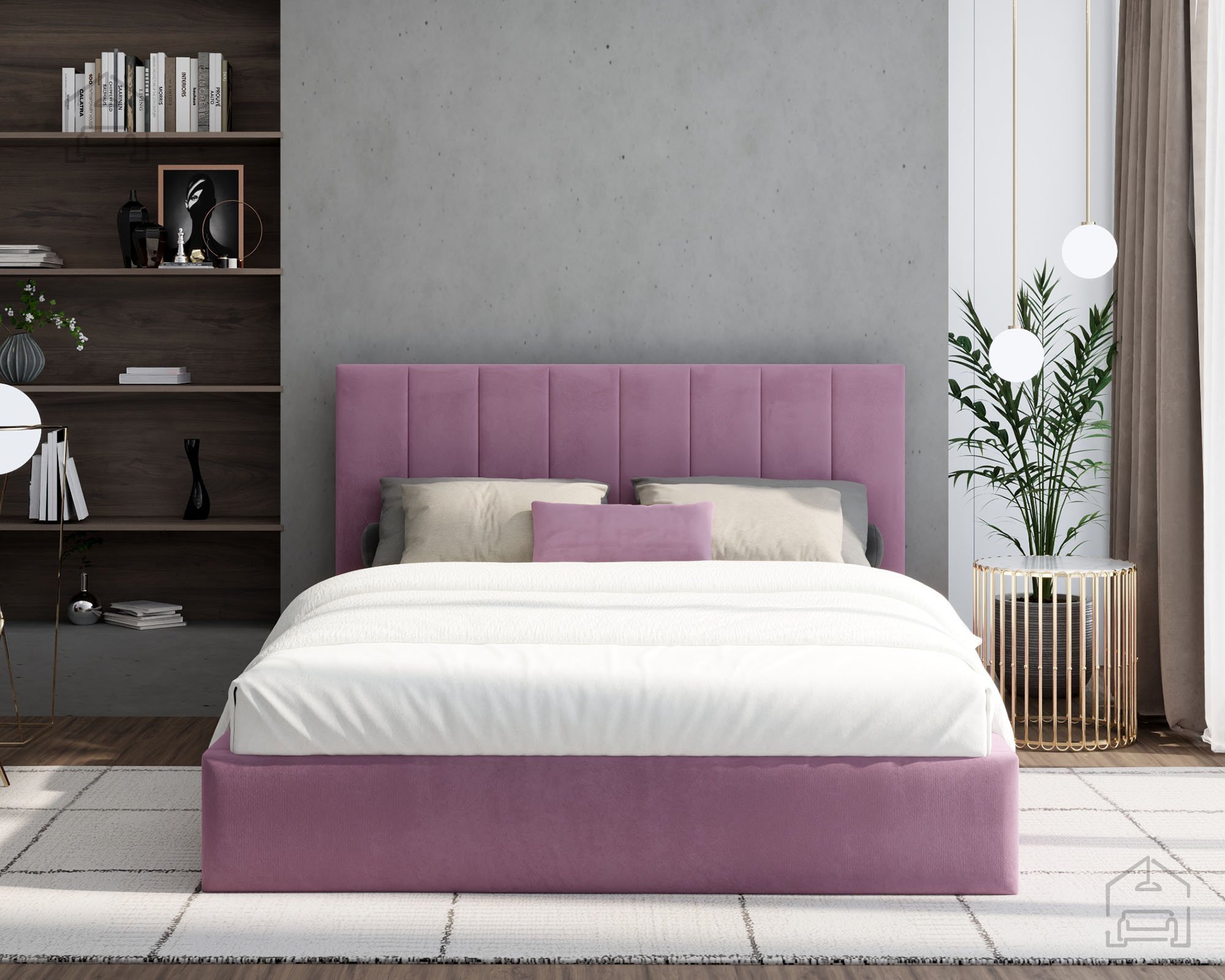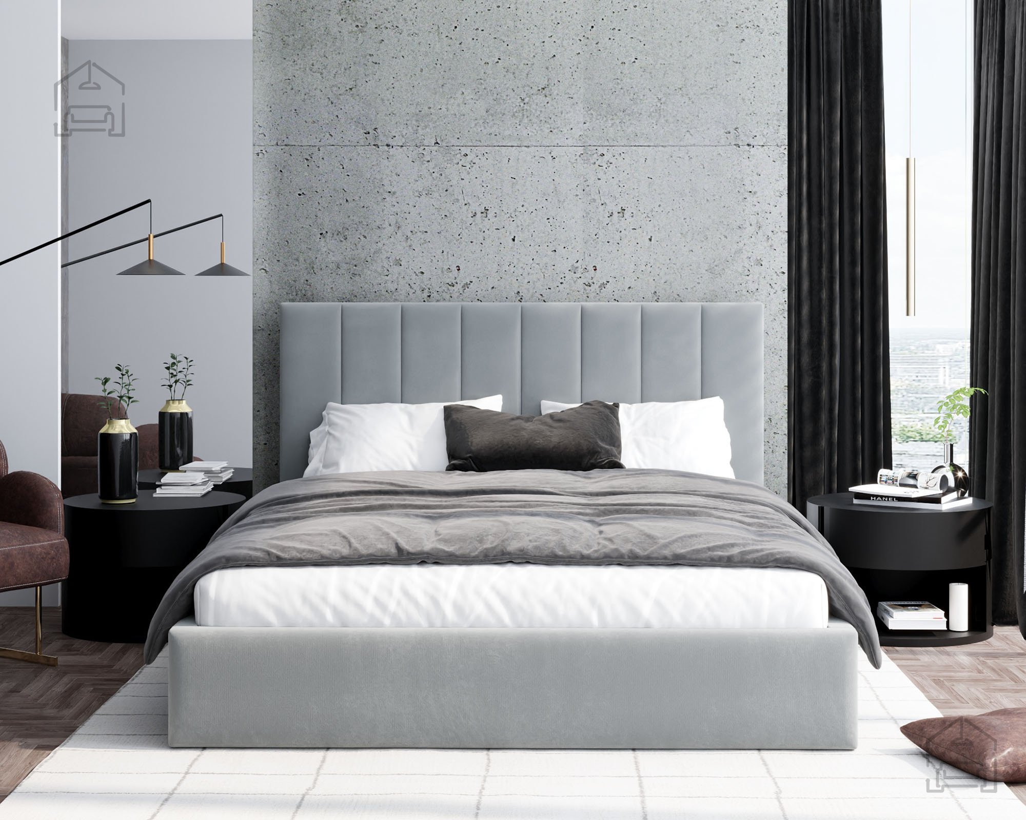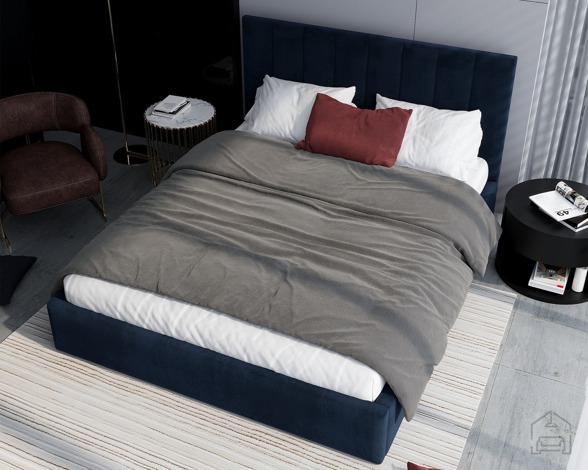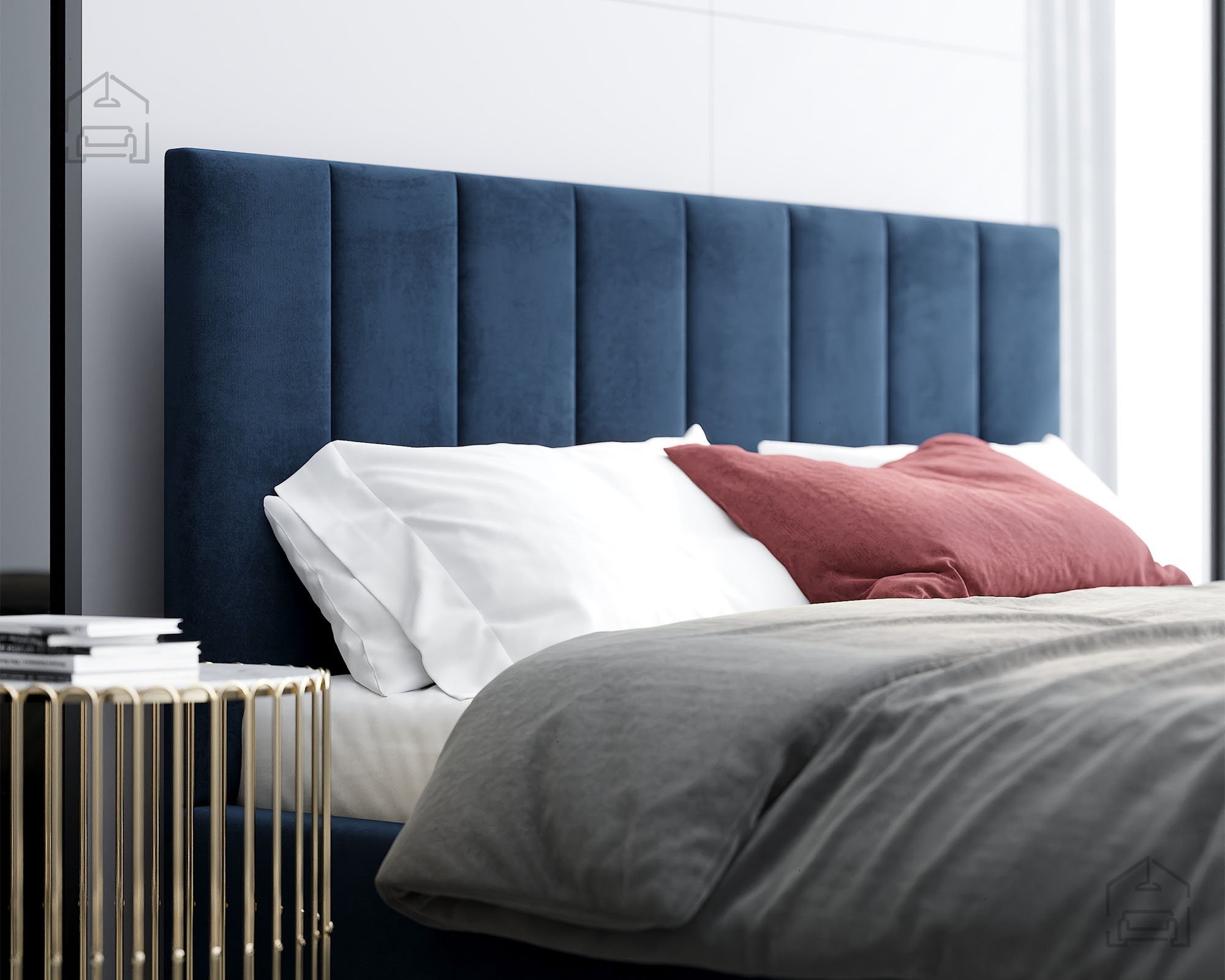 Der Rahmen des Bettes Justin ist vollständig gepolstert und verleiht dem Raum eine warme, einladende Atmosphäre. Auf dem Bild ist der Stoff Paris Deep Blue zu sehen, dessen tiefes Blau moderne Eleganz ausstrahlt und sich harmonisch in verschiedene Einrichtungsstile einfügt. Das Bett ist in mehreren Farben erhältlich, sodass es sich leicht an unterschiedliche Geschmäcker und Farbkonzepte im Schlafzimmer anpassen lässt.