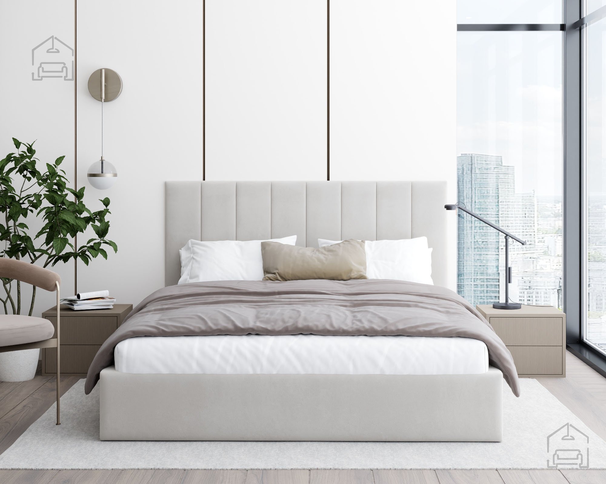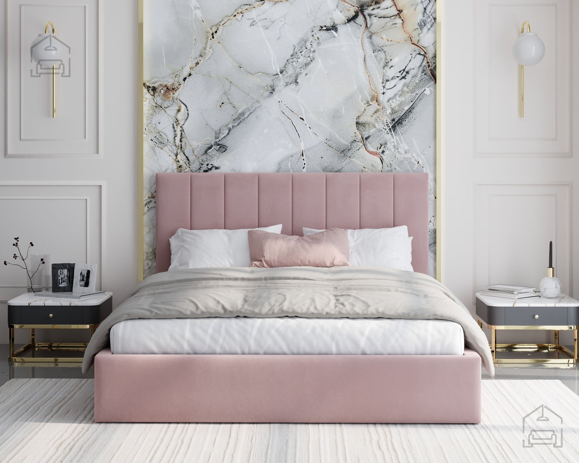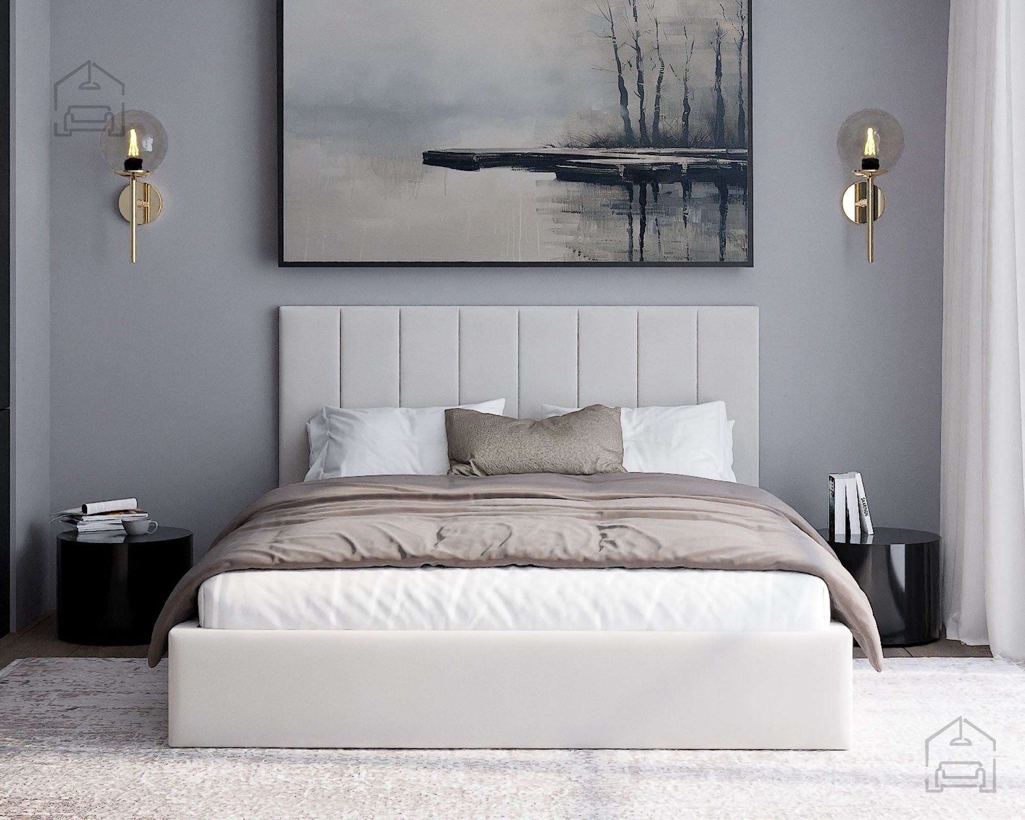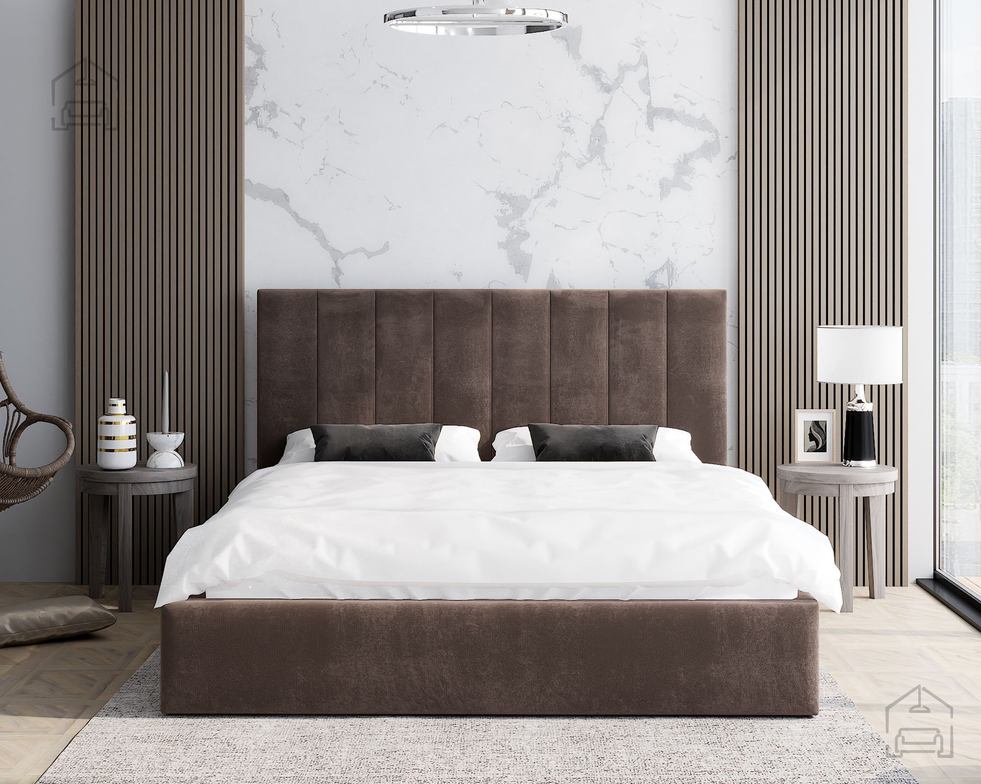 Der Rahmen des Bettes Justin ist vollständig gepolstert und verleiht dem Raum eine warme, einladende Atmosphäre. Auf dem Bild ist der Stoff Paris Deep Blue zu sehen, dessen tiefes Blau moderne Eleganz ausstrahlt und sich harmonisch in verschiedene Einrichtungsstile einfügt. Das Bett ist in mehreren Farben erhältlich, sodass es sich leicht an unterschiedliche Geschmäcker und Farbkonzepte im Schlafzimmer anpassen lässt.