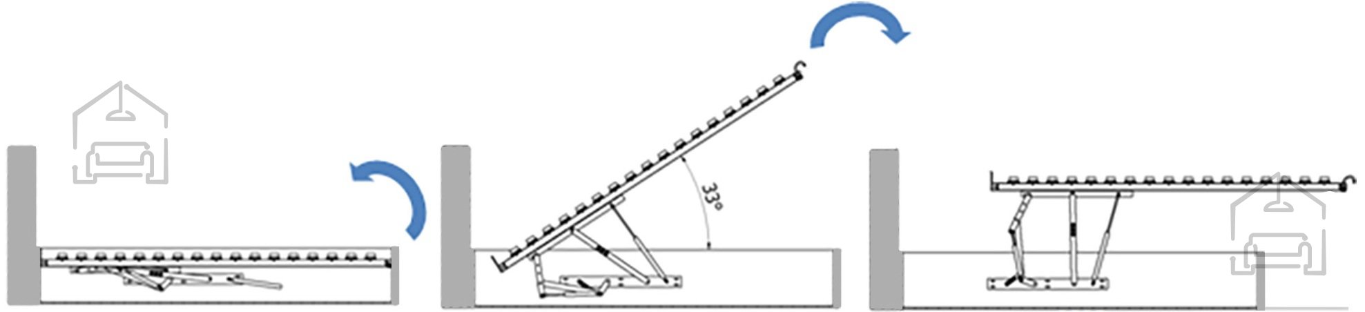 Das Bett Justin überzeugt mit einem besonders praktischen Hebesystem. Der Holzmechanismus hebt die Liegefläche parallel zum Bettrahmen an und sorgt so für einen bequemen Zugriff auf den Stauraum. Dieser reicht bis zum Boden und bietet ausreichend Platz für Bettwäsche, Decken oder saisonale Kleidung. Da der Boden des Stauraums direkt auf dem Boden aufliegt, können auch schwerere Gegenstände sicher verstaut werden, ohne die Konstruktion zu belasten.