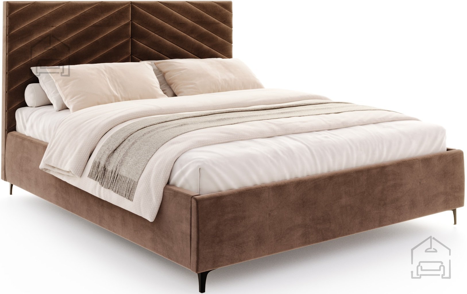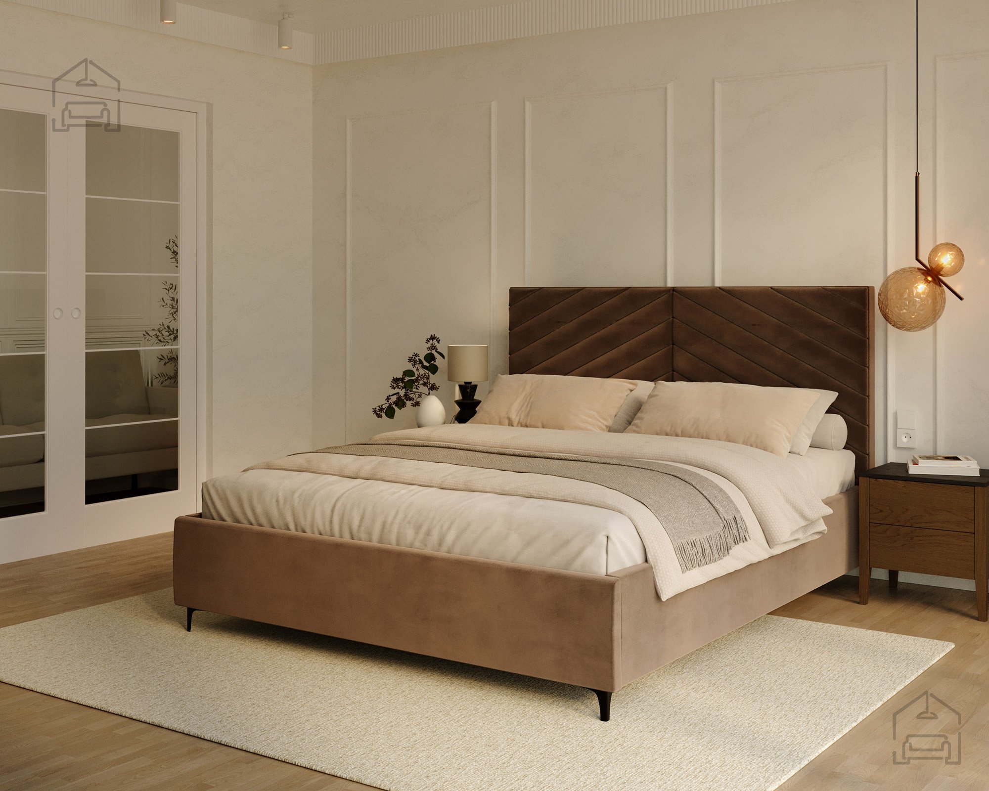 Das Polster kann in verschiedenen Farben und Stoffarten gewählt werden, wodurch sich das Erscheinungsbild individuell an das Schlafzimmer anpassen lässt. Der Stoff Trinity Brown, wie auf dem Bild gezeigt, vereint warme Naturtöne mit einer weichen, angenehmen Oberfläche. In Kombination mit dezenten dekorativen Füßen wirkt das Bett leicht und zugleich elegant. Alle Komponenten sind auf Langlebigkeit und einfache Pflege ausgelegt.