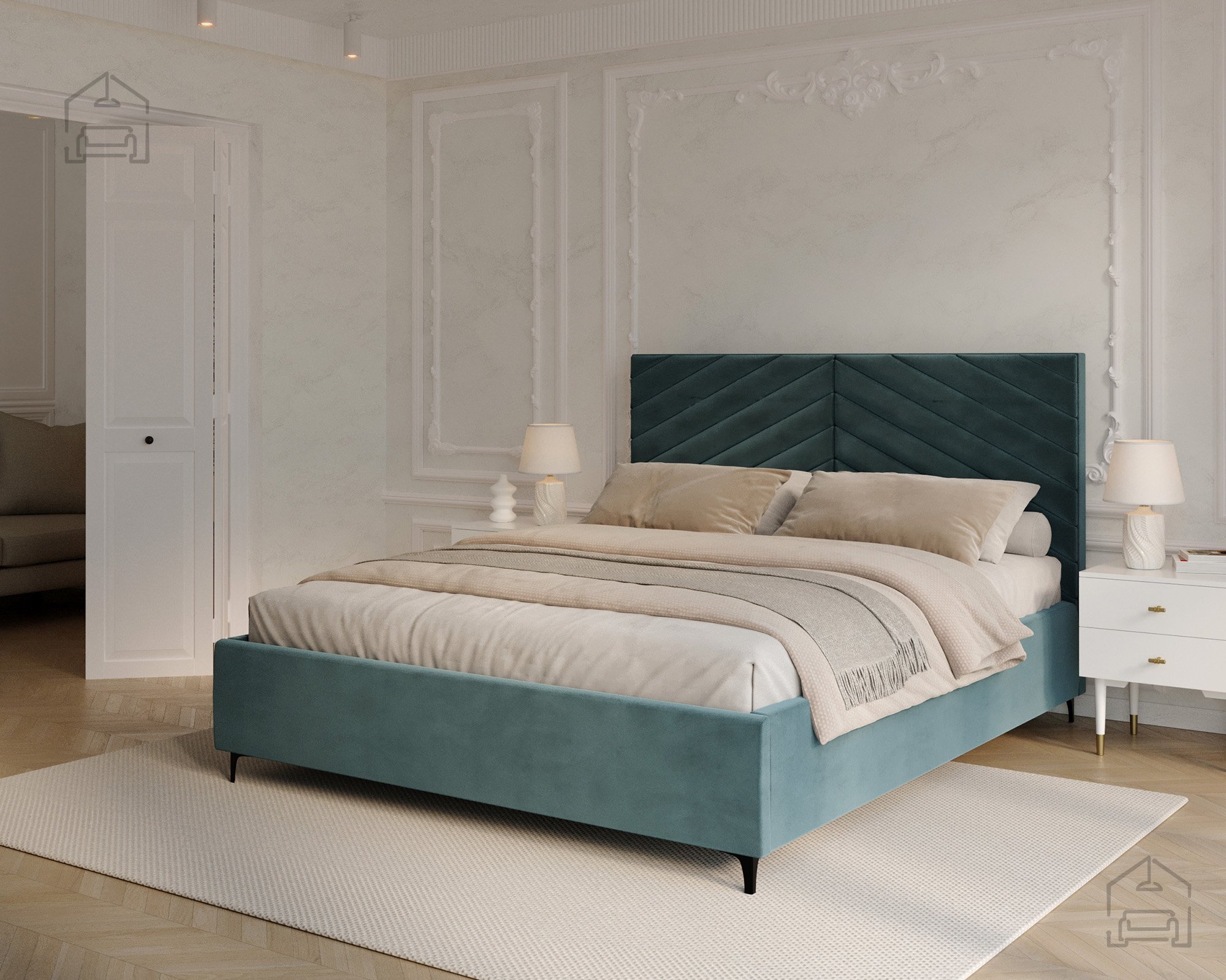 Neben seiner Funktionalität überzeugt das Bett auch durch gestalterische Details. Das breite, weich gepolsterte Kopfteil ist eines der markantesten Merkmale des Modells. Es lehnt sich sanft an die Wand und lädt zum gemütlichen Anlehnen beim Lesen oder Fernsehen ein. Die eleganten Nähte und die angenehme Stoffstruktur unterstreichen den modernen Charakter des Bettes, das sich wunderbar mit edleren Einrichtungsstilen kombinieren lässt.