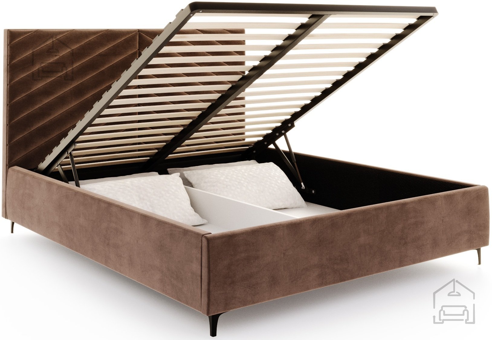 Der praktische Aspekt, wie der großzügige Stauraum, trägt zusätzlich zur Ordnung im Zuhause bei. Der Bettkasten eignet sich ideal für Bettwäsche, zusätzliche Decken oder Dinge, die Sie griffbereit, aber nicht sichtbar aufbewahren möchten. Der Hebemechanismus ermöglicht schnellen und mühelosen Zugang zu diesem Bereich.
