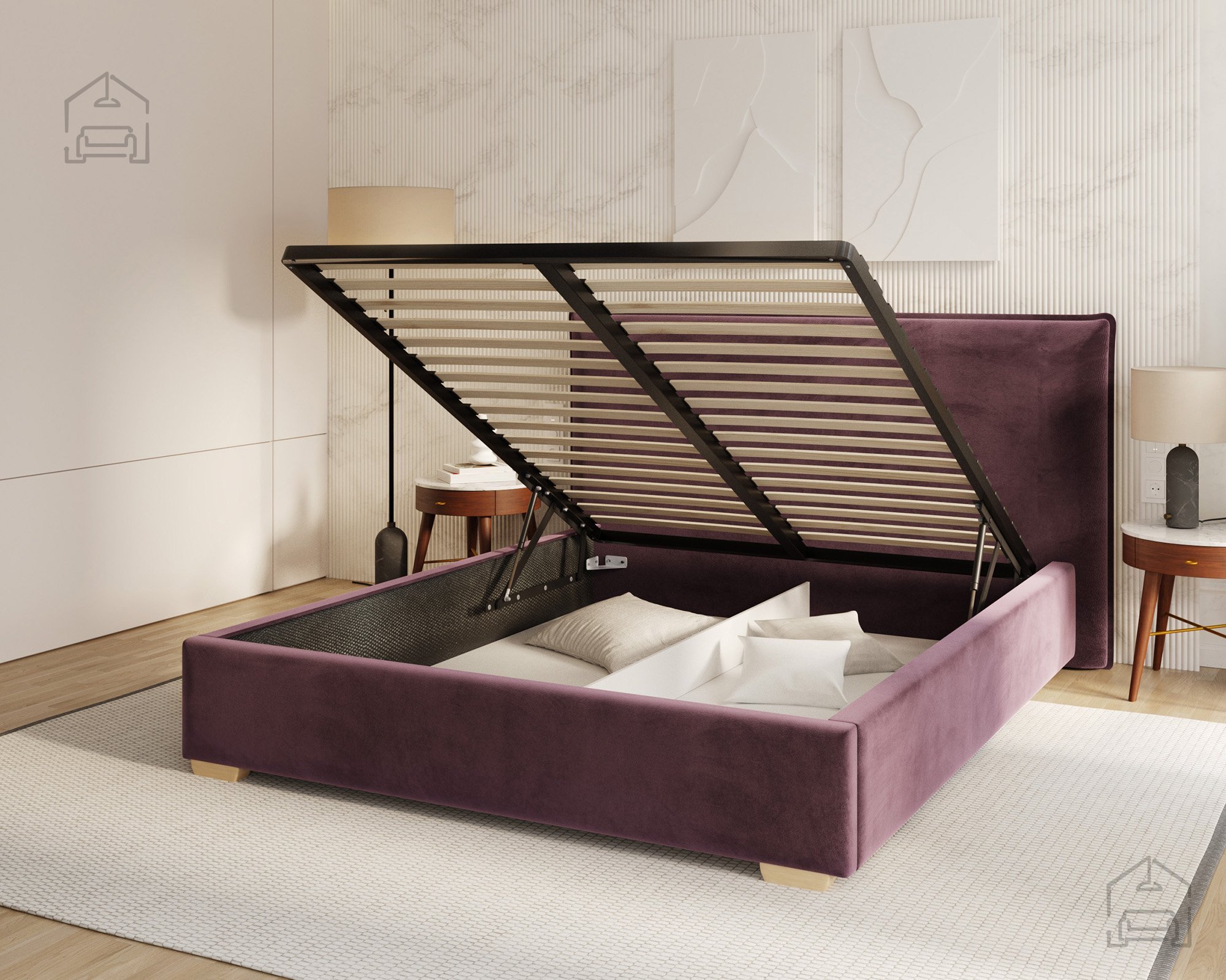 Das Bett mit Hebefunktion Perfetto stammt vom polnischen Hersteller Postelje FDM und vereint praktische Nutzung, elegantes Design und hohen Komfort in einem Produkt. Die durchdachte Konstruktion ermöglicht das bequeme Verstauen von Bettwäsche, ohne dabei den stilvollen Charakter des Schlafzimmers zu beeinträchtigen. Gefertigt aus hochwertigen Materialien – einer Kombination aus T-25-Schaum, Holz und Spanplatte – und bezogen mit dem Stoff Paris Purple, bietet das Bett ein angenehmes Gefühl beim Anfassen und ein harmonisches Erscheinungsbild. Die Liegefläche misst 120x200 cm, die Höhe der Liegefläche beträgt 34,5 cm. Die gesamte Konstruktion (153x218x112 cm) ist stabil, langlebig und dank des integrierten Holz-Hebemechanismus leicht zu bedienen.